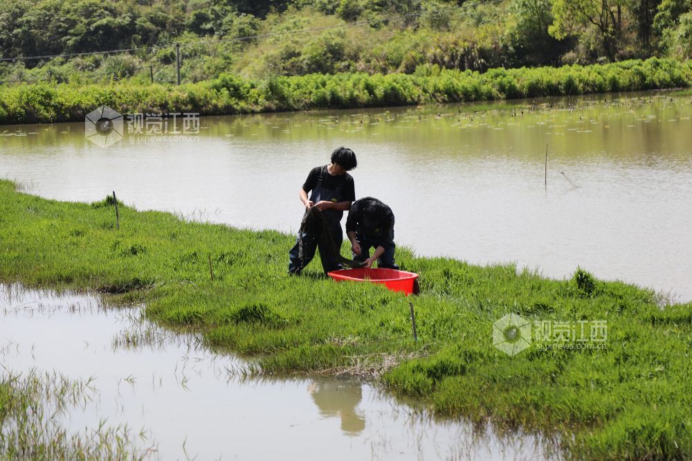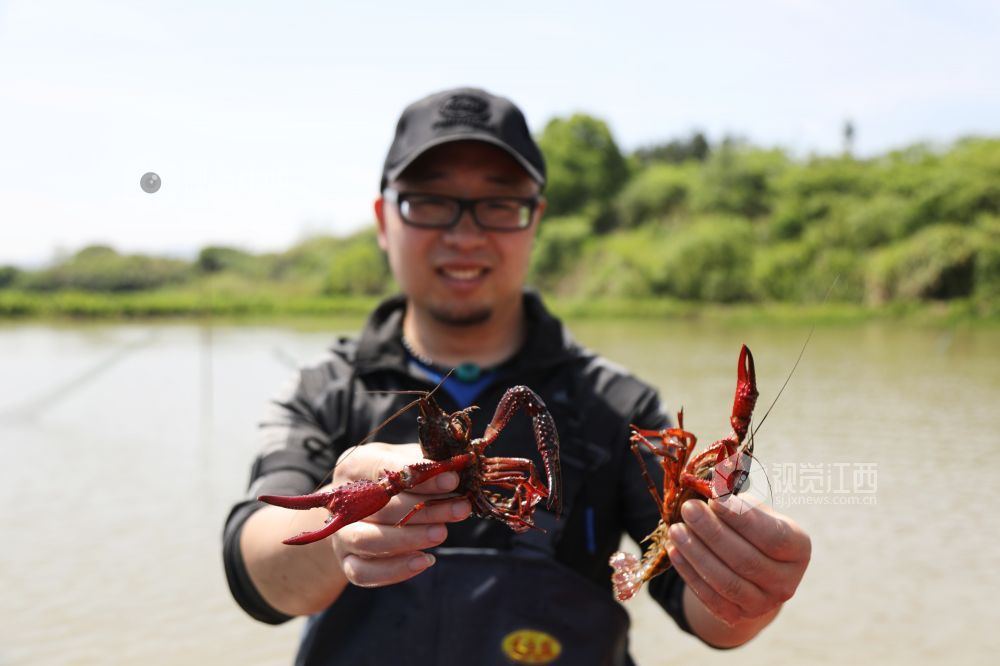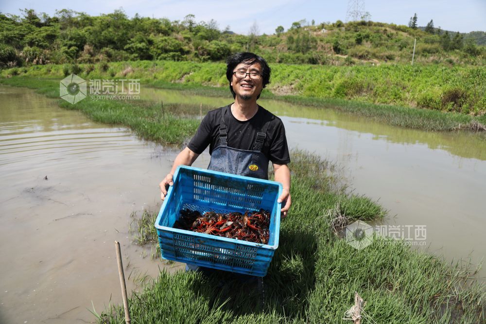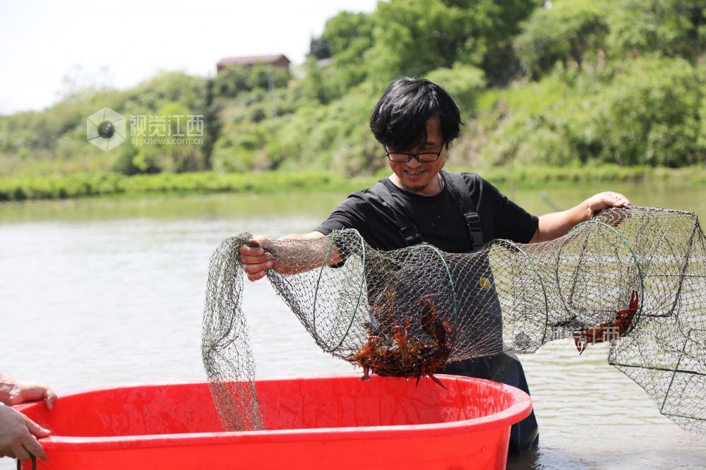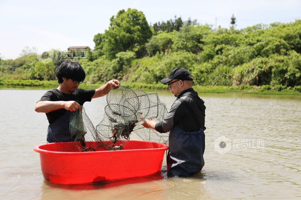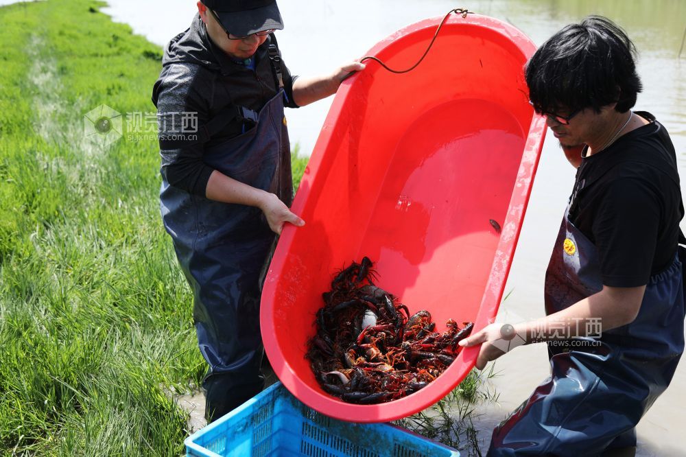 4月21日,江西省莲花县升坊镇太岭村稻虾养殖基地,员工捕捞小龙虾供应市场。