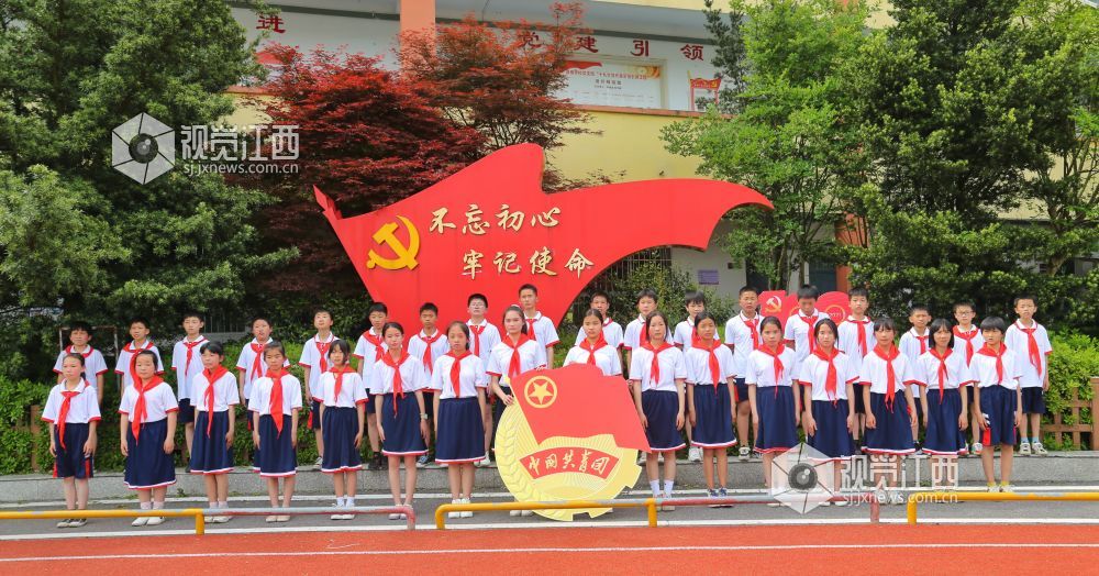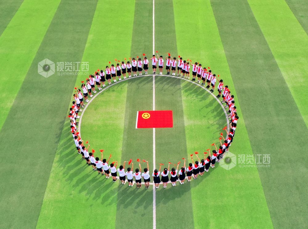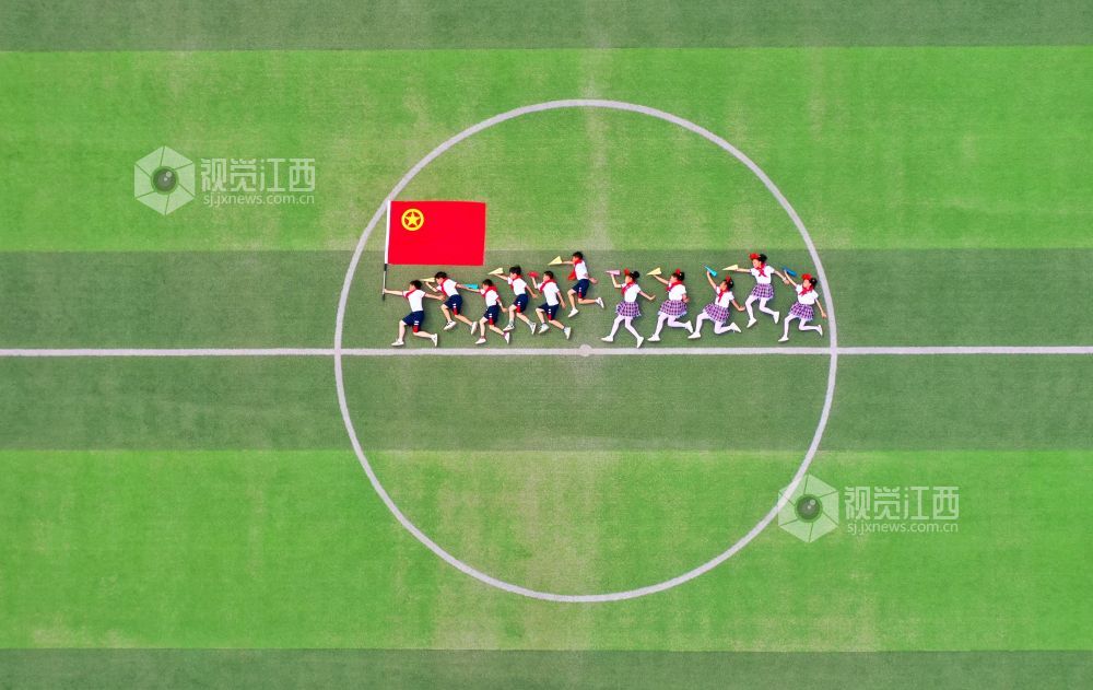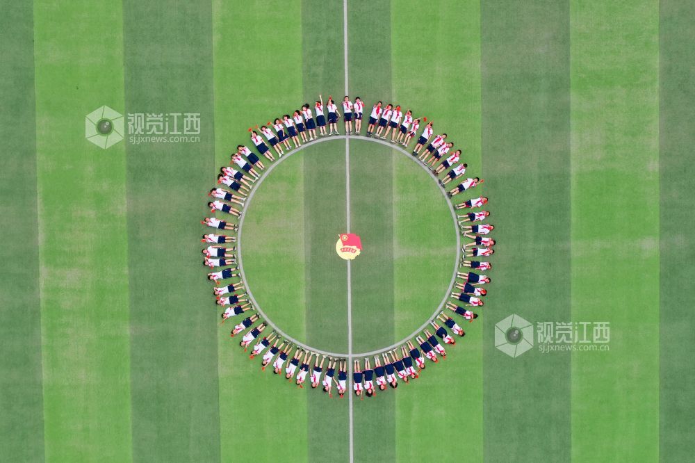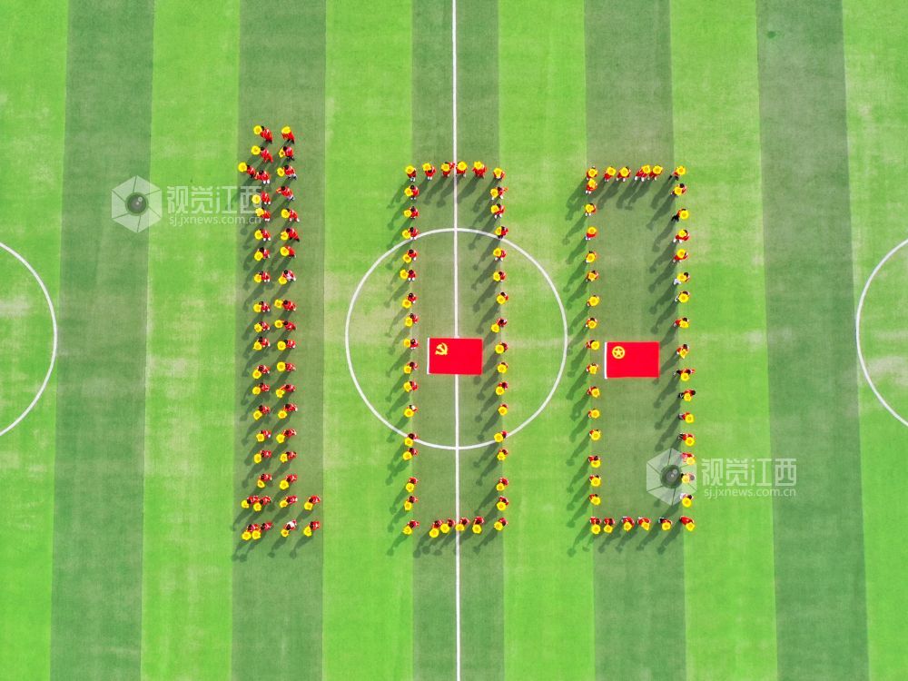 2022年4月21日,在江西省萍乡市芦溪县源南学校操场上,学生摆成各种创意造型与团旗、团徽合影。