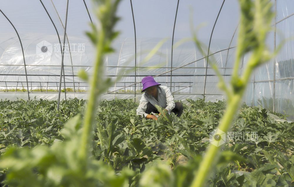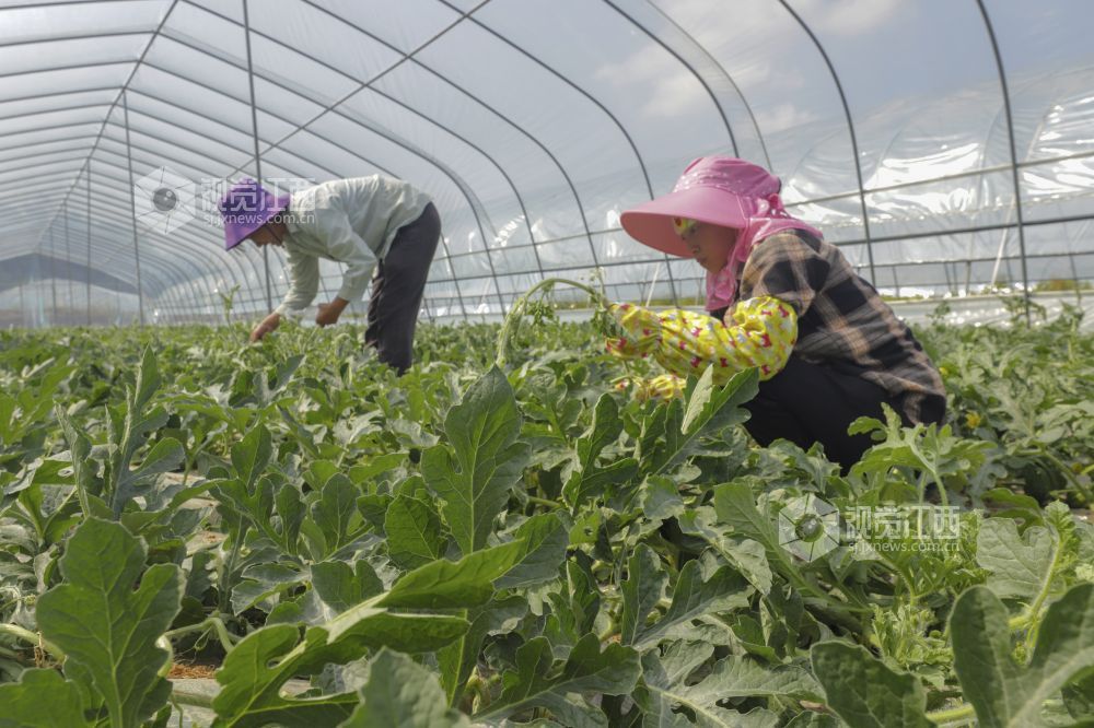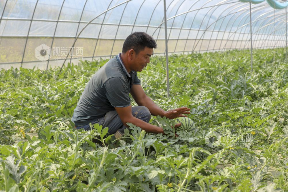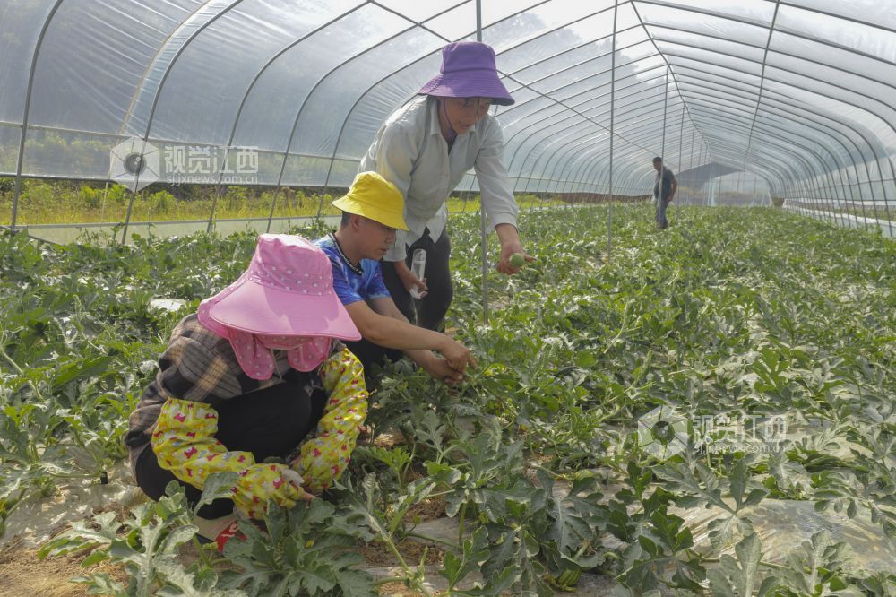 4月24日,江西省湖口县流芳乡联合村集体经济设施蔬菜大棚内,近百亩西瓜长势喜人,瓜农忙着打枝、授粉、疏果、追施液态肥,一派火热的劳动场景。