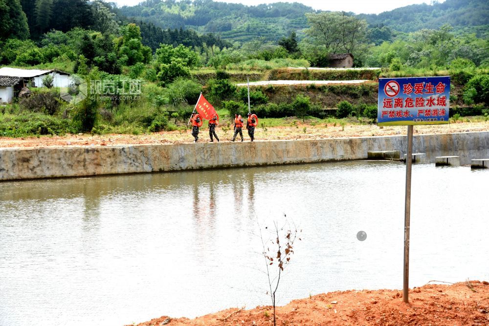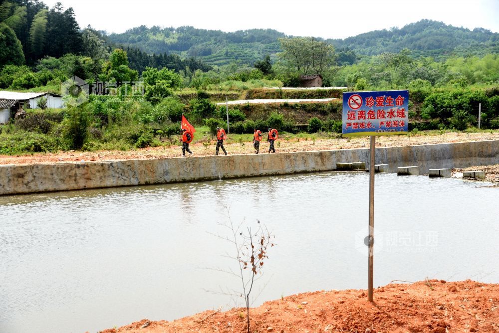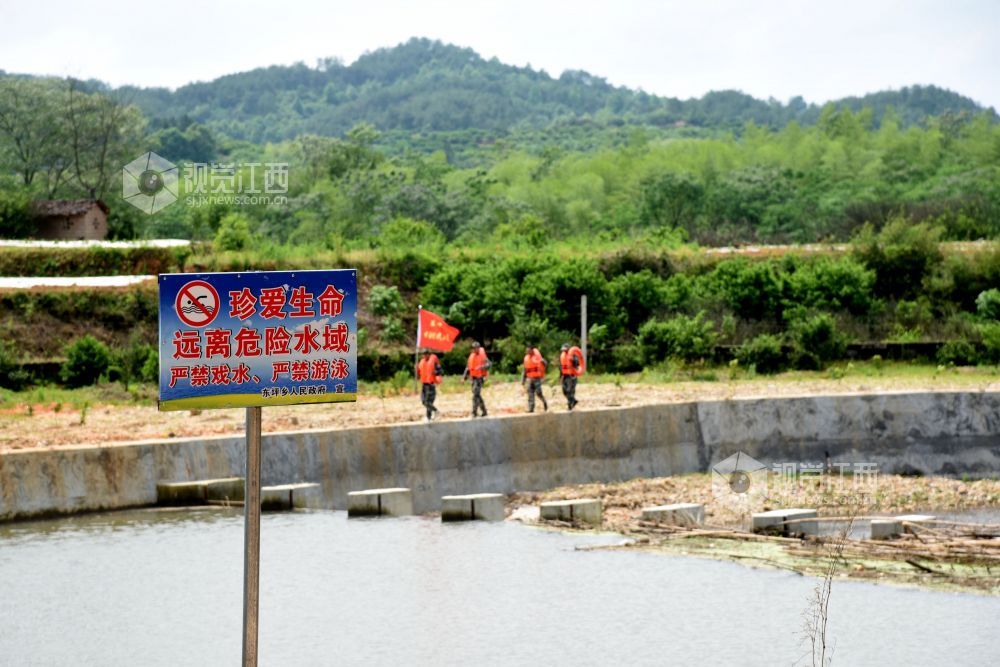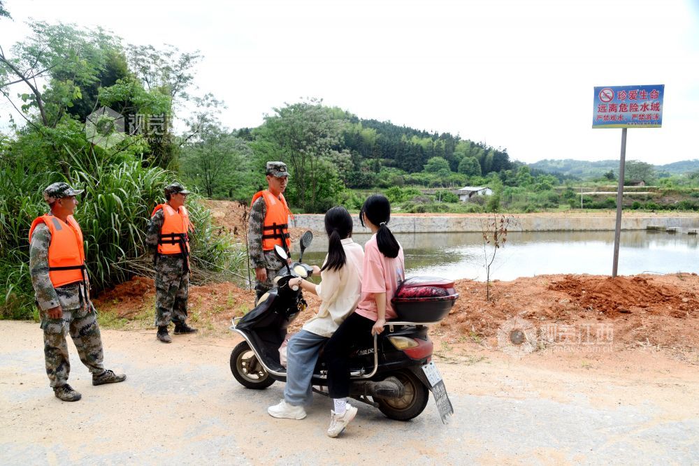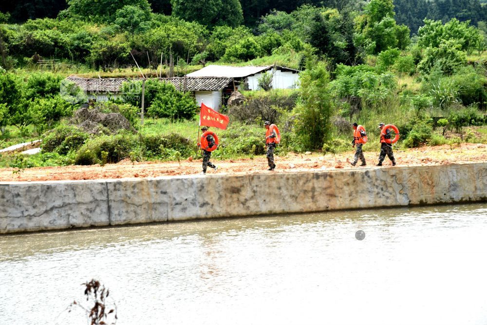 2022年4月25日中午,江西省抚州市南丰县东坪乡“彭武水”河段,“迷彩服”防溺水志愿者在巡河,确保青少年学生安全。