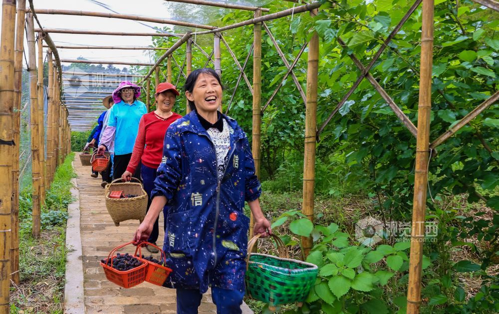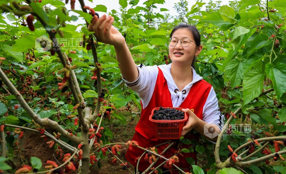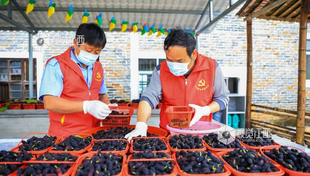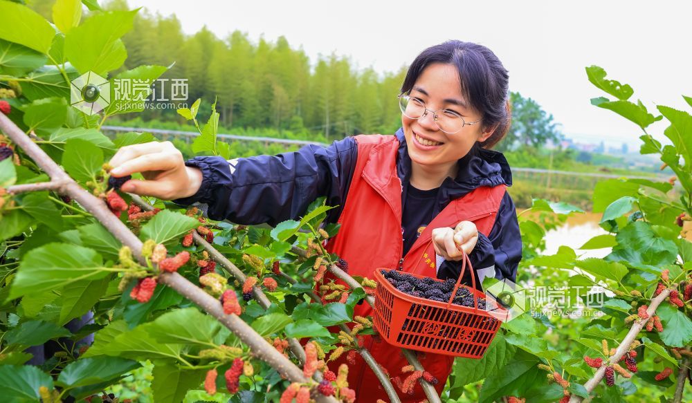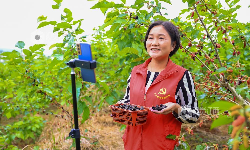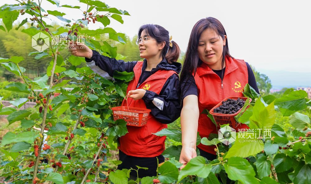 2022年4月27日,江西省瑞昌市横港镇清湓村桑果园内,助农志愿者正在帮助采摘桑葚,并通过网络直播平台推销。