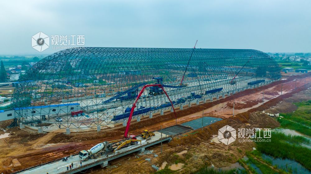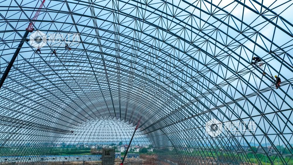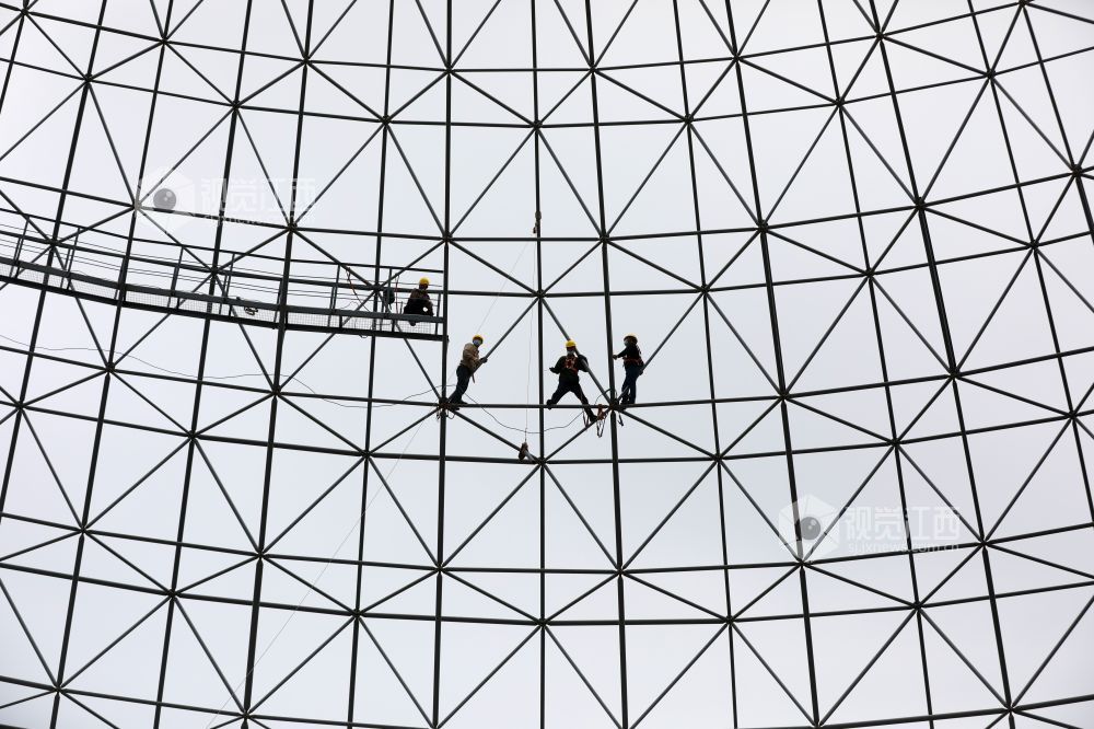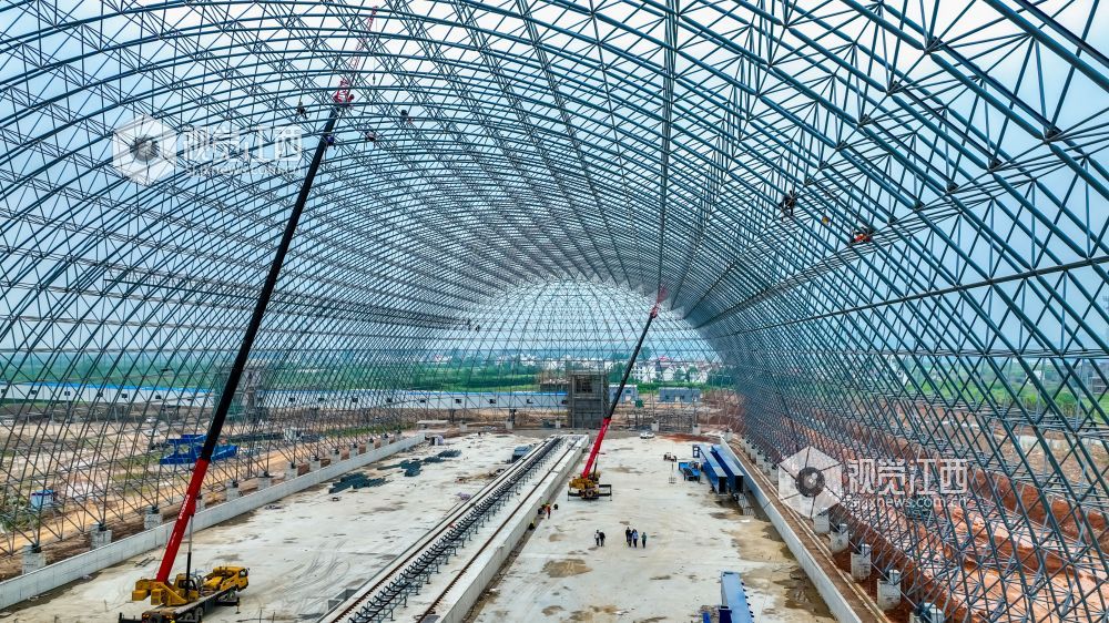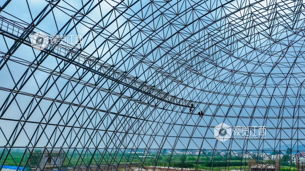 2022年4月27日,江西省九江市柴桑区赤湖作业区公用码头散货胶囊仓库工地上,工人在钢结构网架上组装施工。