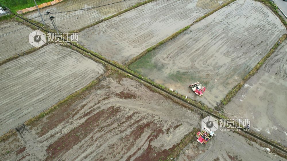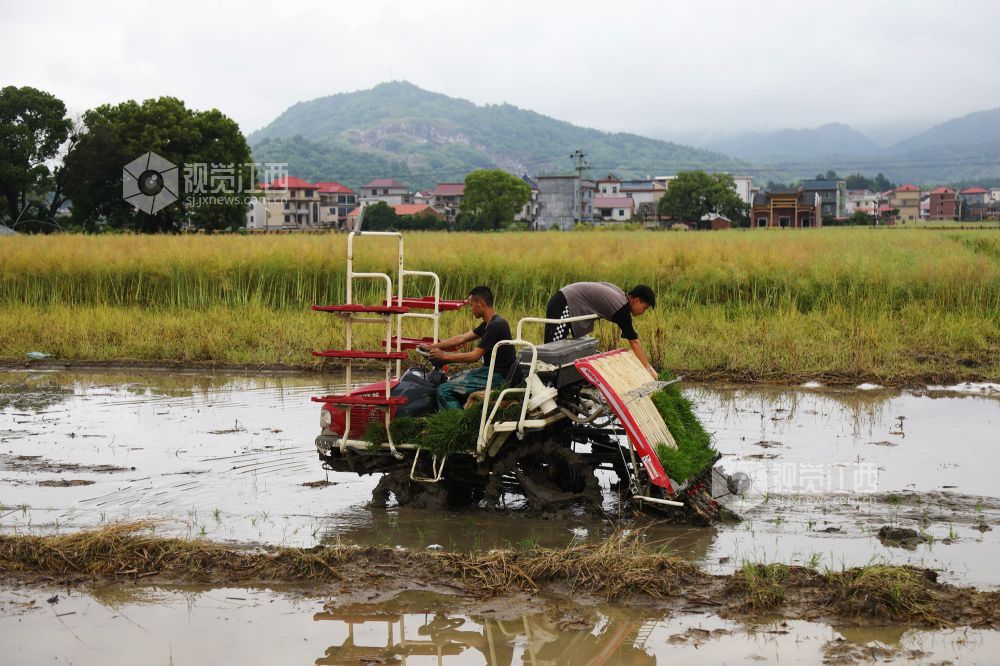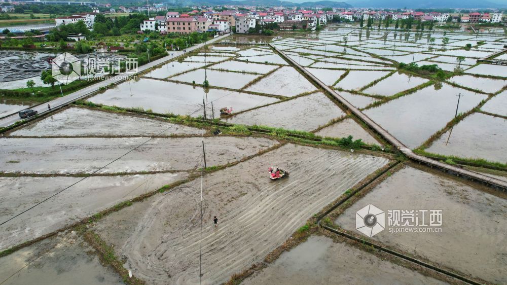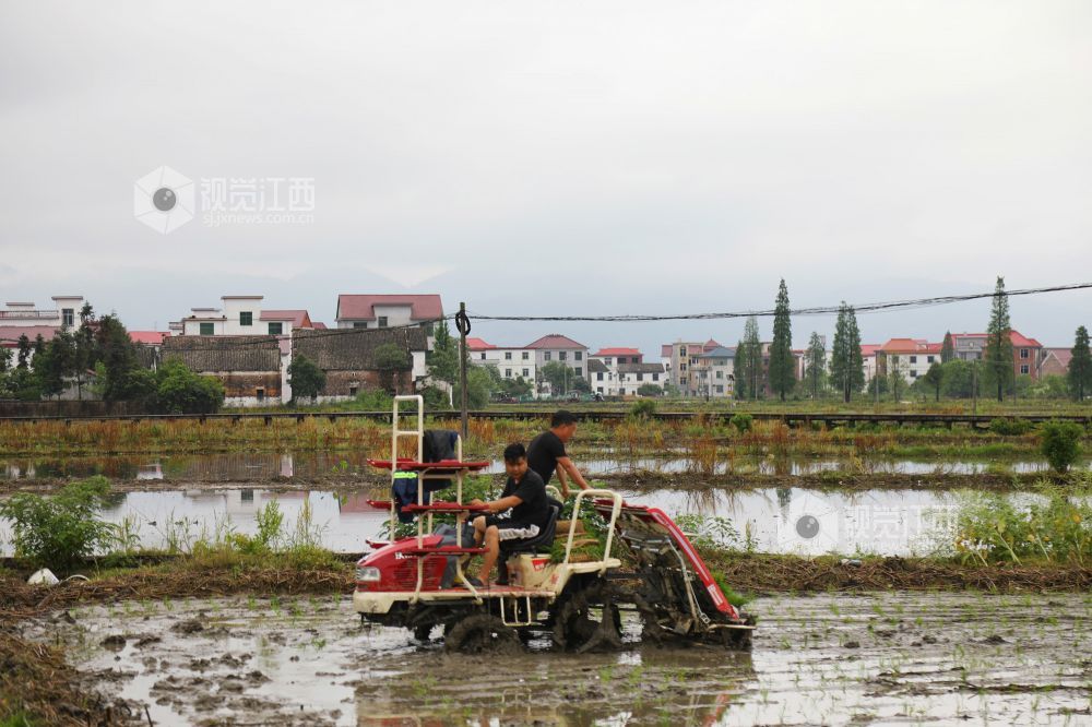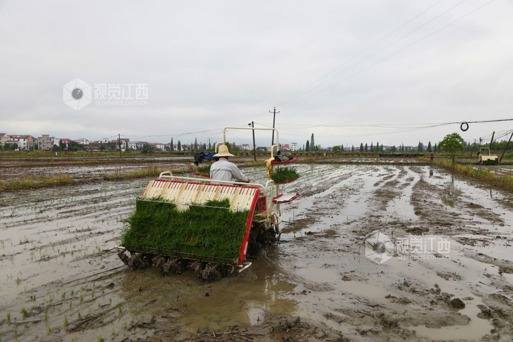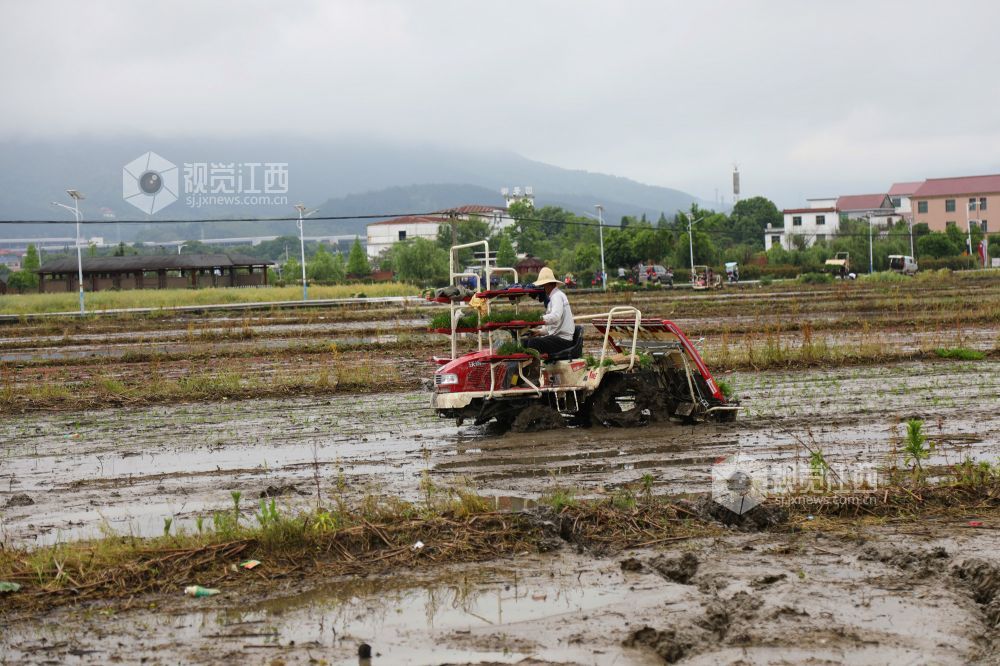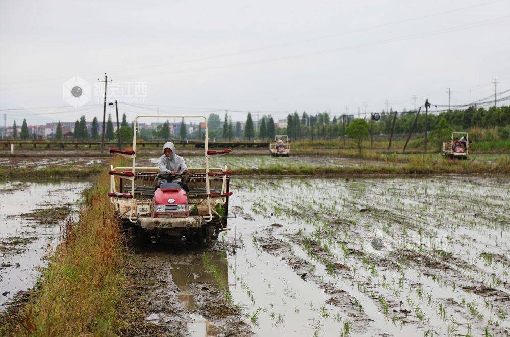 4月28日,江西莲花县琴亭镇莲花村田垄,6台插秧机在田间来回穿梭,把一行行秧苗整整齐齐的插在整好的田块里。
