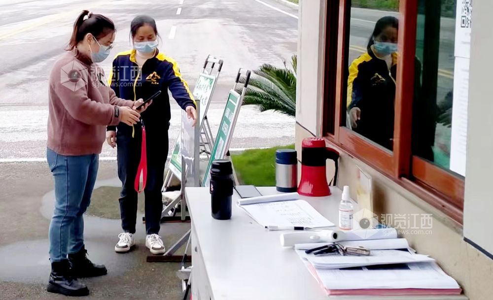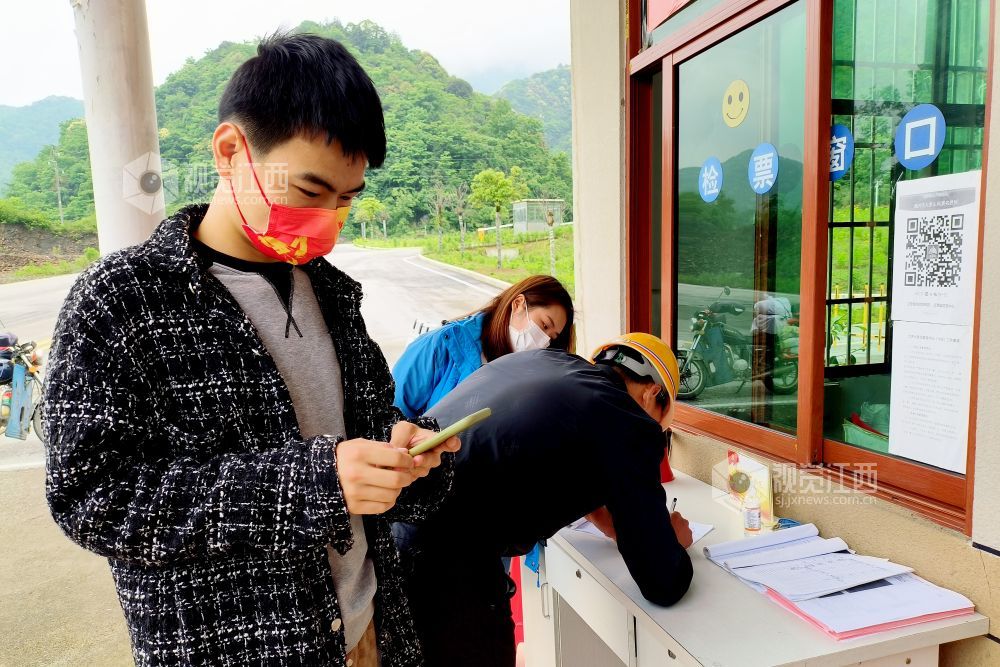5月1日,江西省德兴市大茅山旅游景区工作人员正在对进入景区的本地游客进行严格的扫码登记。