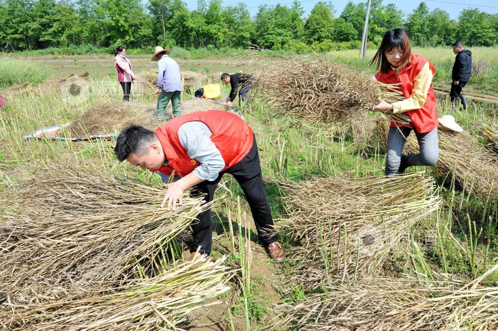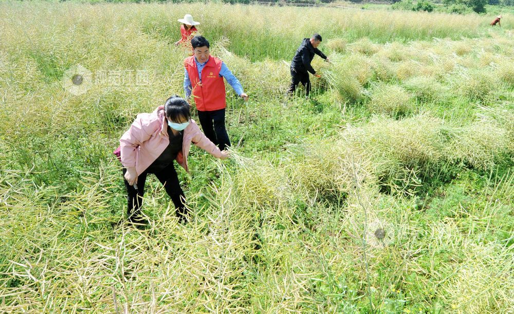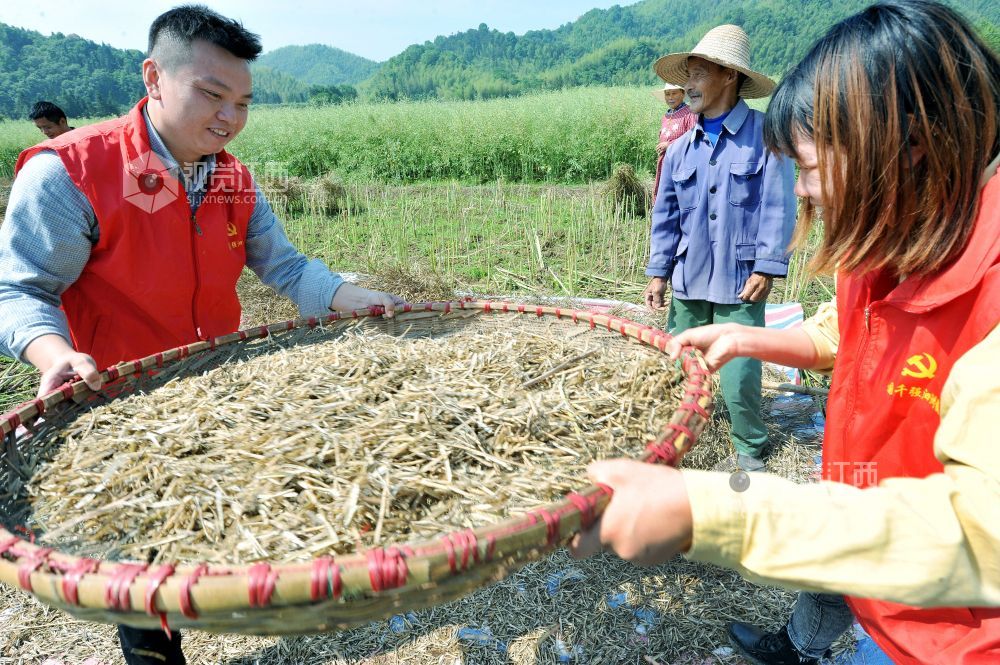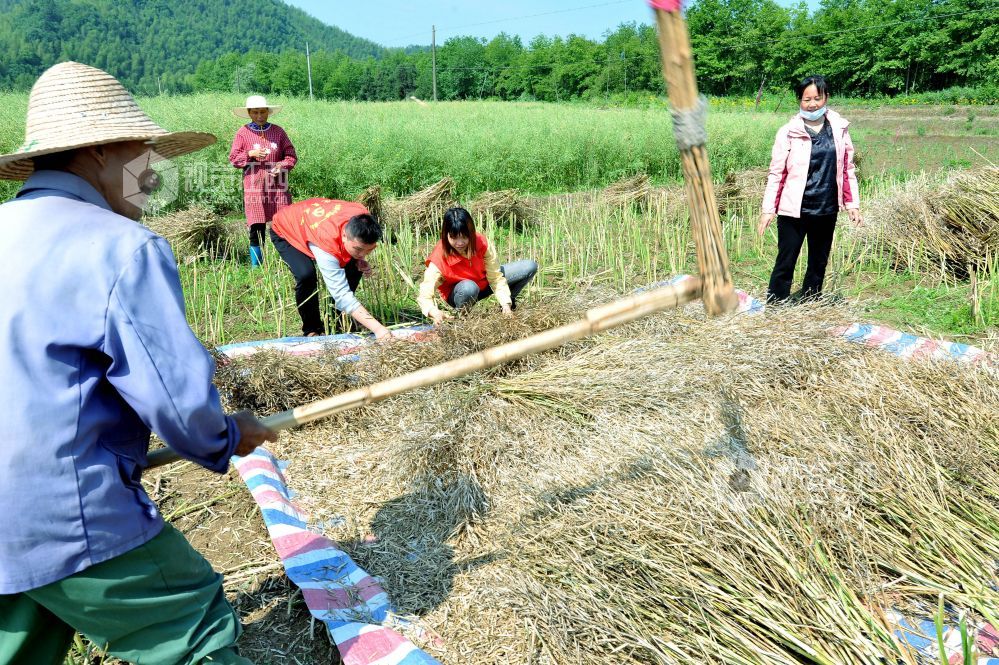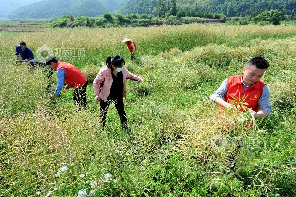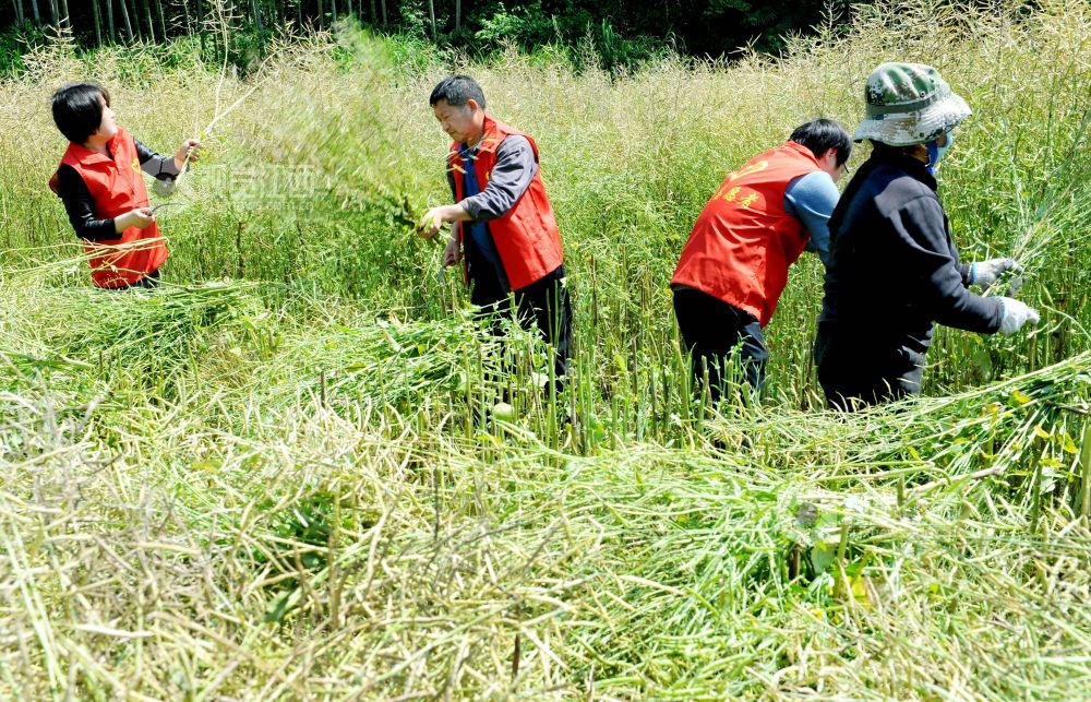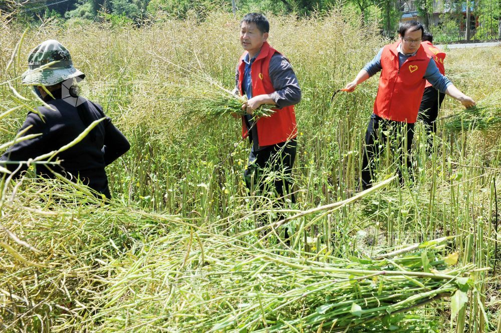 2022年5月4日,江西省德兴市泗洲镇党员义工利用五一假日时间来到该镇立新村,义务帮助农民收割油菜。