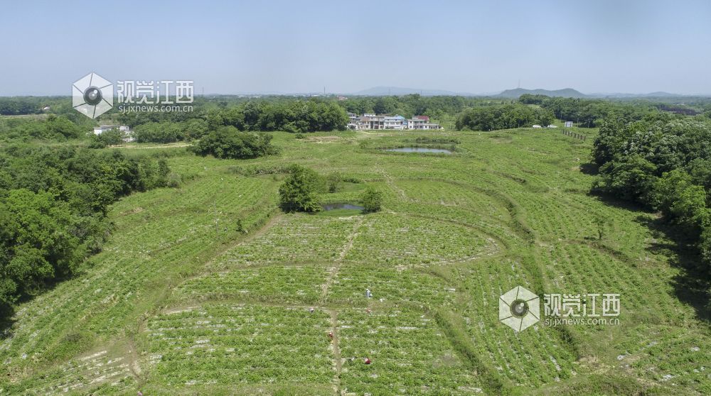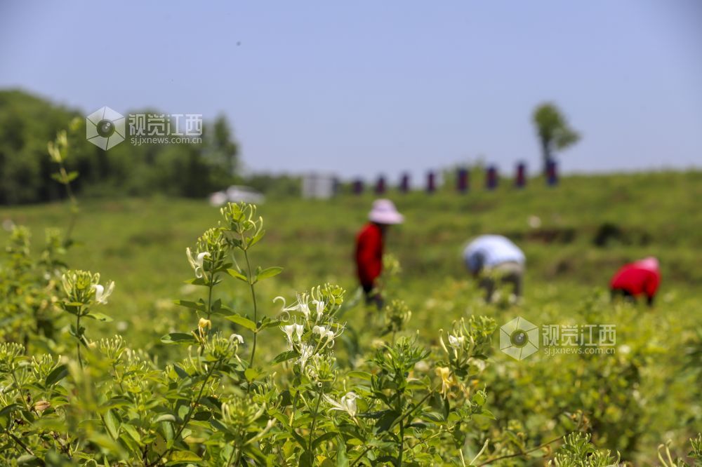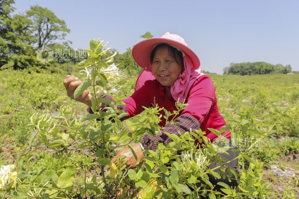 5月5日,时令立夏,江西省湖口县城山镇辕门村集体经济产业基地,300余亩金银花正值花期,村民们忙着采摘。