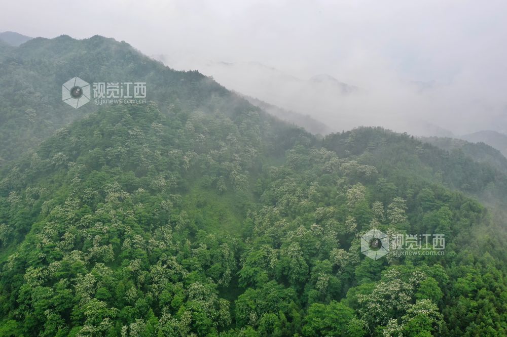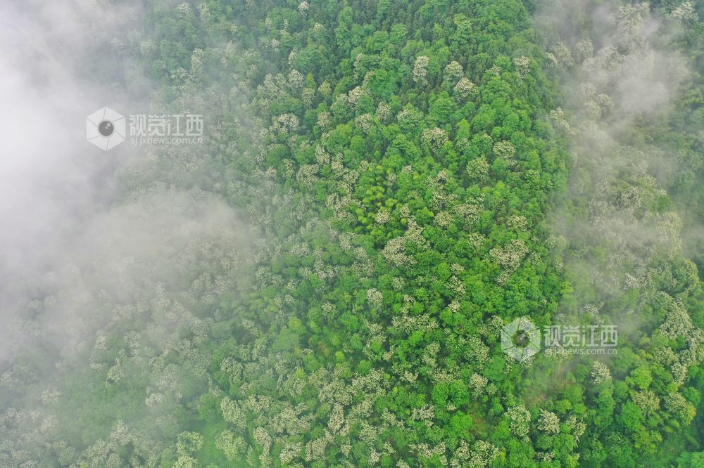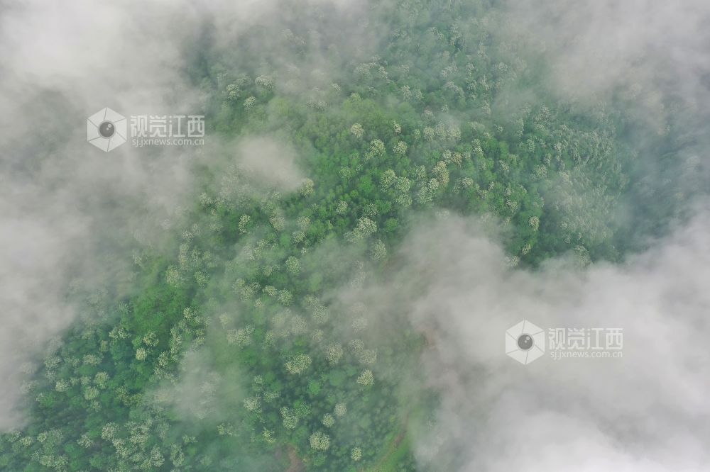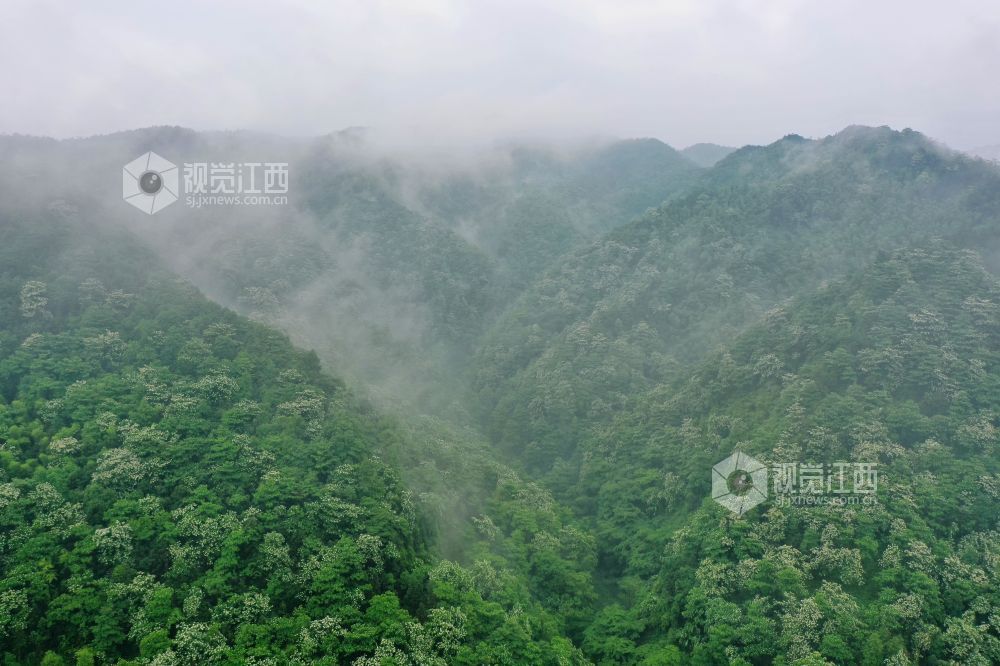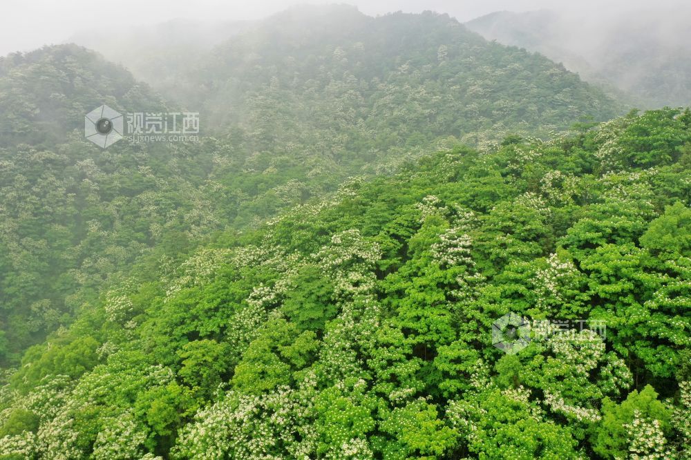 2022年5月8日,雨后的江西省萍乡市芦溪县芦溪镇山下村、高楼村一带万亩野生桐花竟相盛开,洁白的桐花在山间云雾间若隐若现,散发着淡雅的清香。
