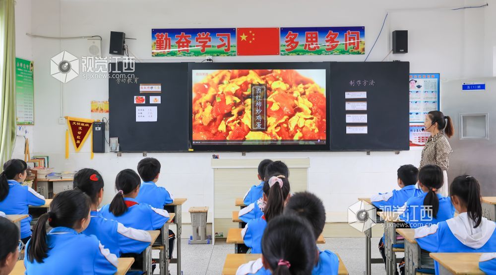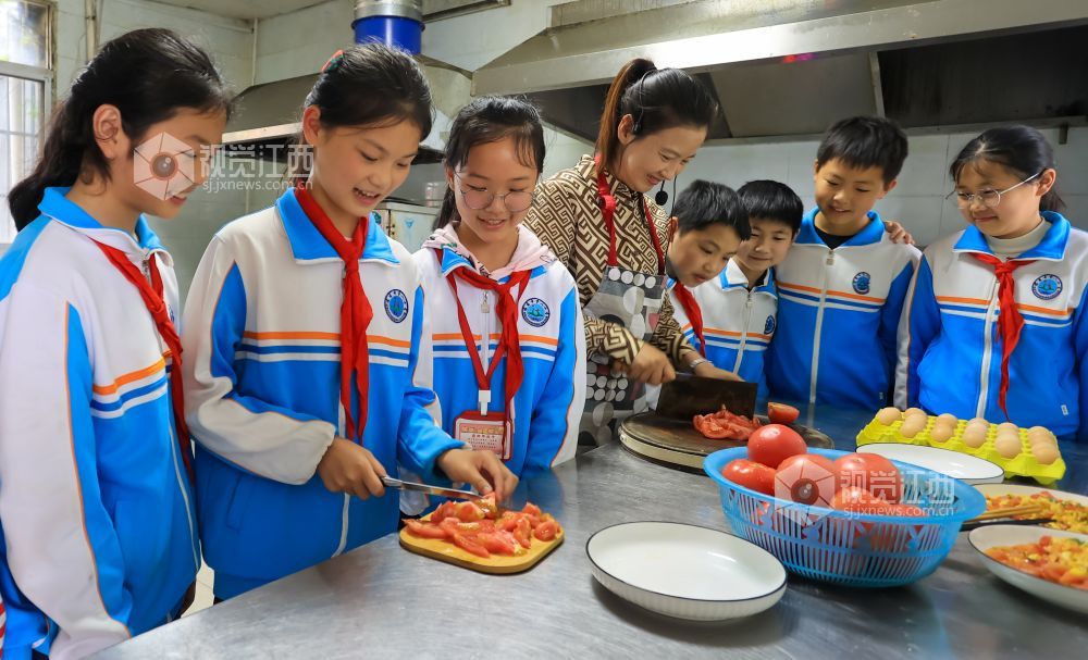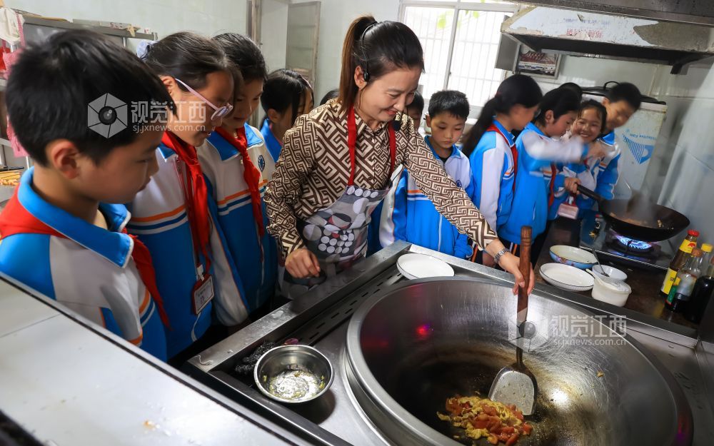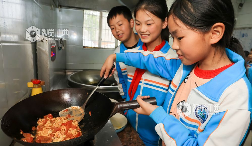 2022年5月9日,江西省瑞昌市第八小学的学生在老师的指导下学习炒菜和手工制作。