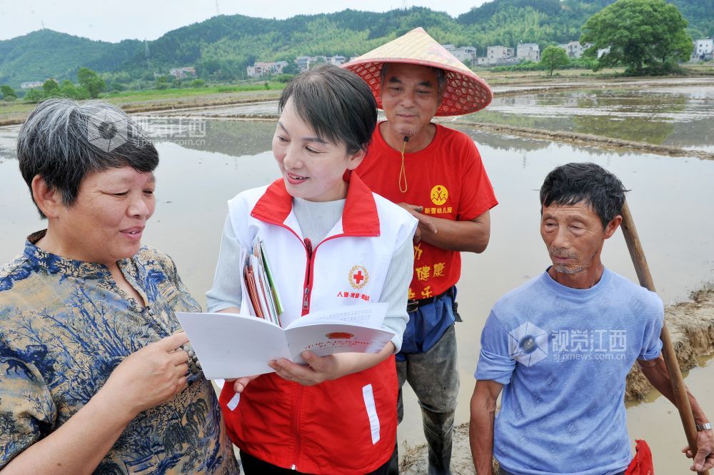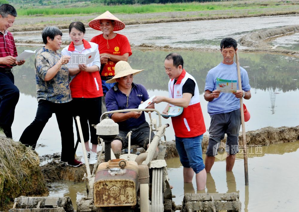 2022年5月8日,江西省德兴市红十字会工作人员来到该市新营街道一村田间地头,给正在春耕的农民大哥宣讲有关红十字“三献”教育知识。