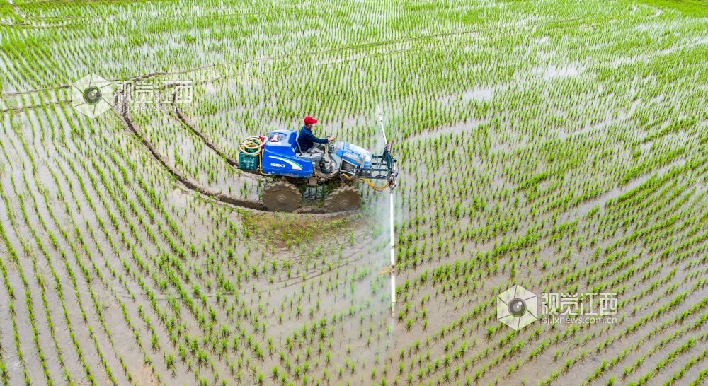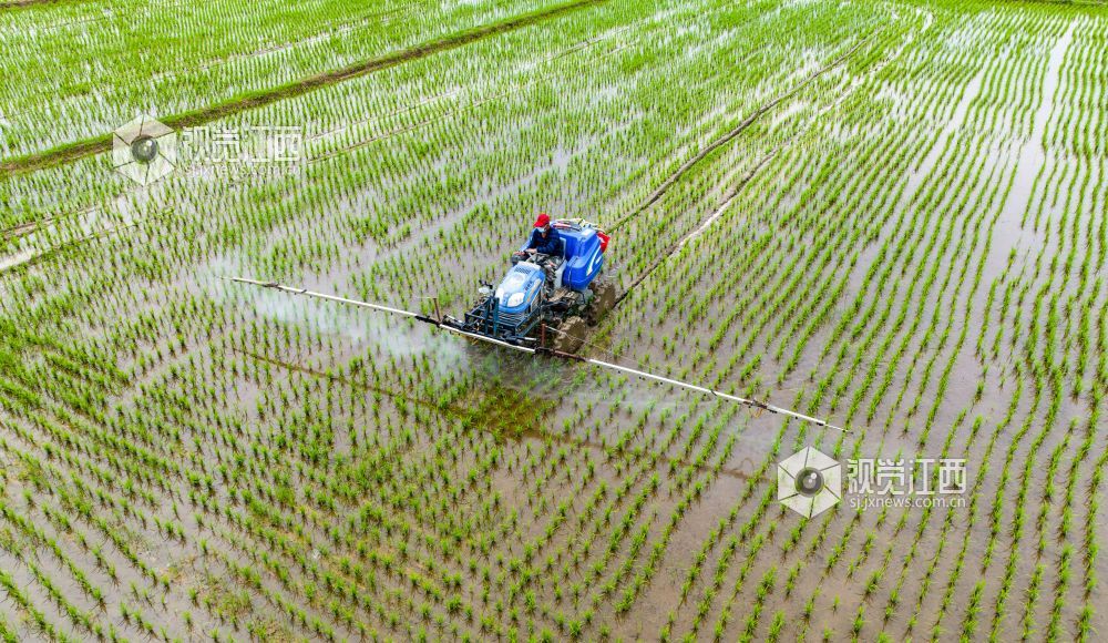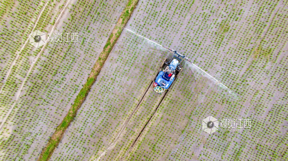 2022年5月18日,江西省瑞昌市碧野农机专业合作社农机手驾驶大型农药喷雾机在田间给早稻禾苗杀虫。