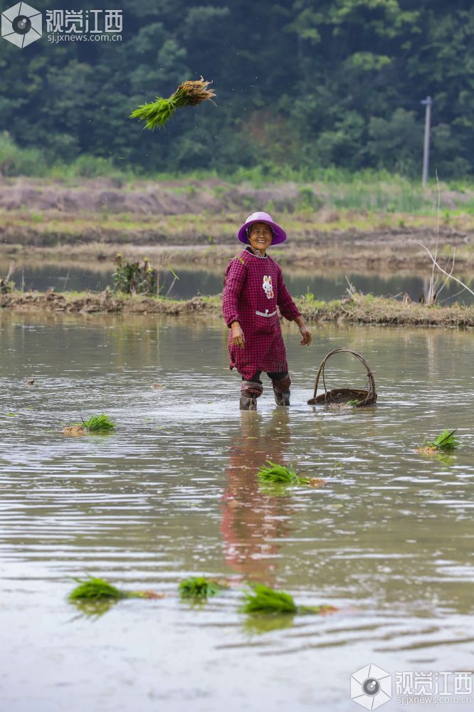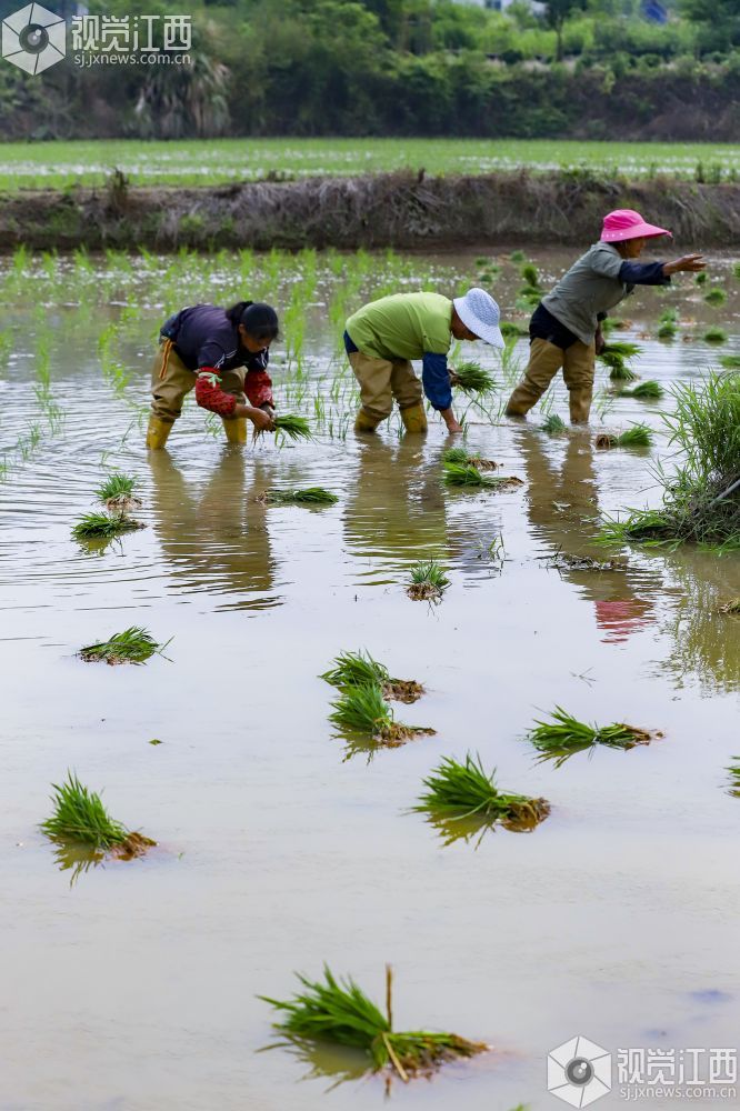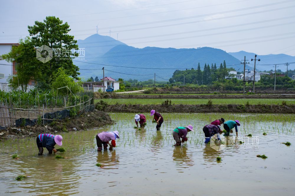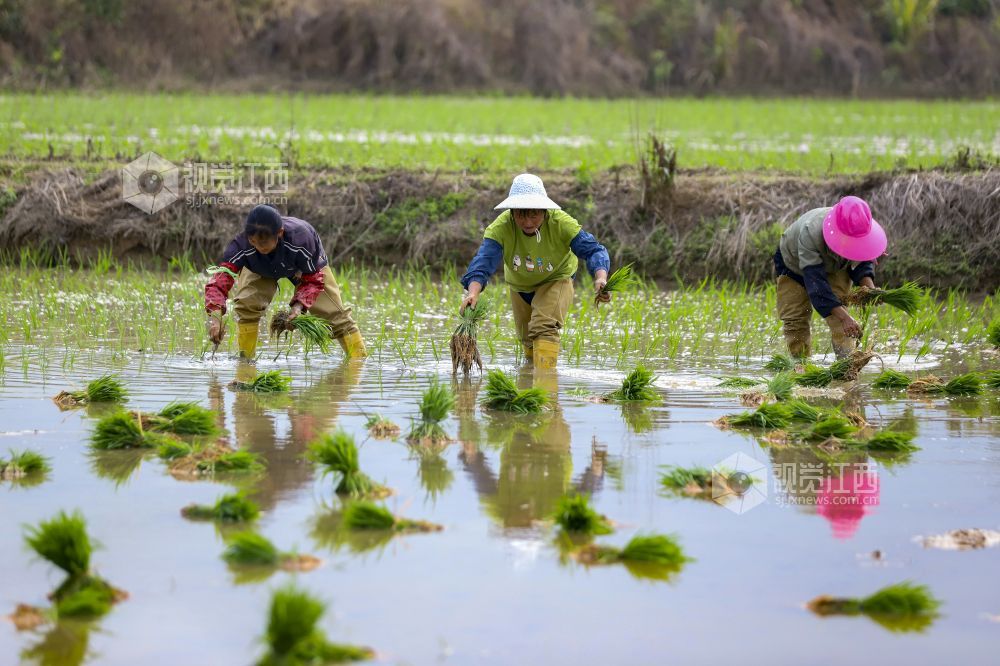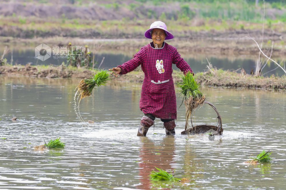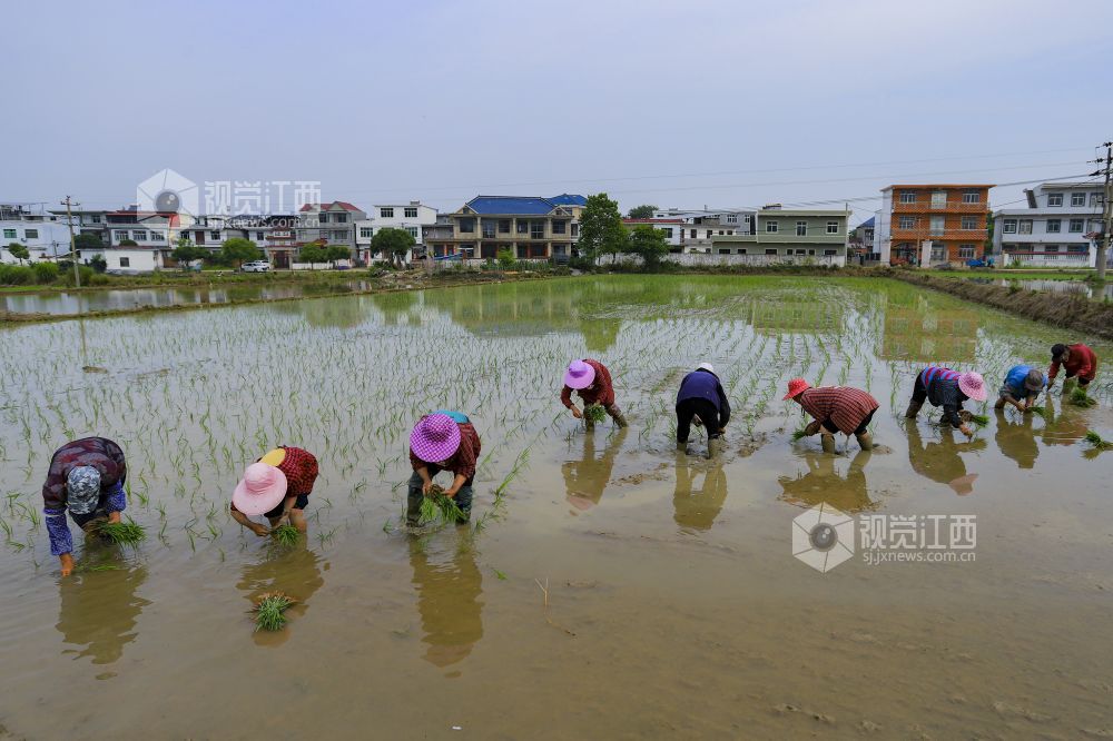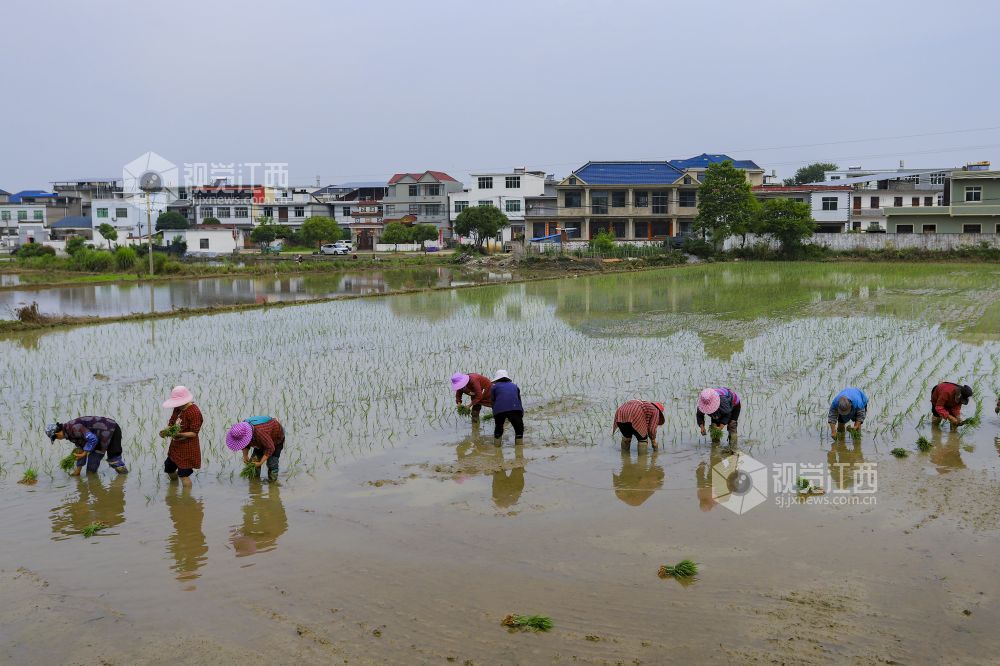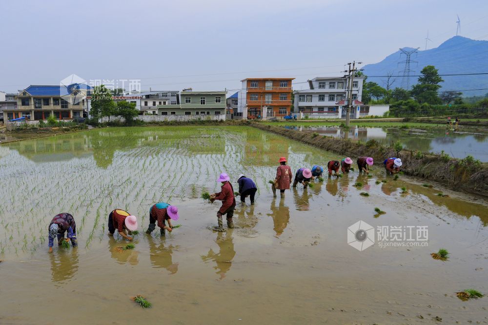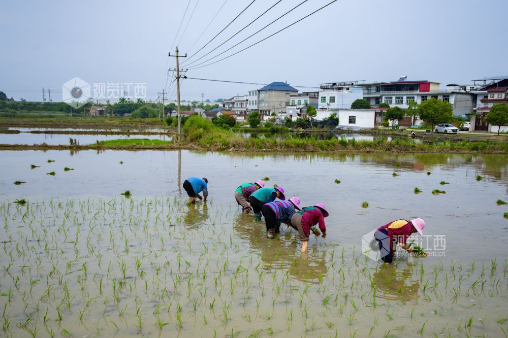 2022年5月22日,江西省九江市湖口县武山镇村民正在栽插中稻秧。今年,湖口县中稻播种面积达8.5万亩,预计年产量达7500余万斤。