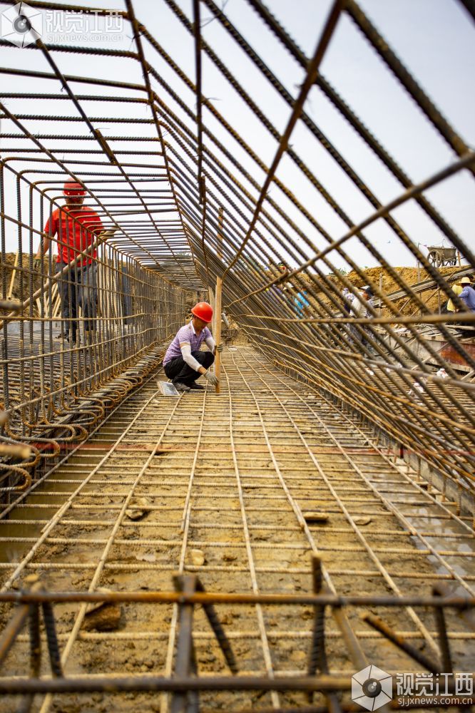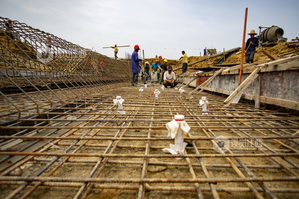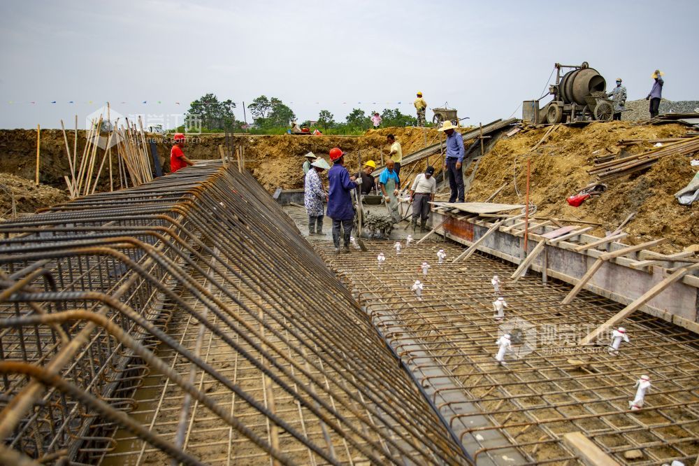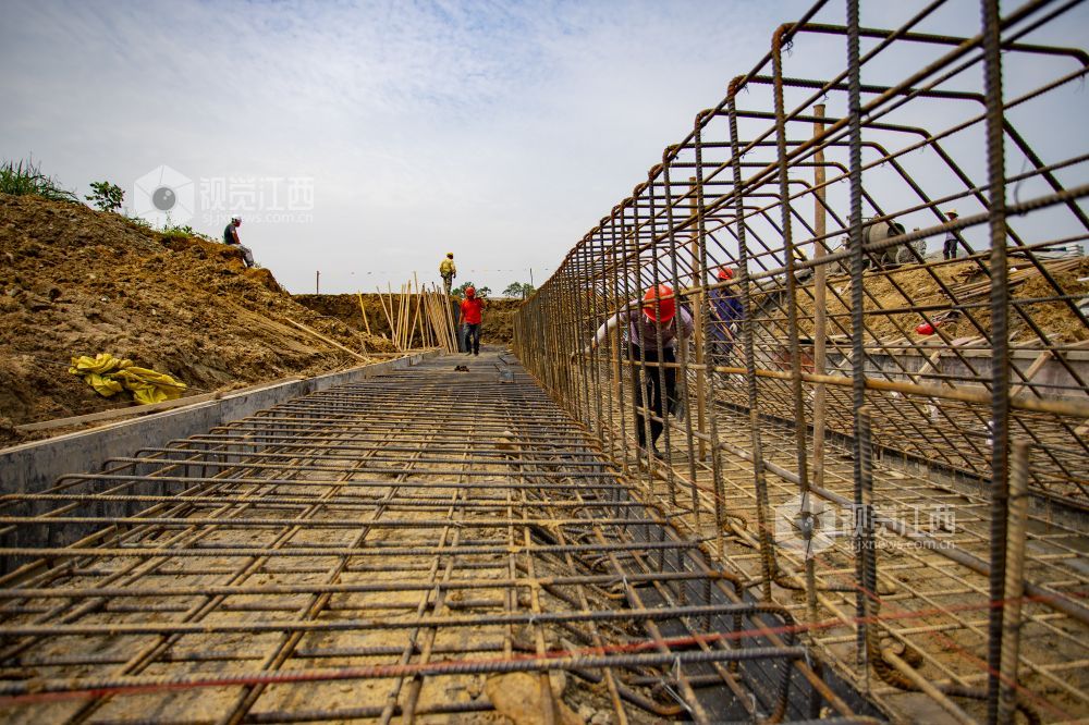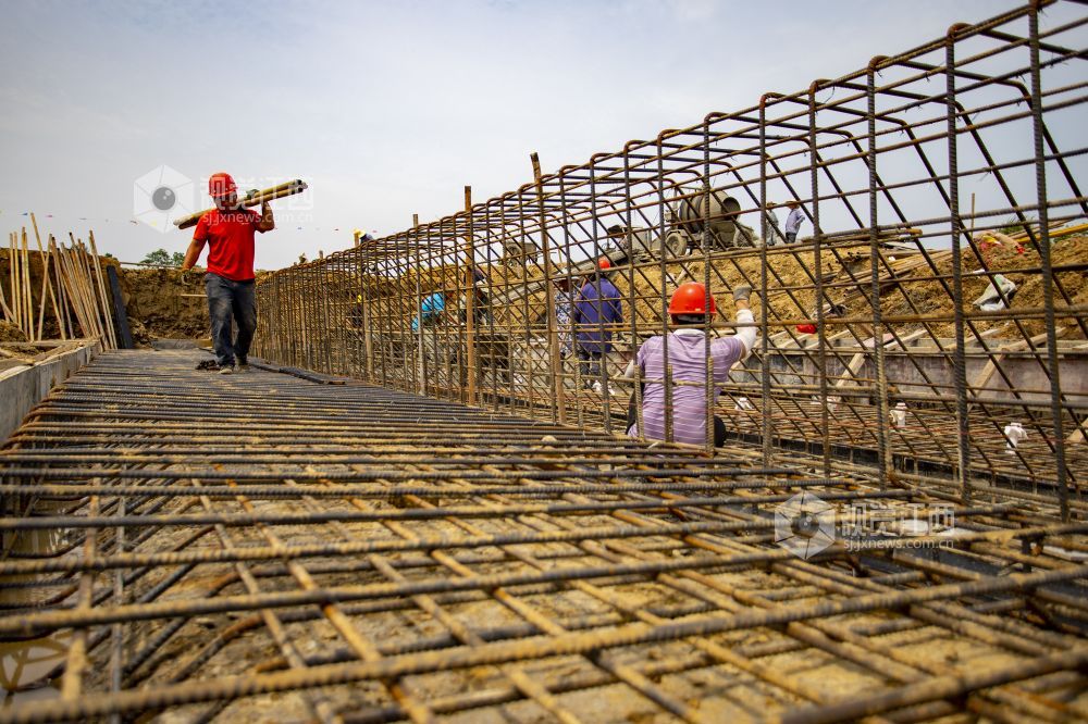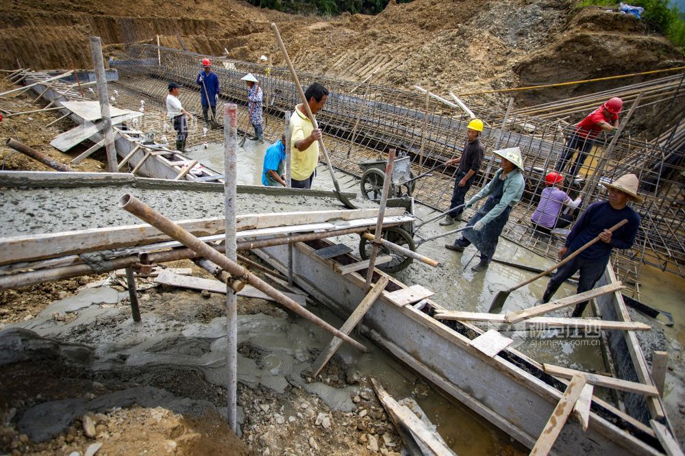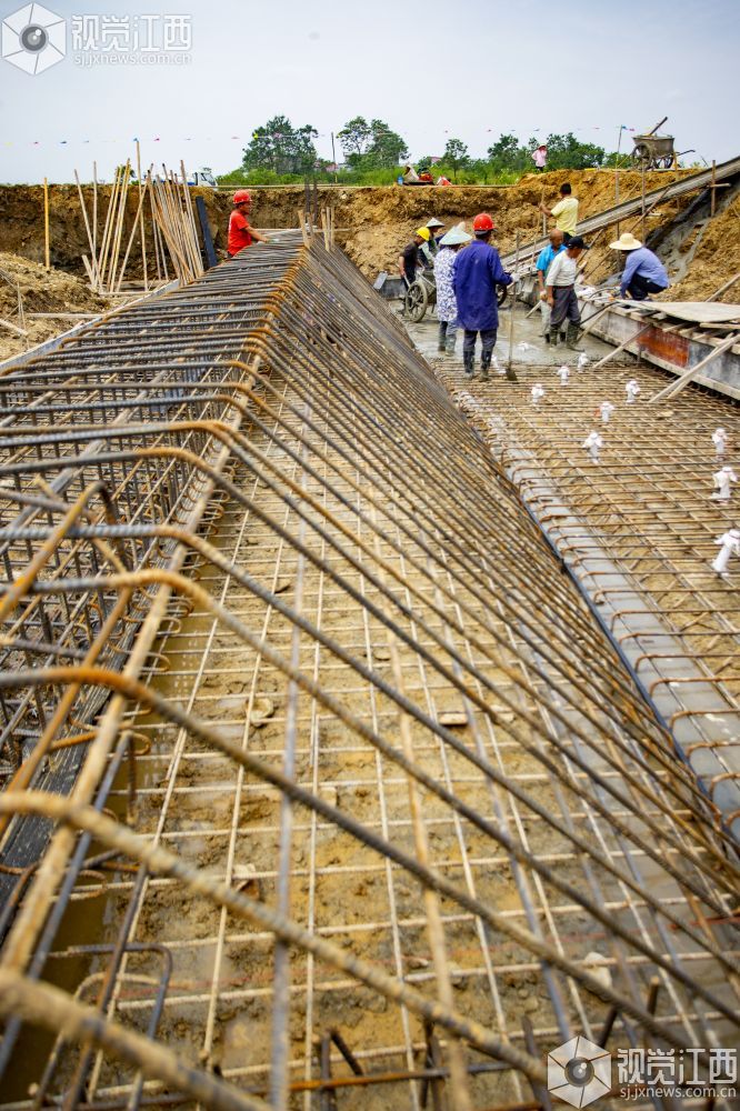 2022年5月22日,江西省九江市湖口县水利部门正在国家水土保持重点工程武山镇小流域治理项目现场,对改建的拦沙堰基础进行浇筑作业。当前,天气晴好,湖口县水利部门加强调度,强化保障,加快推进项目建设,施工现场一派繁忙。