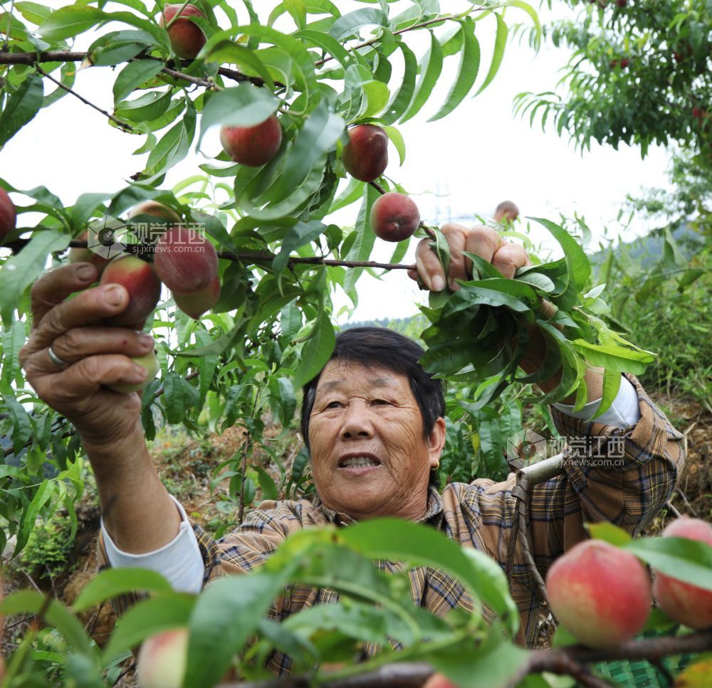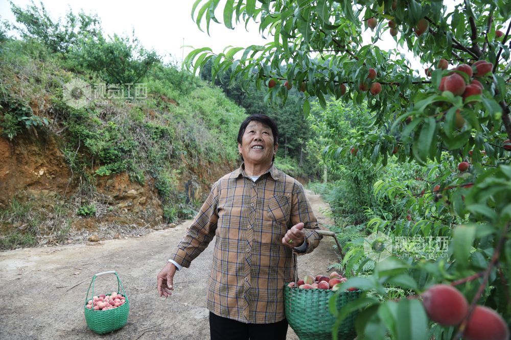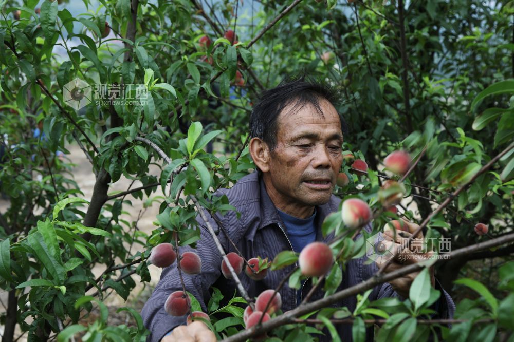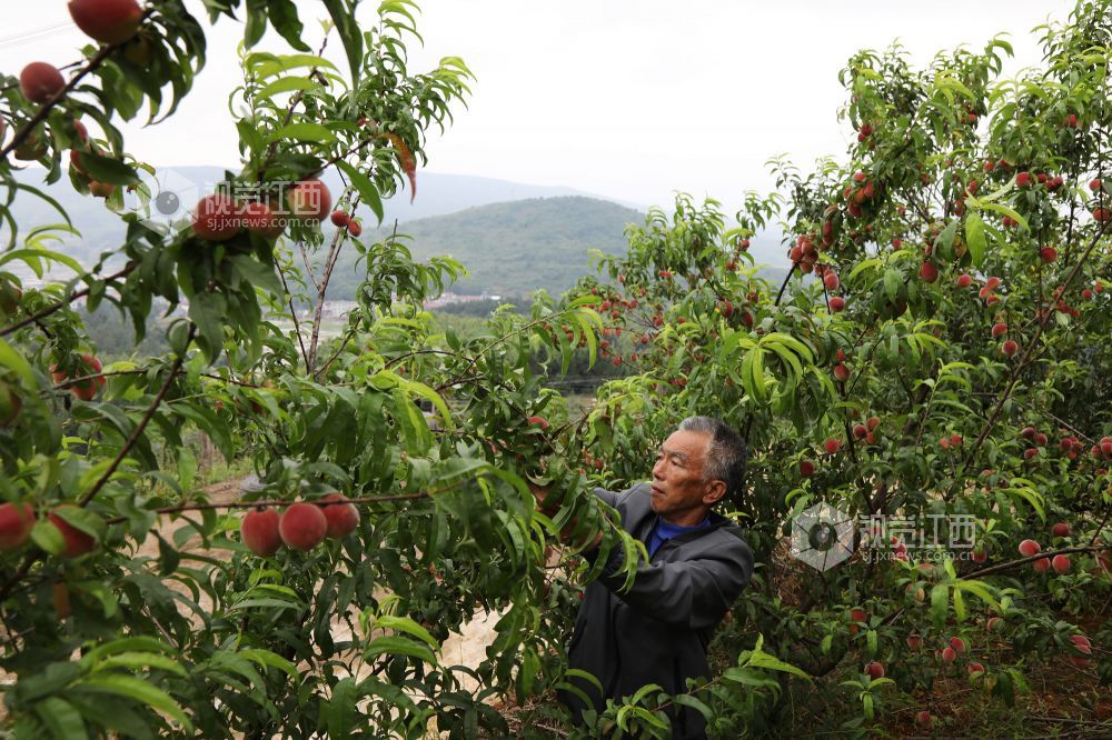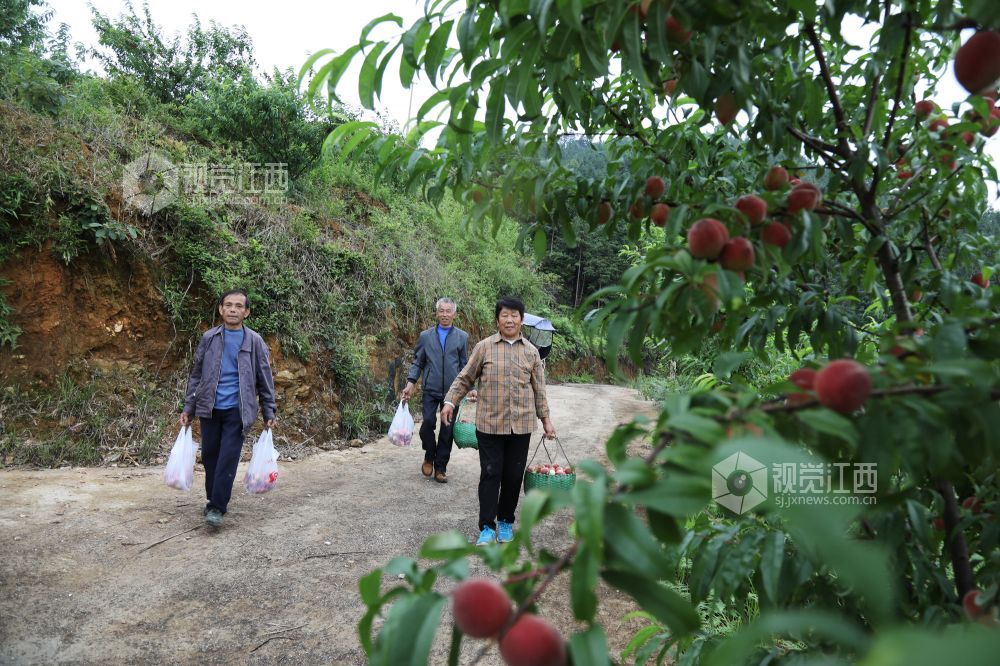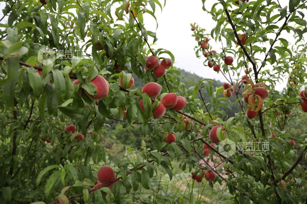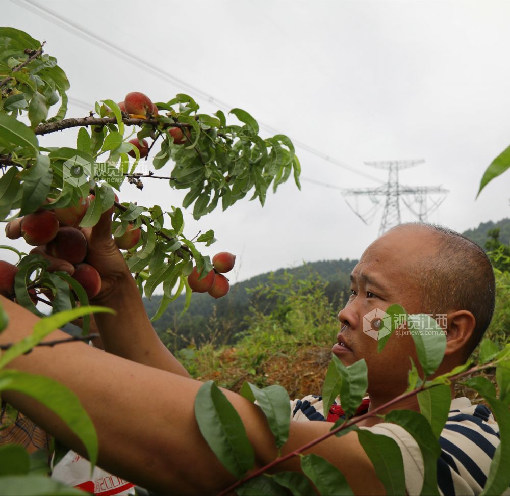 5月26日,江西省莲花县闪石乡太源村碧塘综合种养基地,桃树枝上挂满了红彤彤的美国红桃,村民抓住晴好天气忙着采摘。