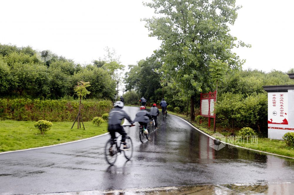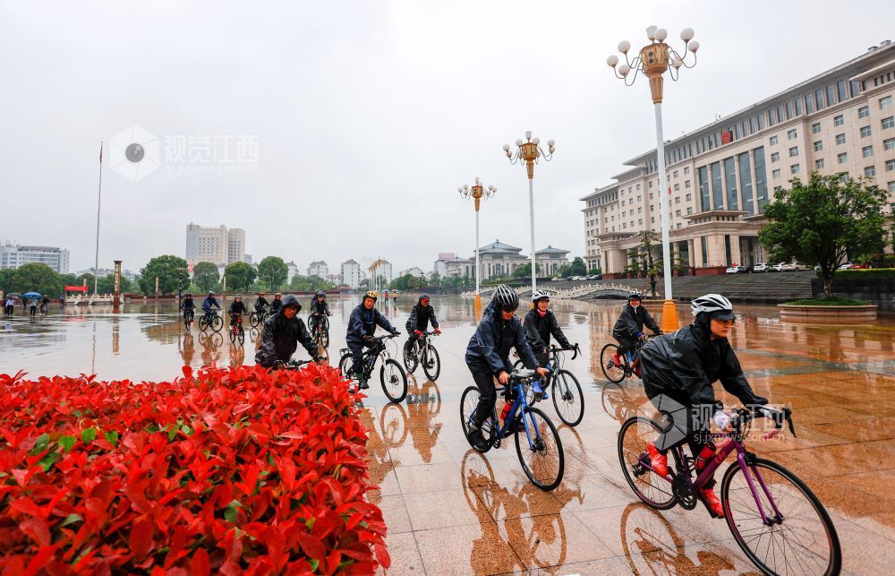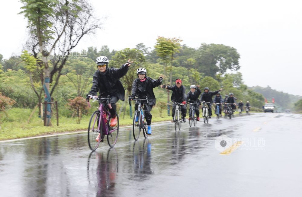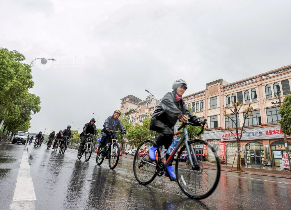 2022年5月28日,江西省九江市湖口县自行车爱好者冒雨骑行,沿途向群众宣传绿色环保理念,倡导健康低碳出行生活方式。