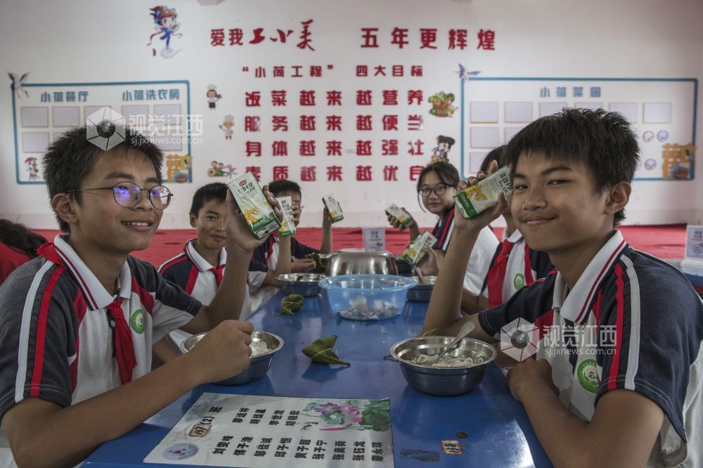 5月31日早上7点20分,在江西省新余市仙女湖区观巢小学的“小荷食堂”,学生们正开心地享受着学校统一安排的营养早餐。每人一碗米粉、一杯牛奶、一个鸡蛋、一个粽子,学生们能吃上美味的营养餐得益于新余市实施的小荷工程。