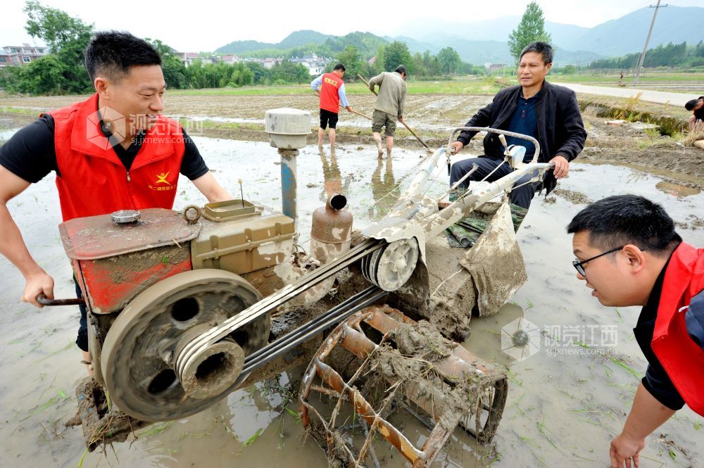 2022年5月31日,江西省德兴市饶二镇党员义工在该镇付家墩村帮助农户维修正在农耕拖拉机。