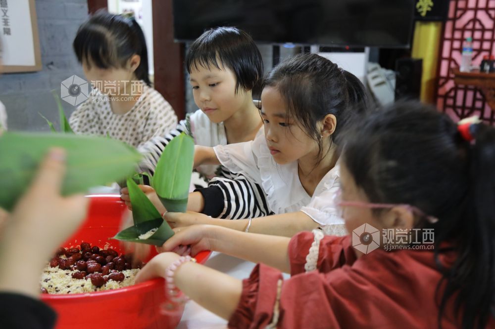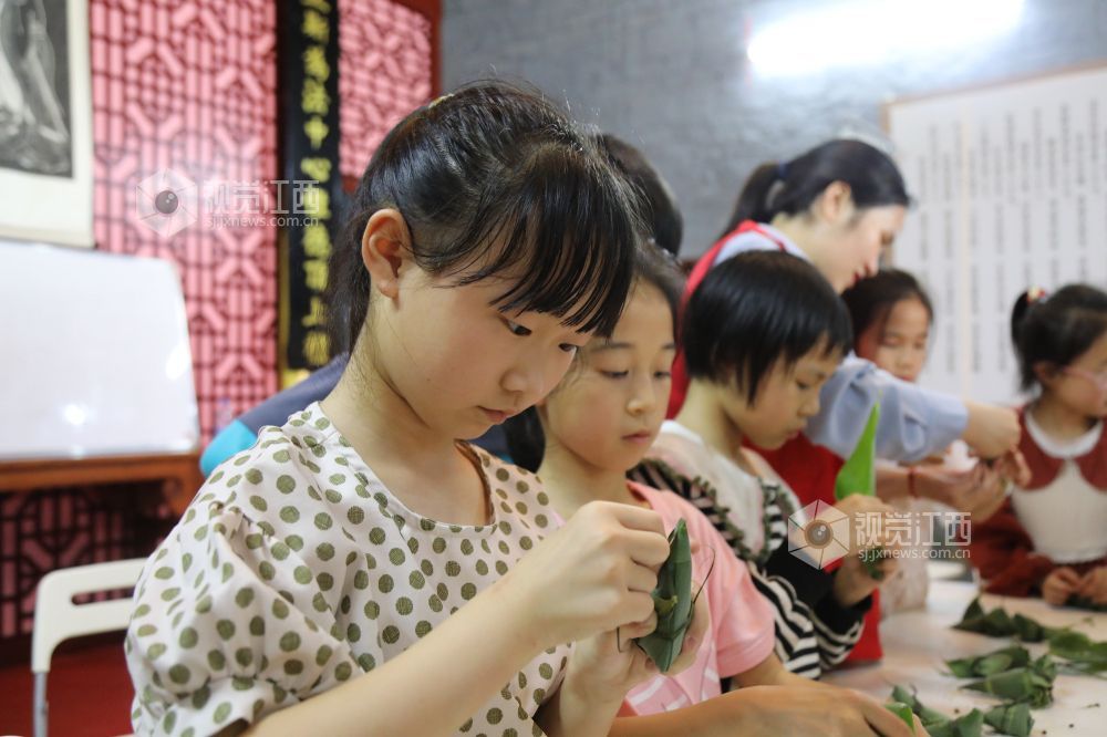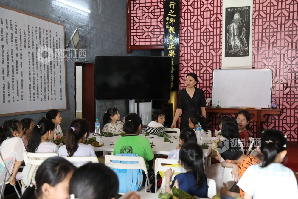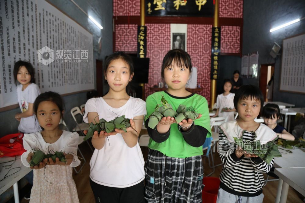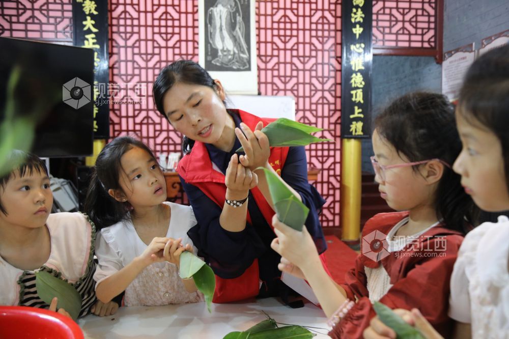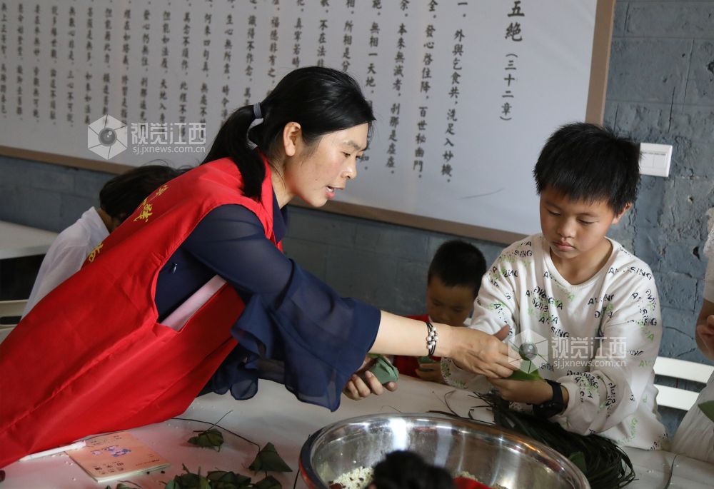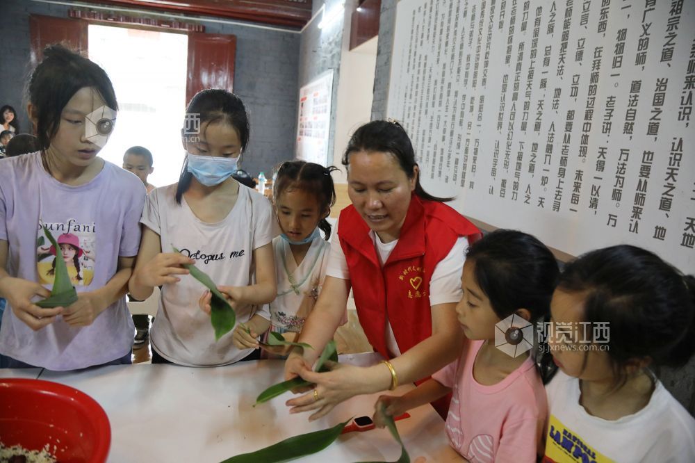 2022年6月1日,江西省莲花县路口镇汤坊村伟见国学馆内格外热闹,来自该村的留守儿童和其他小朋友,聚集这里在该村的文明实践志愿者指导下学习包粽子并聆听志愿者老师讲授端午节的来历以及伟大诗人屈原的爱国故事。
