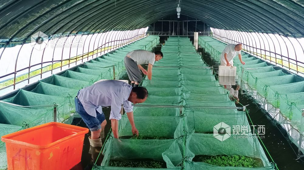 6月10日,在江西省余干县乌泥镇铜鼓包村川富温棚黄鳝养殖基地,农民正对网箱进行日常养护。
