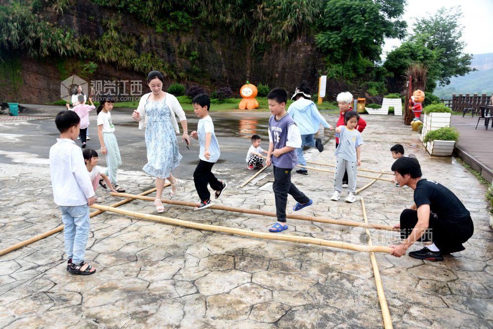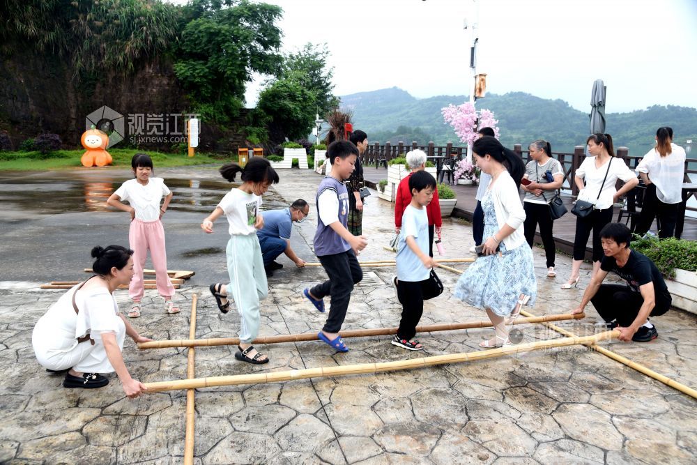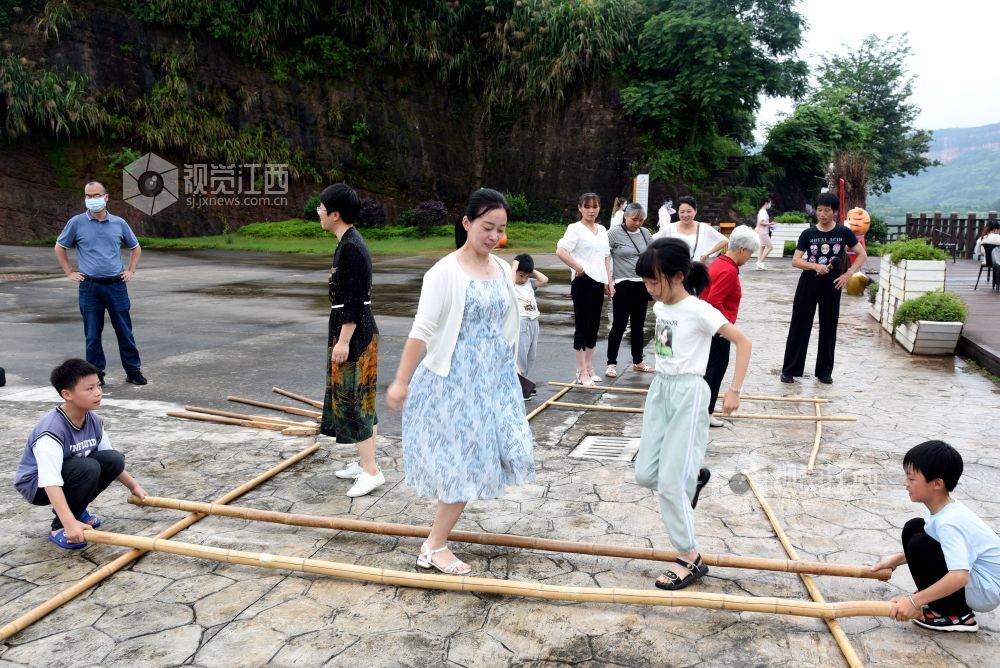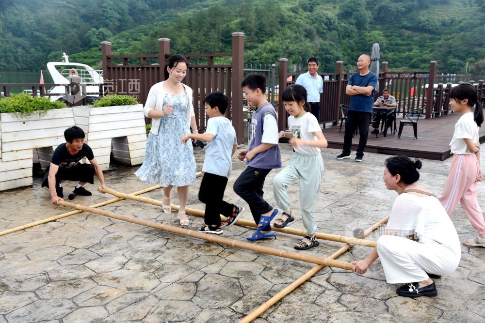 2022年 6月12日,在江西省抚州市南丰县观必上景区蜜桔湖岸边,游客开心地跳起竹竿舞,欢快开心的竹竿舞让游客如醉如痴,流连忘返。 去年以来,南丰桔文化旅游产业聚集区管委会在各景区为游客安排了丰富多彩的节目,有川剧变脸、茶艺表演、游船观光、南丰傩舞、大唐不倒翁、竹竿舞、角色扮演等,让往来游客在欣赏浩瀚橘海的同时,观看了丰富多彩的特色节目,享受文化大餐。