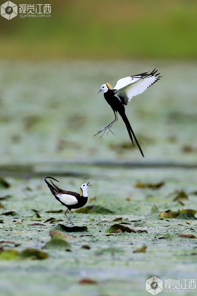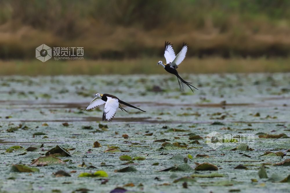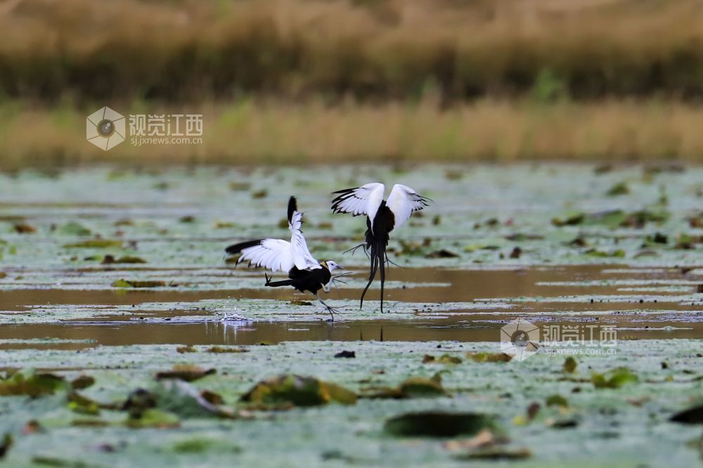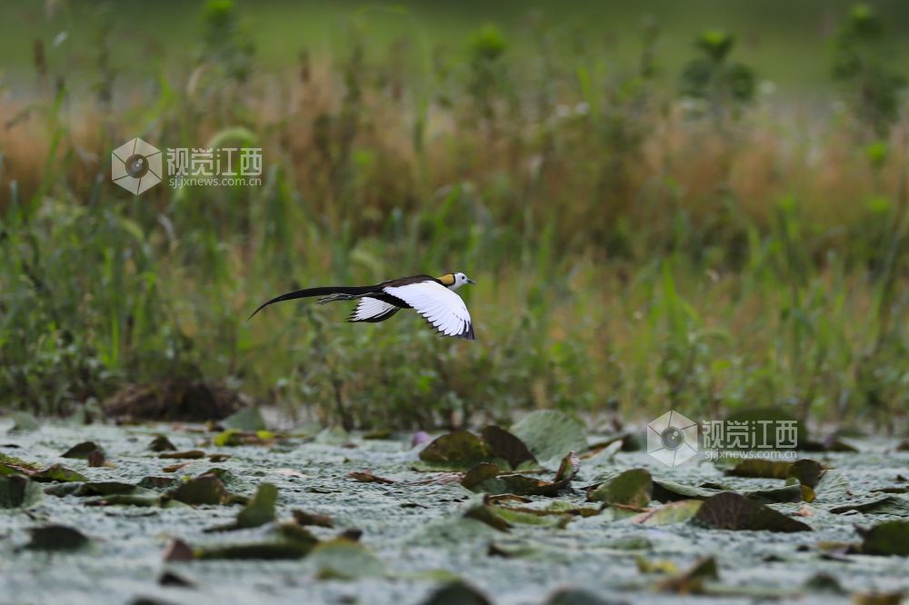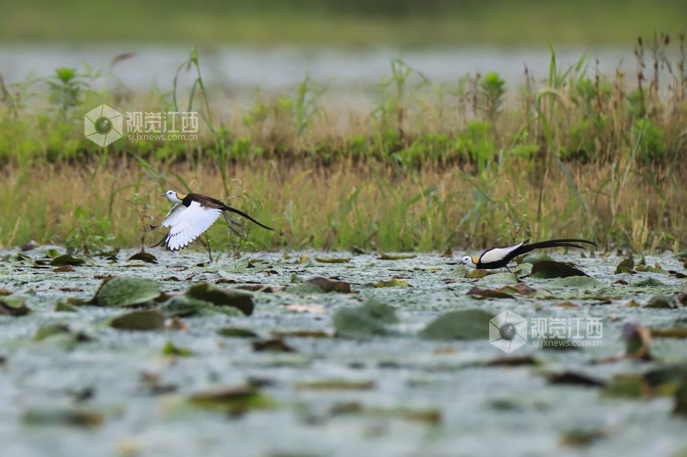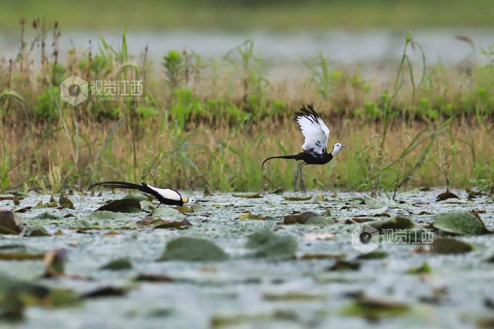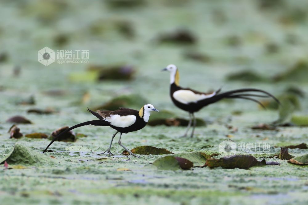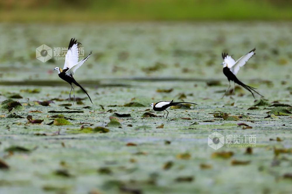 2022年6月12日,一群水雉正在江西省九江市湖口县鄱阳湖畔一处湿地栖息觅食,构成了一道亮丽风景。水雉体态优美,羽色艳丽,被誉为“凌波仙子”,对生态环境的要求极高。