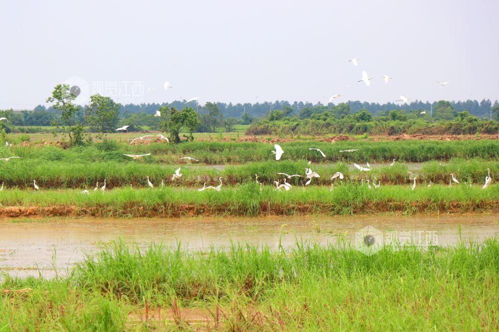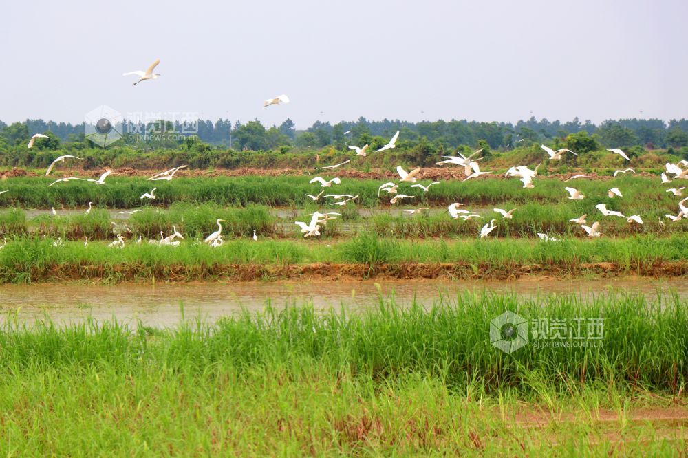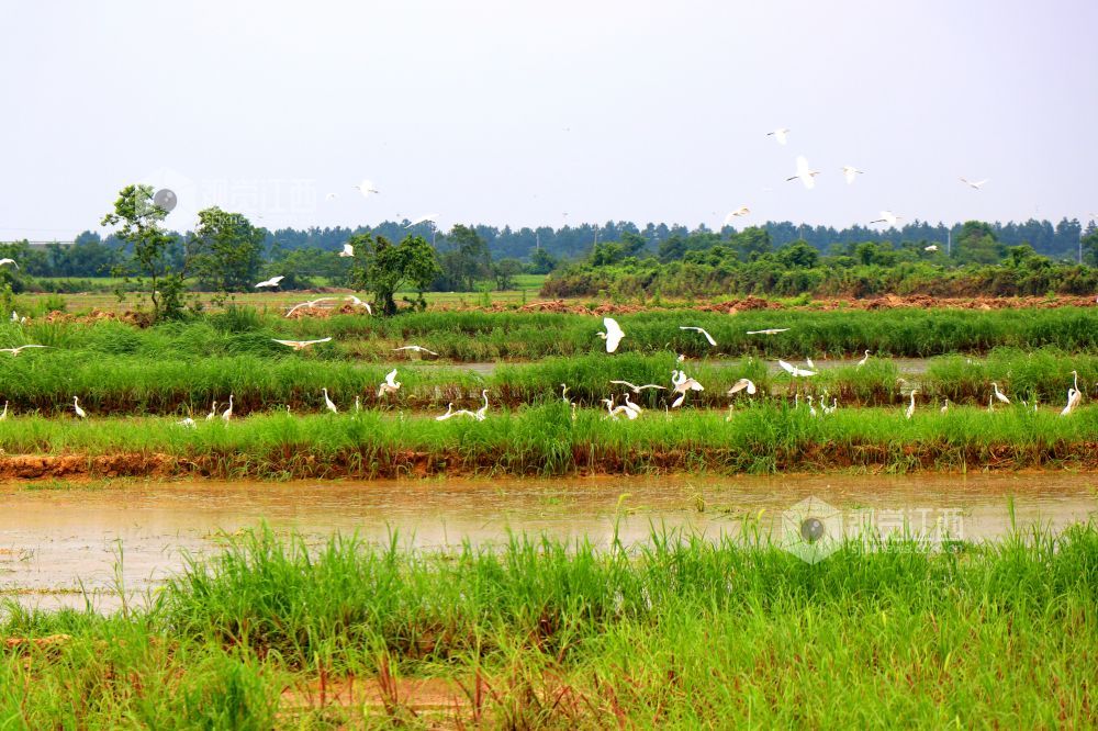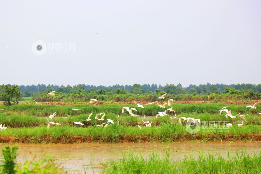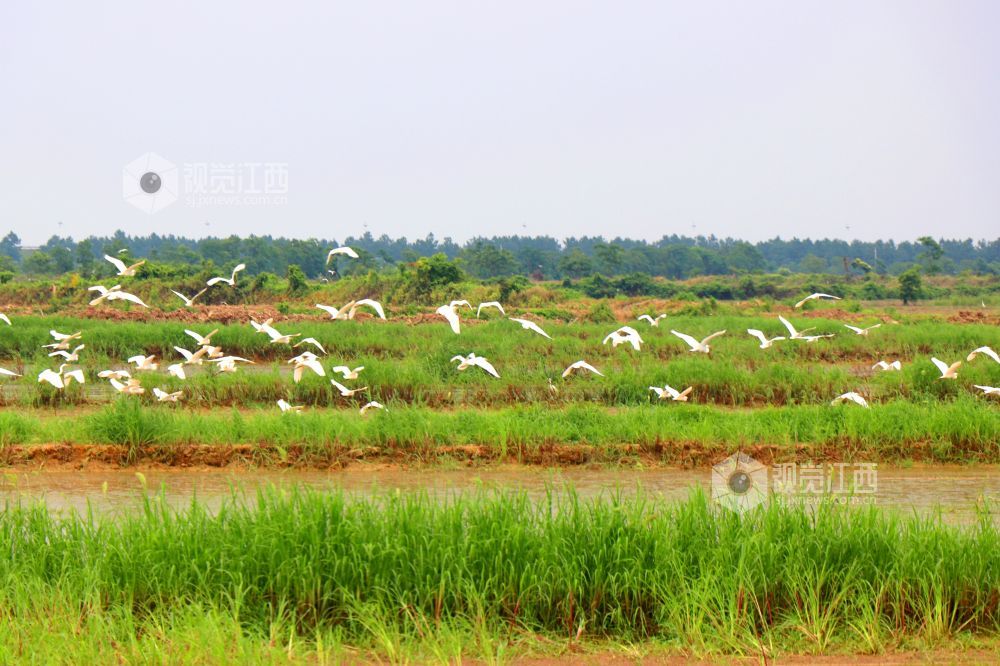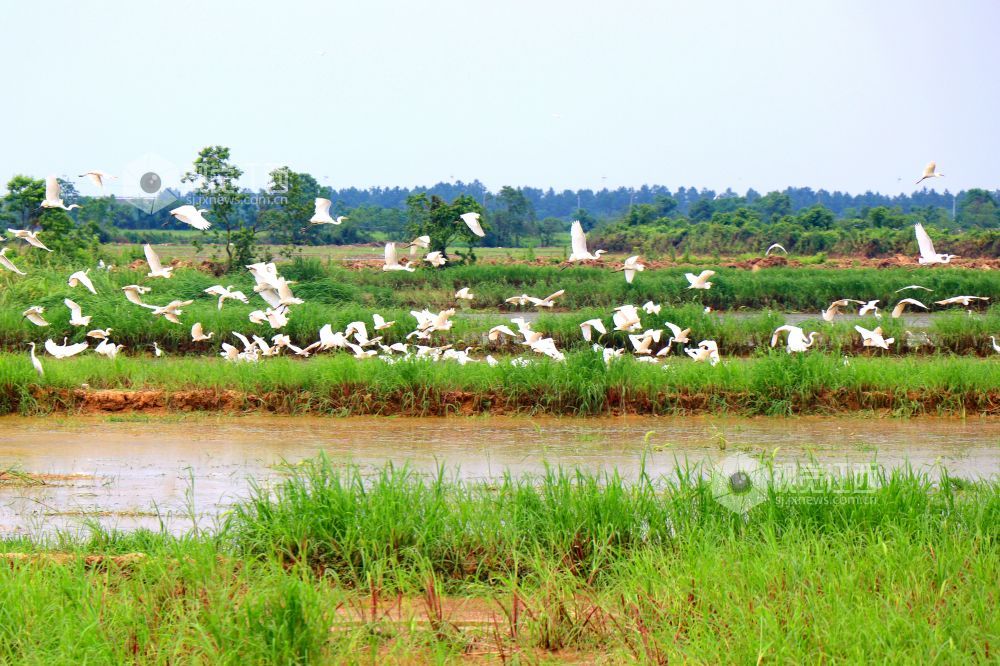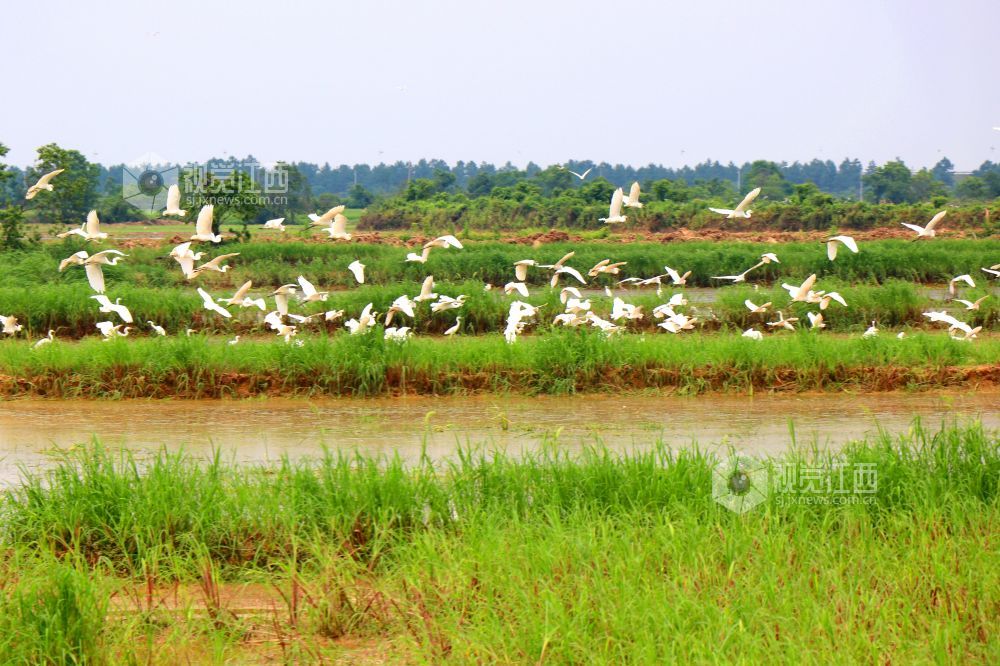 6月15日,江西省余干县康山垦殖场里溪村,成群的白鹭在田野觅食、飞翔,构成一幅美丽和谐的生态田园画卷。