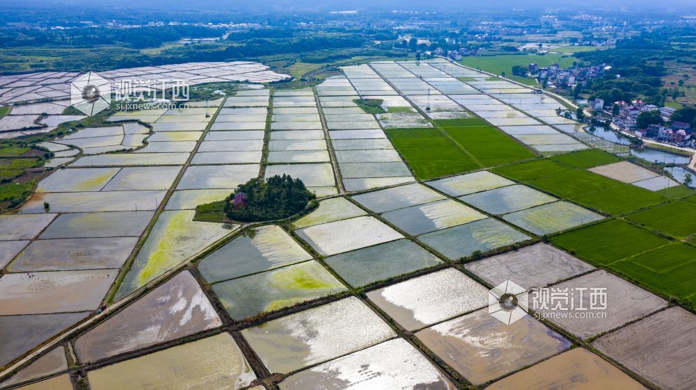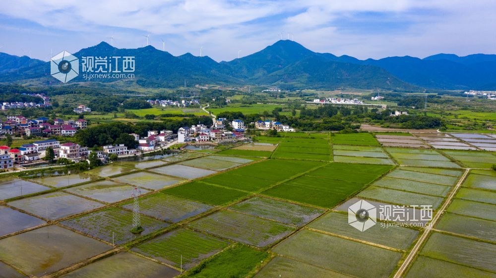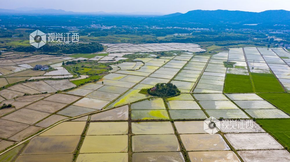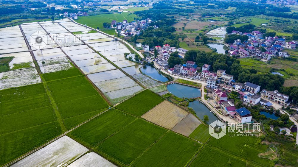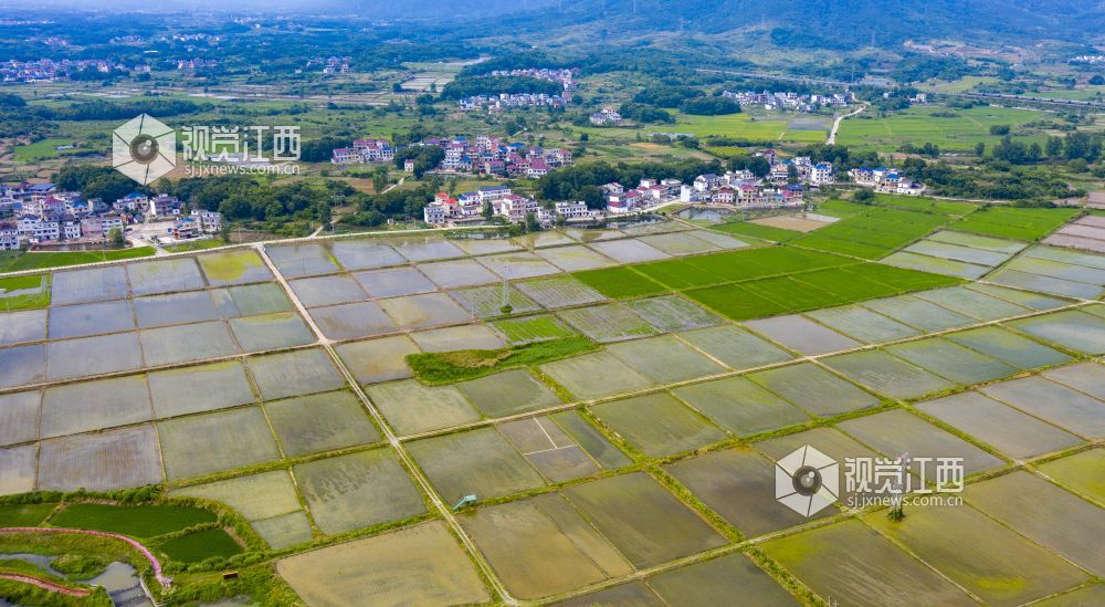 2022年6月15日,俯瞰江西省九江市湖口县武山镇万亩油料基地,稻田阡陌纵横,村舍规划有序,构成一幅幅美丽的田园画图。