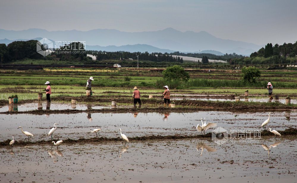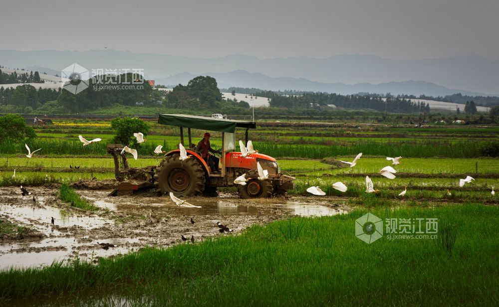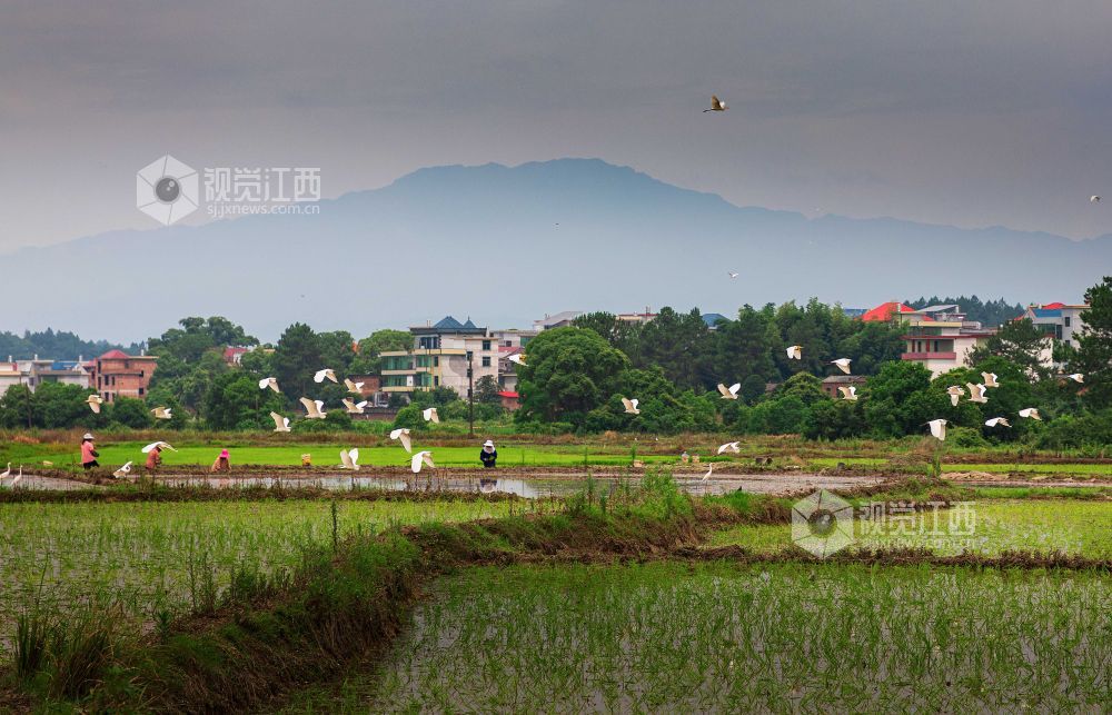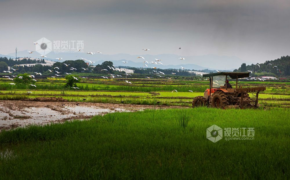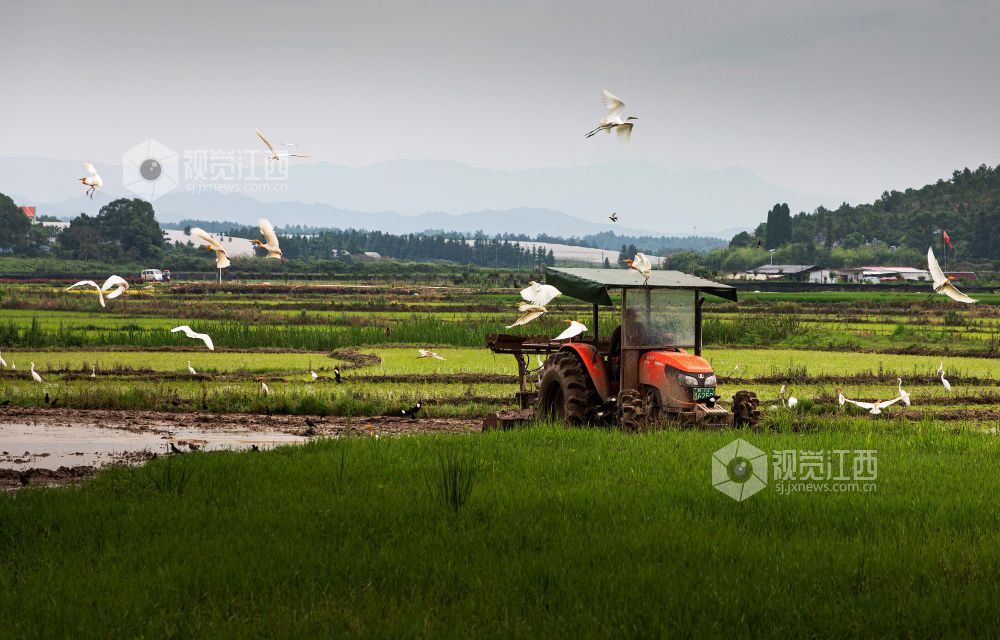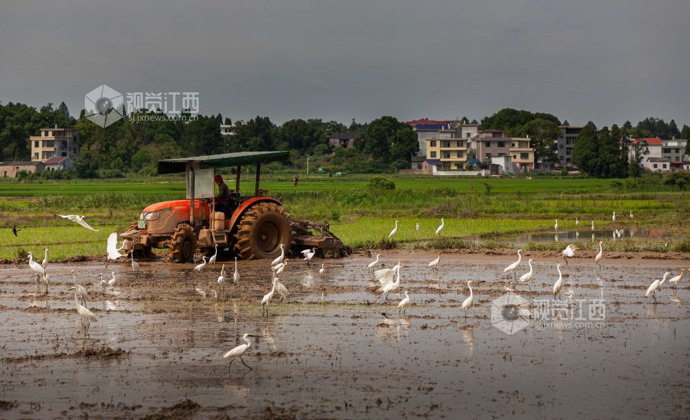眼下正是中稻种植的关键期,6月15日,江西省永新县象形乡高田村农民正在抢抓农时,开展翻耕、插秧工作,一群白鹭跟随农机,在翻耕后的水田里嬉戏觅食、起舞翩飞,展现出一幅“人鸟和谐伴农耕”的美好画卷。