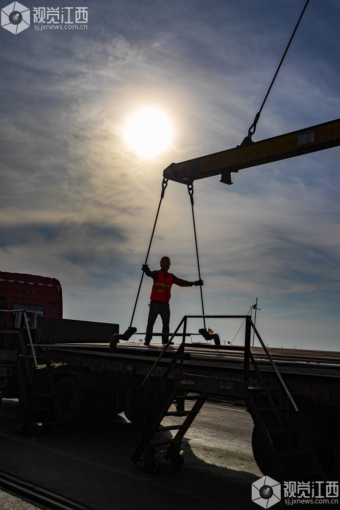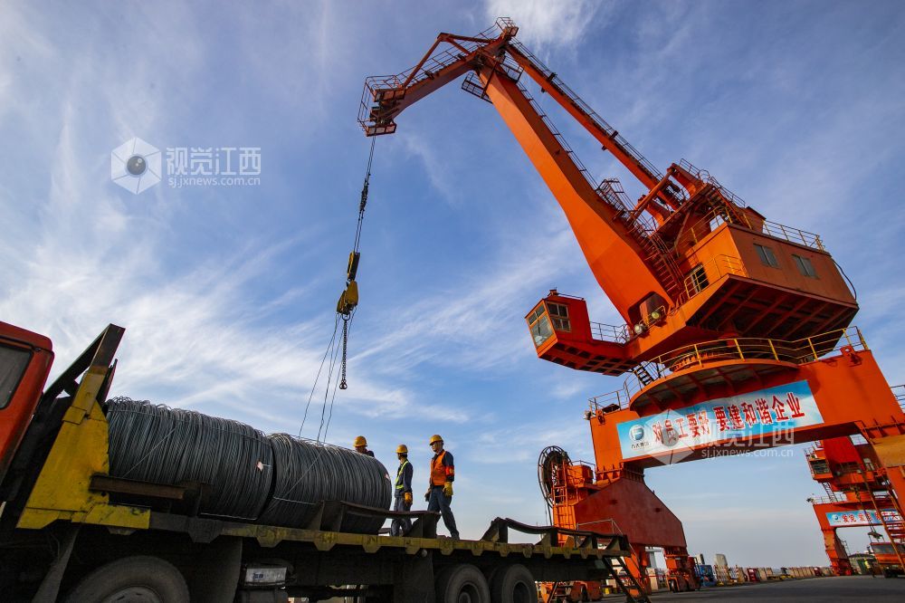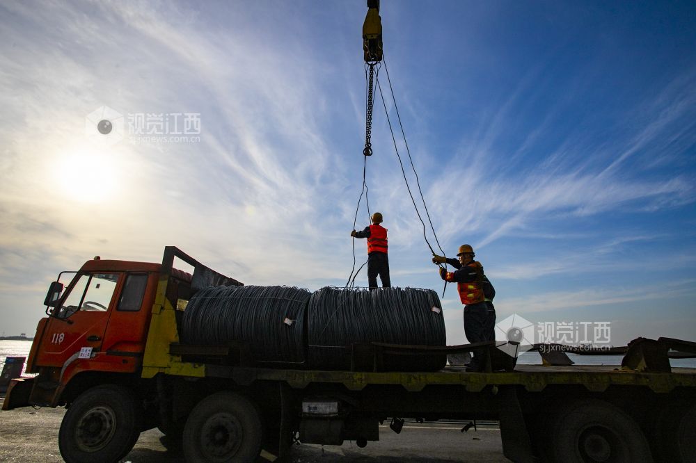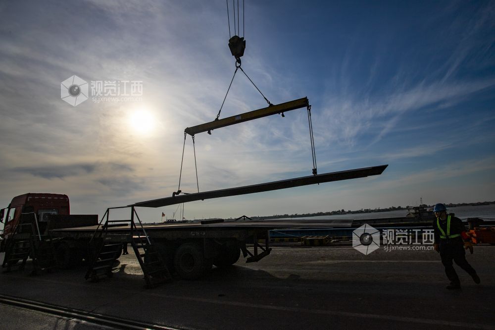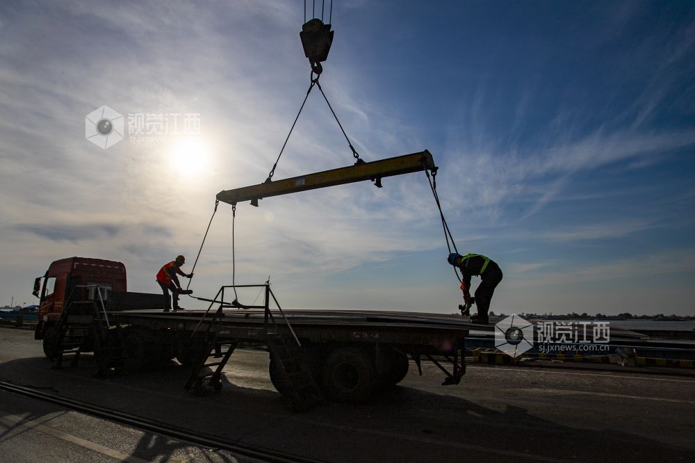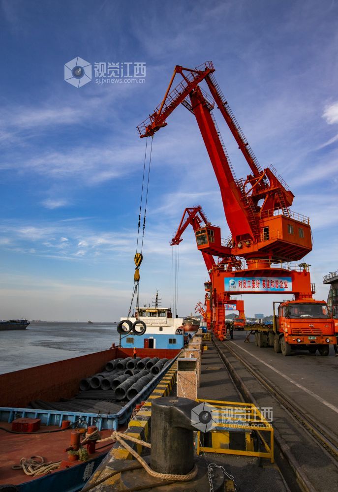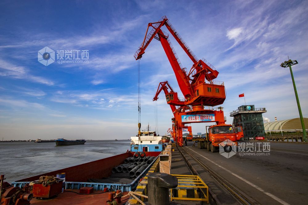 2022年6月16日,江西省九江市湖口县高新技术产业园区方大九钢公司码头员工正在进行成品钢材吊运装船作业,现场一派繁忙。