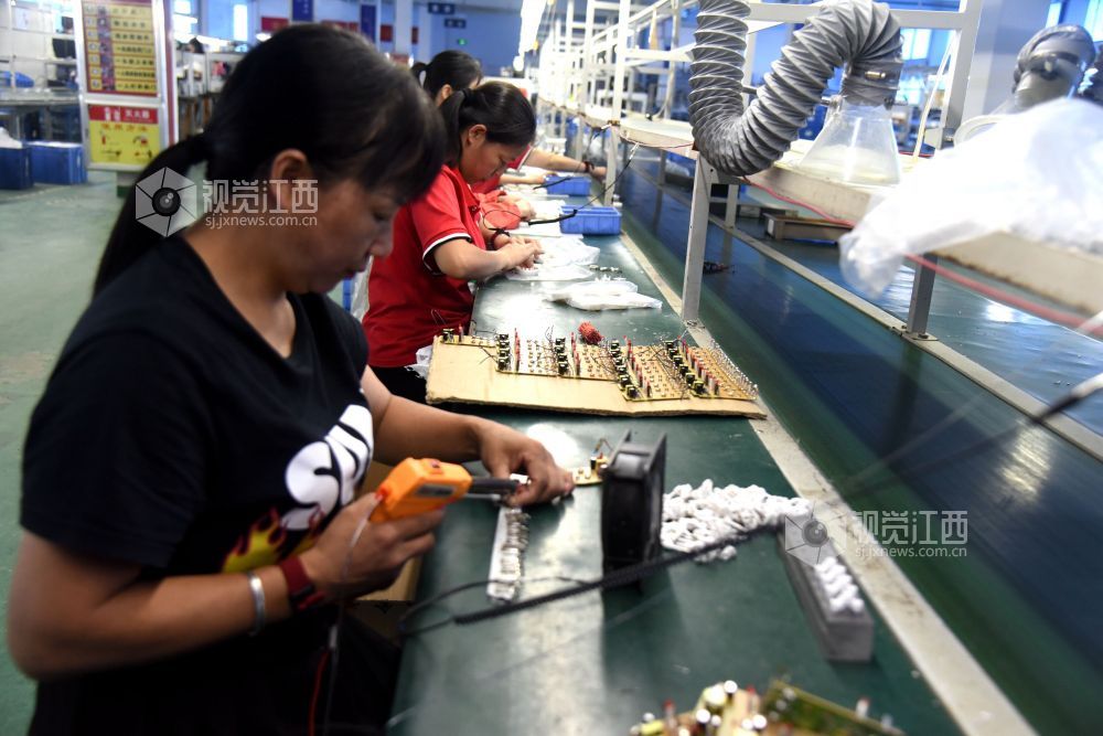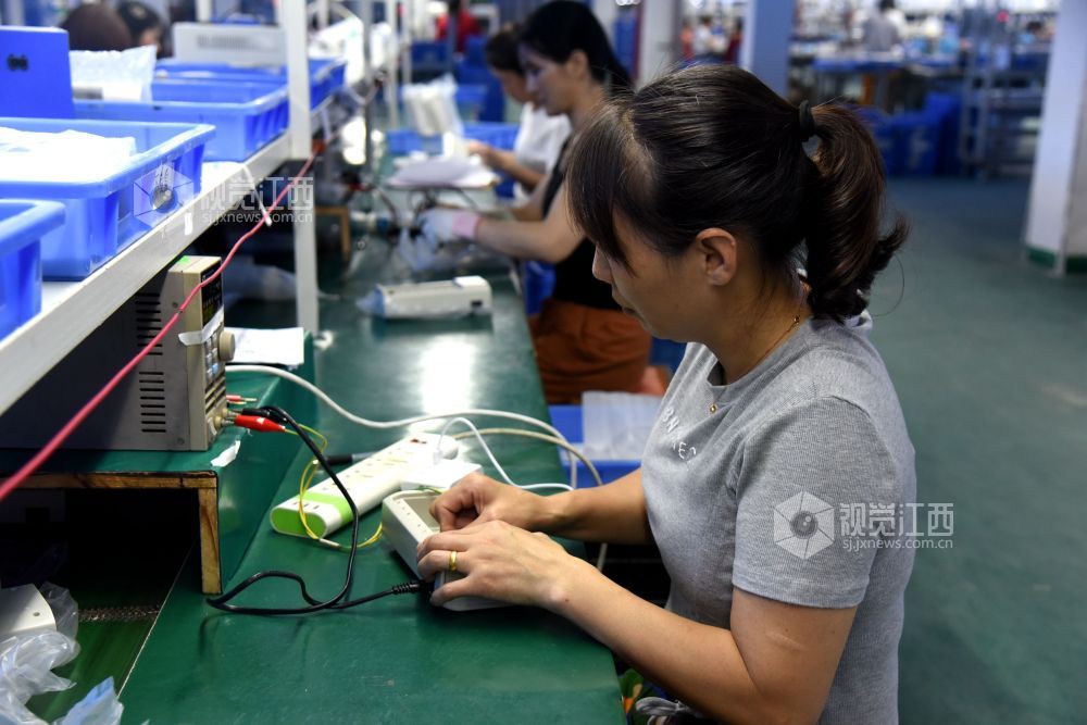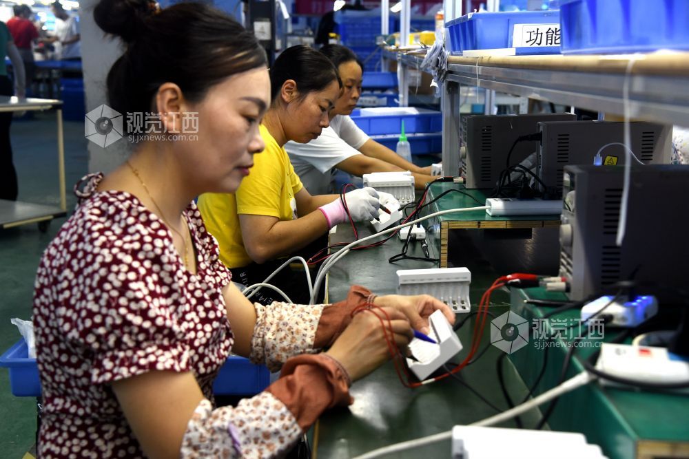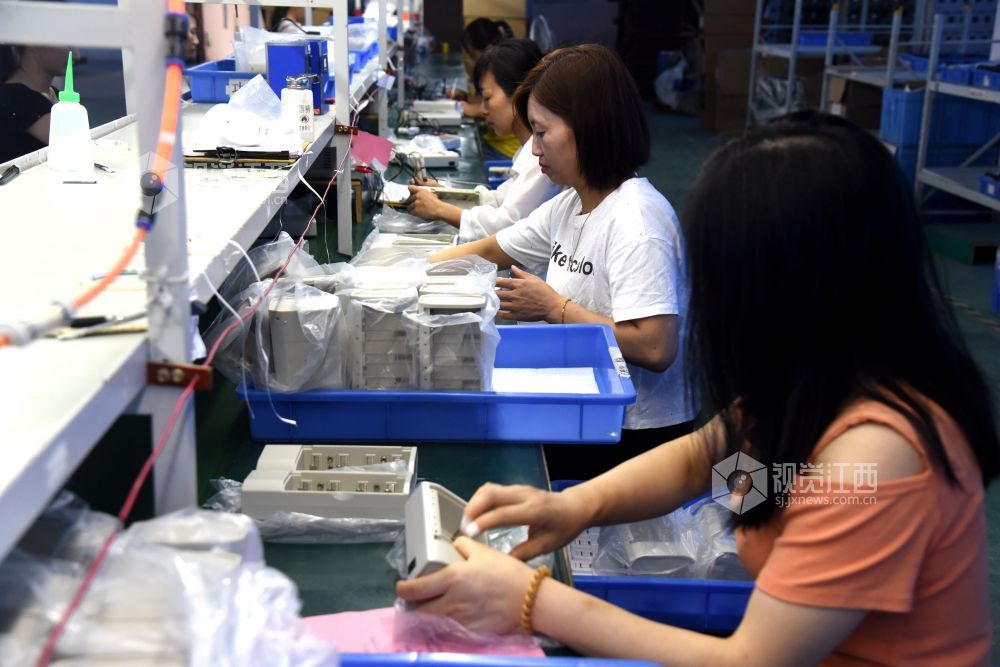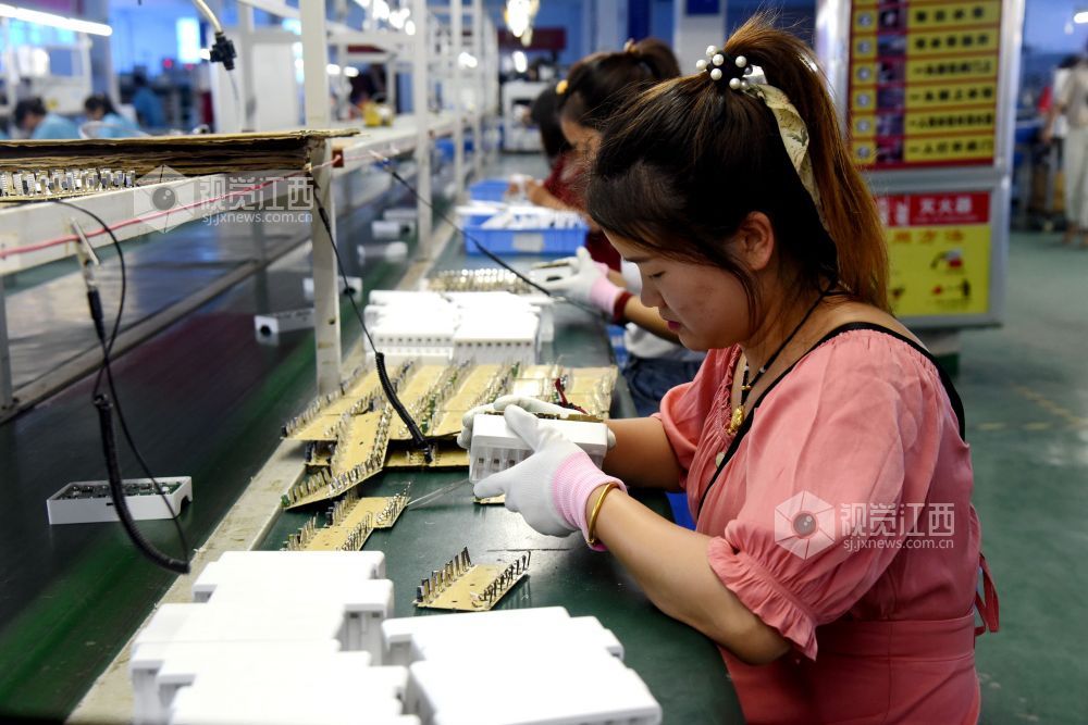 2022年6月16日,落户在江西省抚州市南丰县富溪工业园区的江西佰仕通电子科技有限公司生产车间,工人们正在生产线上赶制出口产品。
