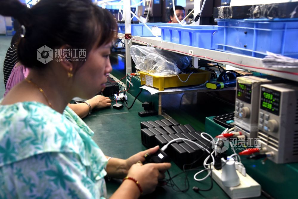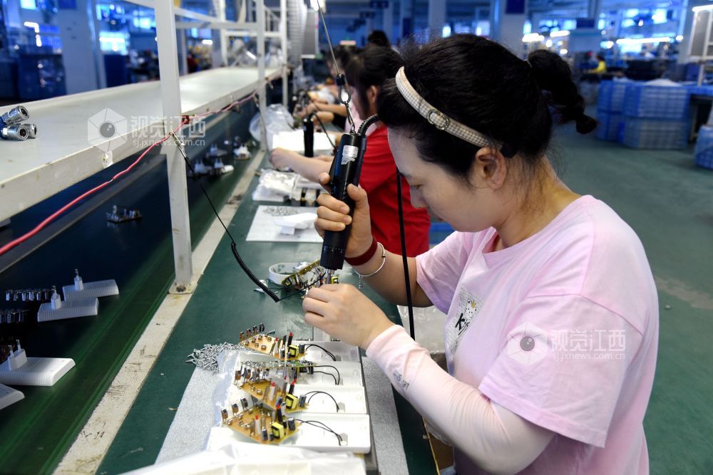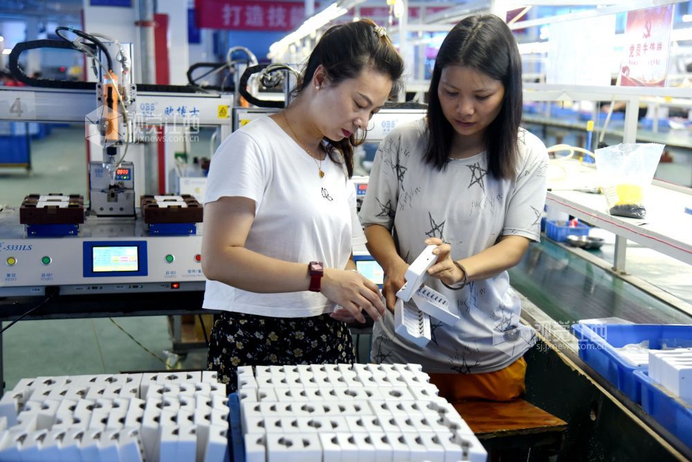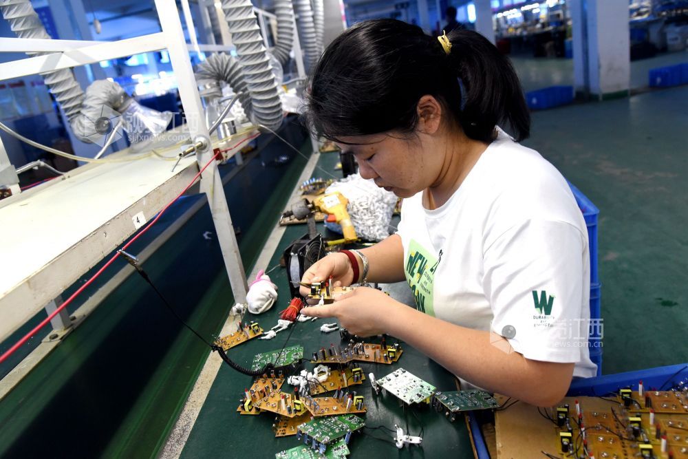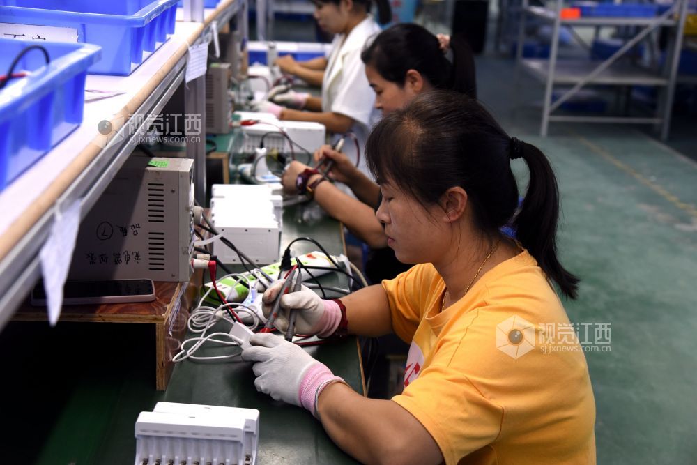2022年6月16日,落户在江西省抚州市南丰县富溪工业园区的江西佰仕通电子科技有限公司生产车间,工人们正在生产线上赶制出口产品。