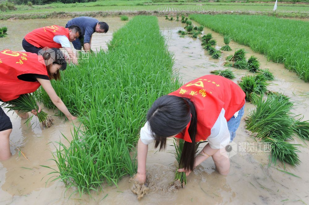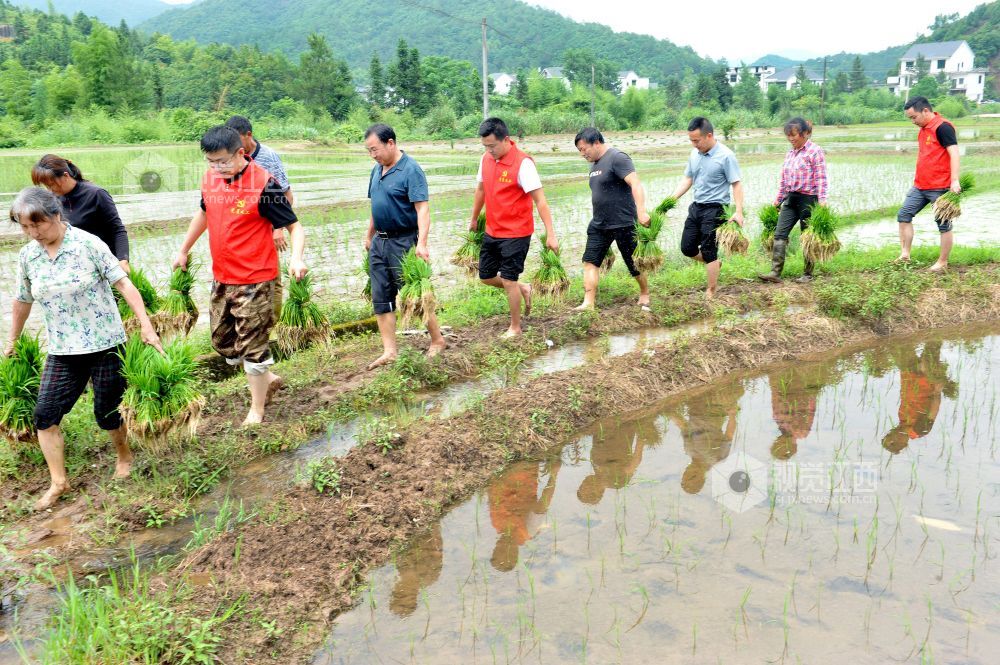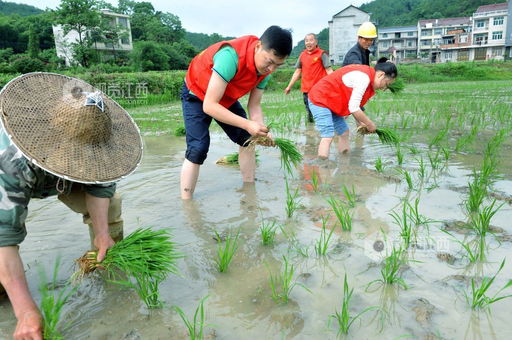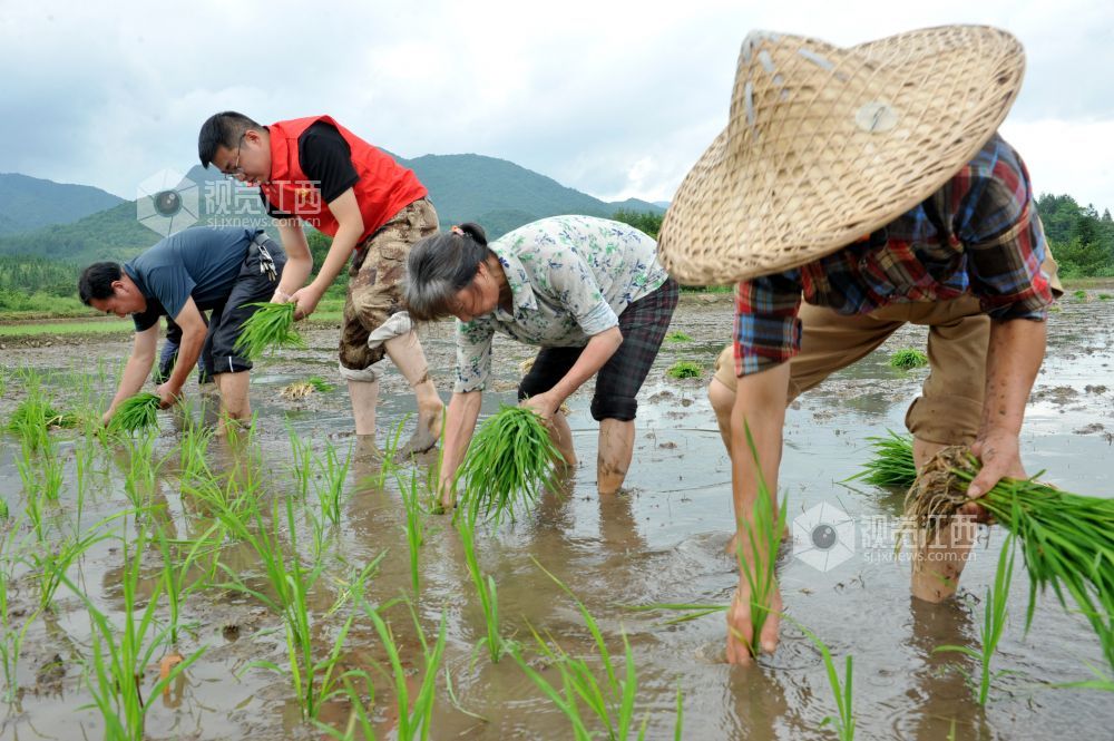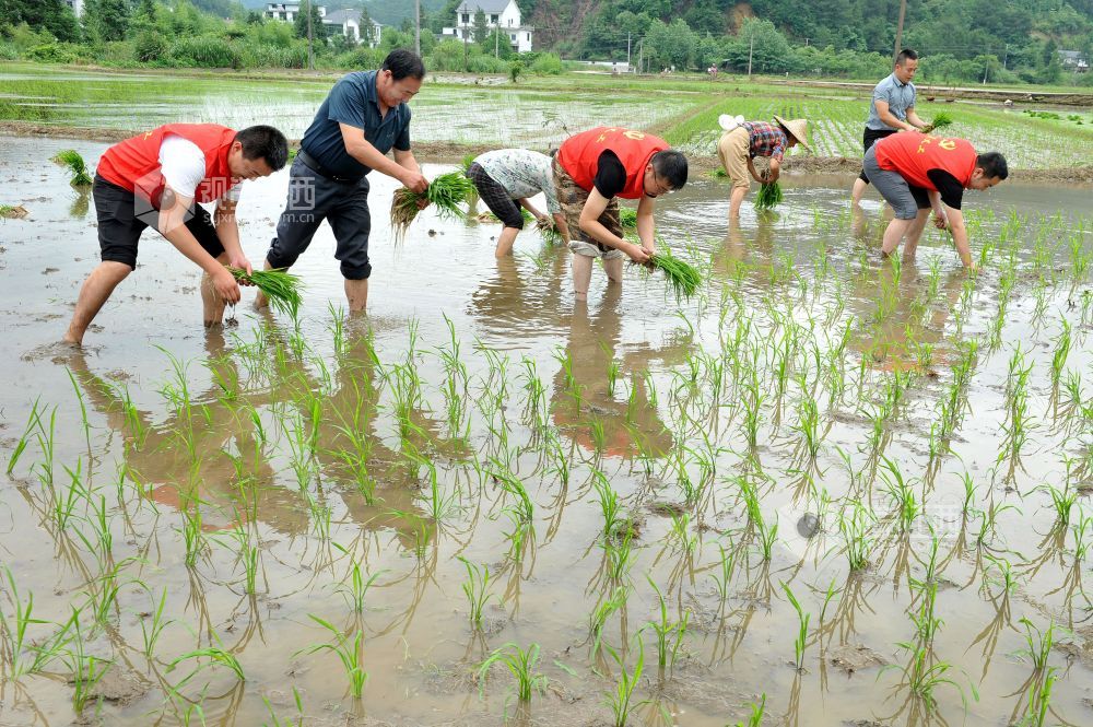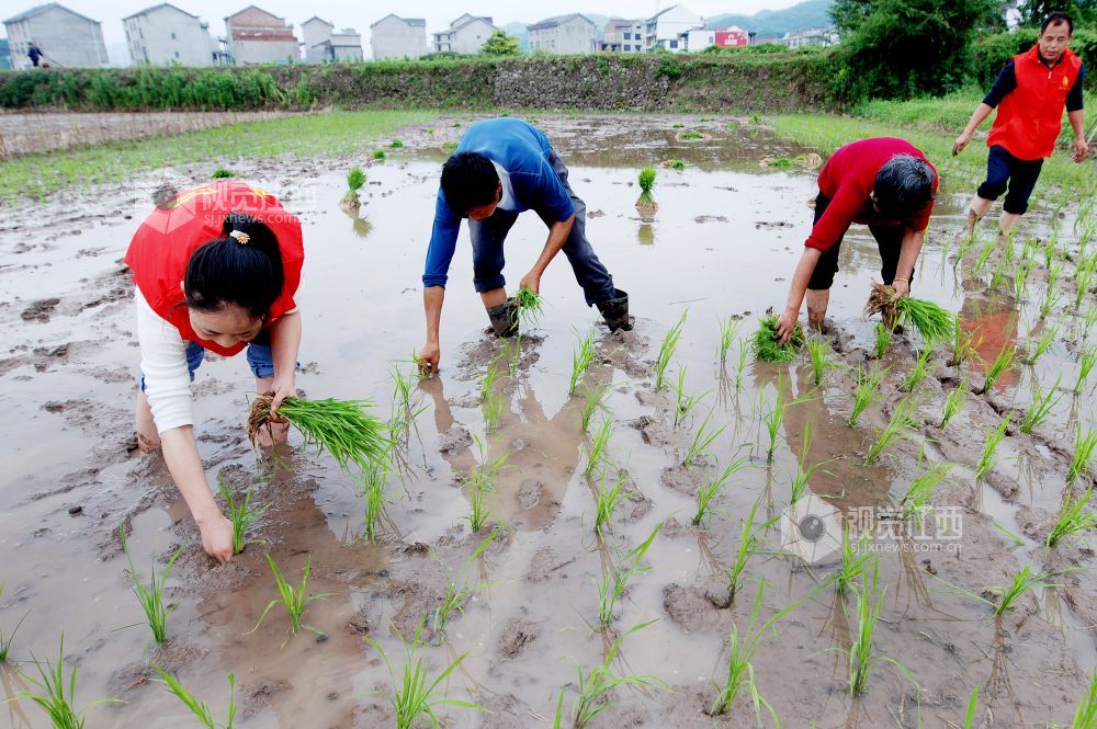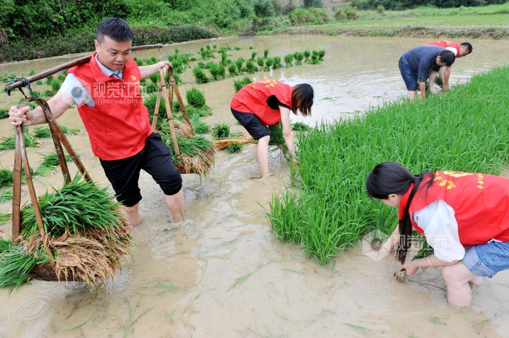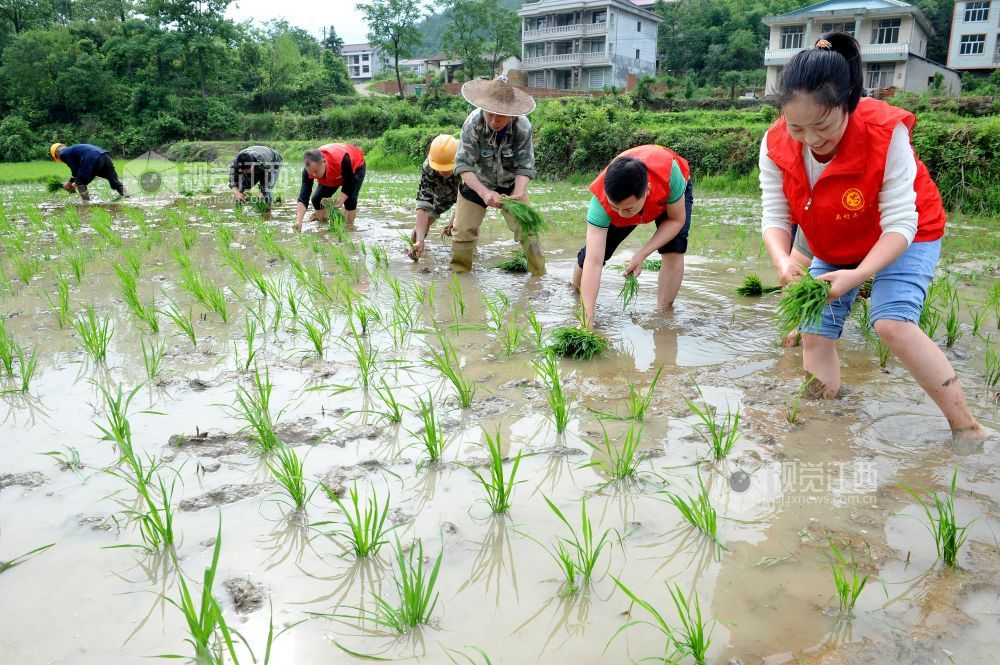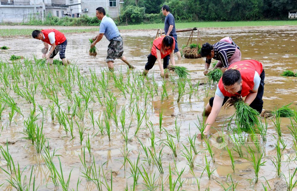 2022年6月22日,江西省德兴市泗洲镇党员义工正在该镇王村,帮助村民播插中稻秧苗。时下早稻开始抽穗、中稻也进入最后收尾插秧阶段。在江西省北部少数偏远山区因气候相对偏低,播插中稻时间也跟着相对偏晚。为让农民按时按季完成中稻播种工作,江西省上饶市广丰区、德兴市两地基层乡(镇)党员义工,纷纷深入农家田间地头,帮助农民播插中稻,确保农民粮食增产增收,深受广大农民的欢迎。据了解,截至目前,江西省中稻播插已完成计划播种面积的九成以上。
