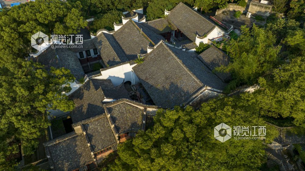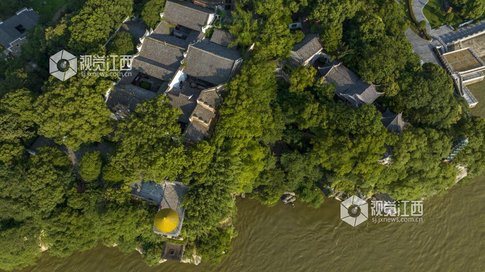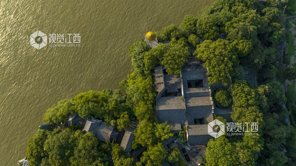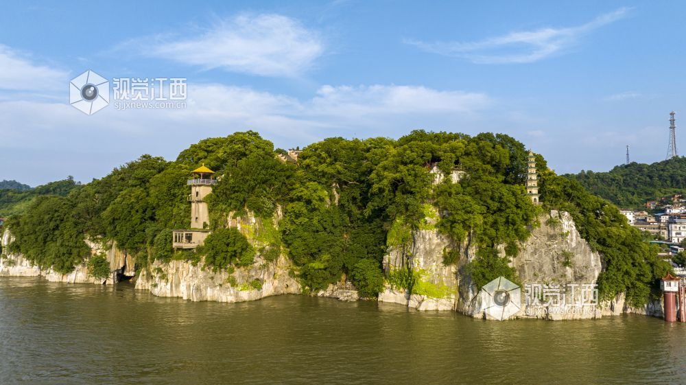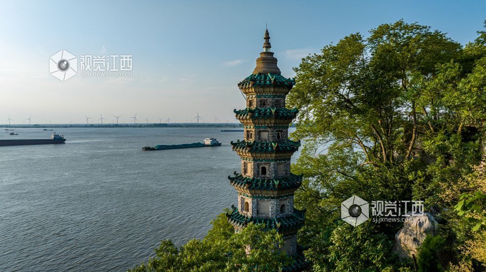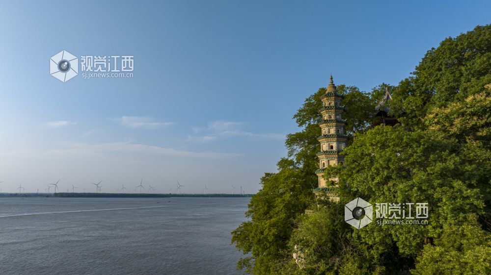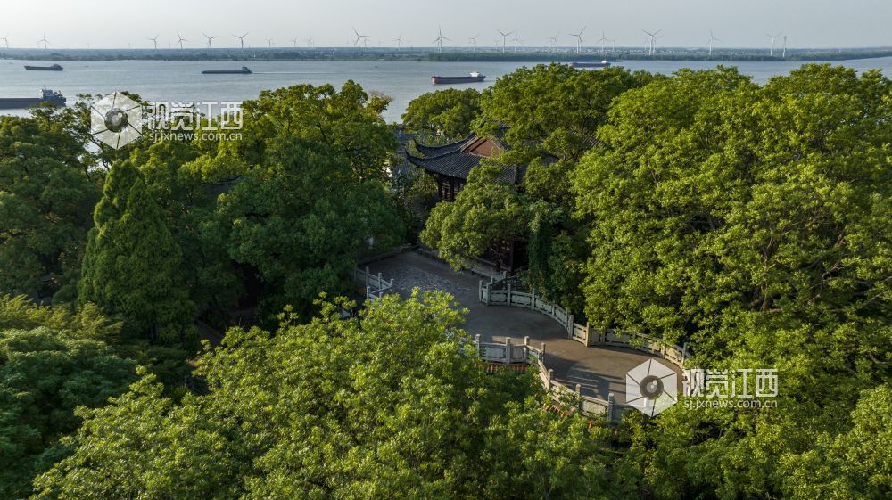 2022年6月25日,江西省九江市湖口县碧空如洗,石钟山傲然屹立于长江之岸,鄱阳湖之滨,风景雄奇秀丽。石钟山层林叠翠,危崖耸峙,楼阁参差。