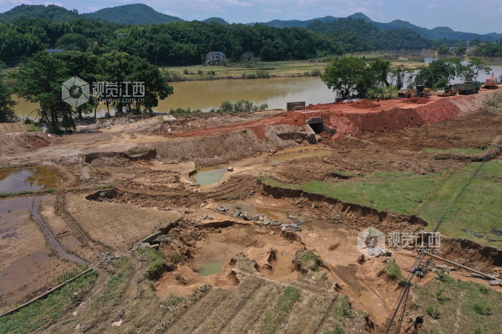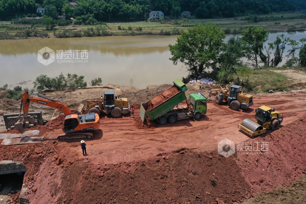 连日来,江西省上饶市信州区沙溪镇正在加快灾后恢复工作,全市2000余干部和群众,二百余台车参于灾后重建工作。6月27日拍摄的江西省上饶市信州区沙溪镇正在修复圩堤。