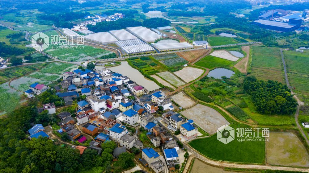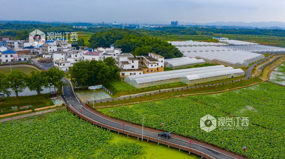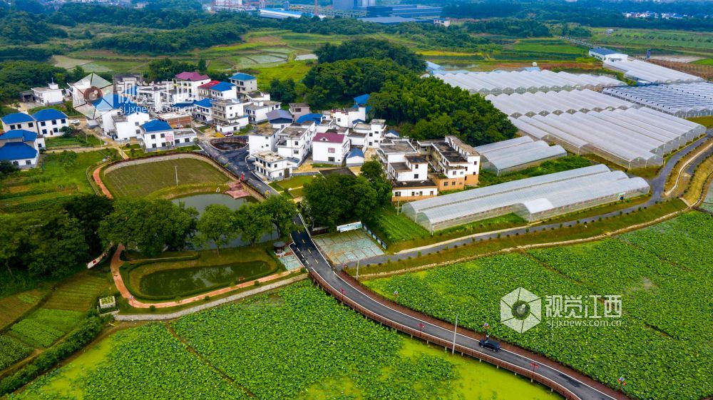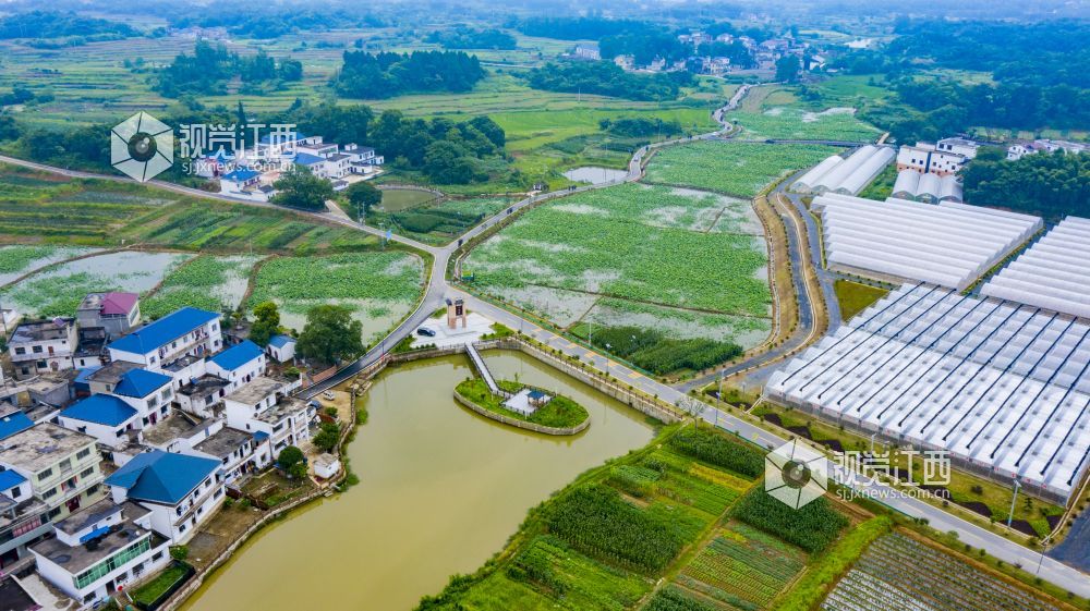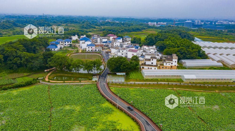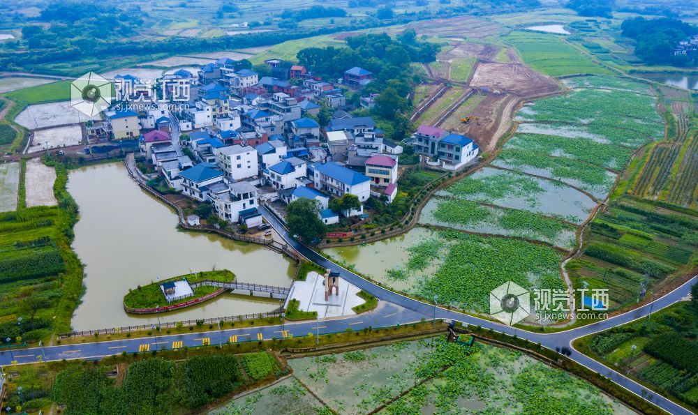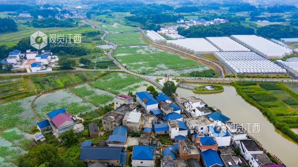 2022年6月28日,空中俯拍江西省九江市湖口县流泗镇童八房湾,荷花争艳,产业兴旺,村庄秀丽,构成一幅美丽的乡村画图。