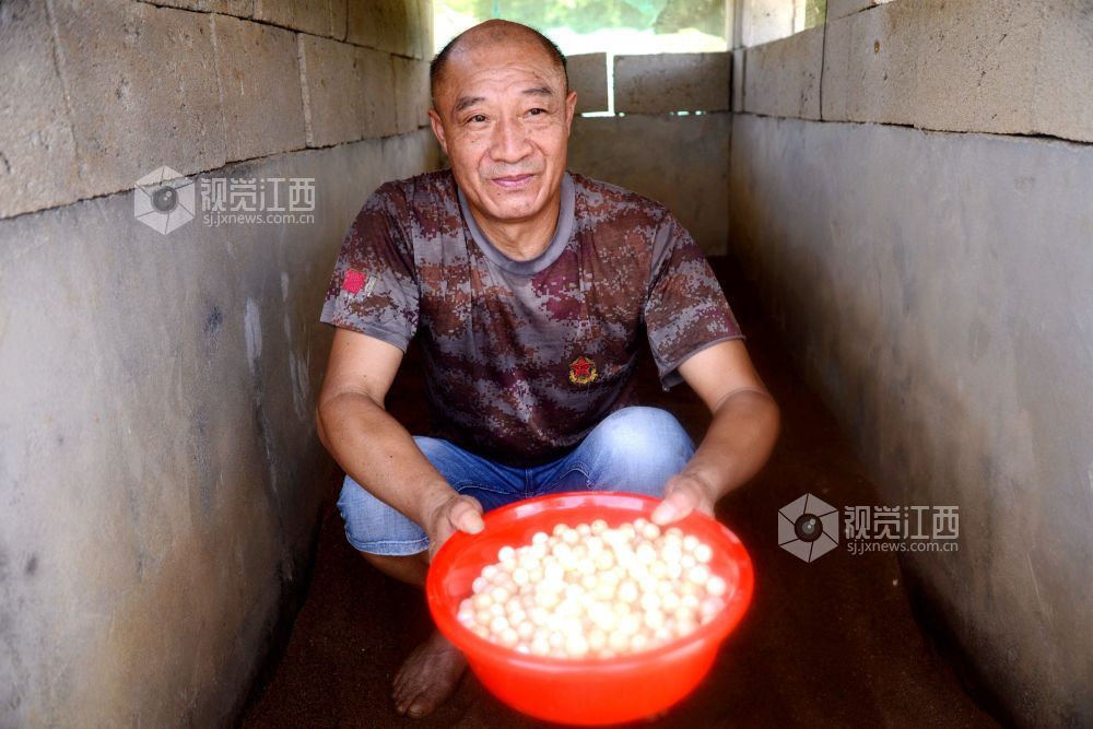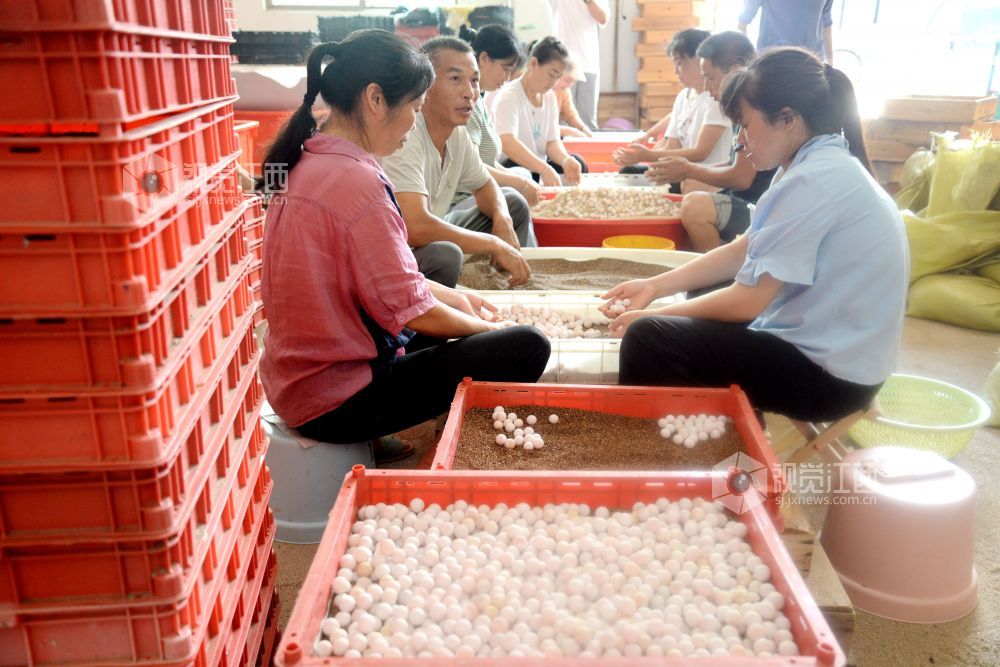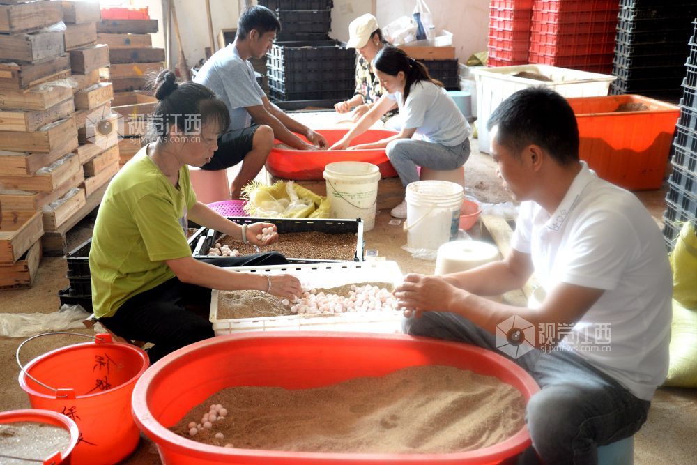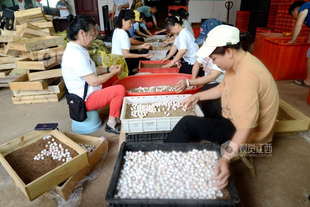 2022年6月30日,在地处江西省南丰县太和镇的江西添鹏生态农业有限公司龟鳖生态养殖园里,龟鳖养殖户从沙堆里刨出龟蛋,农户正在将挑选好的龟鳖蛋包装准备外运;在多处龟鳖养殖池里,龟鳖或在岸边晒太阳,或在水中畅游,好不自在。