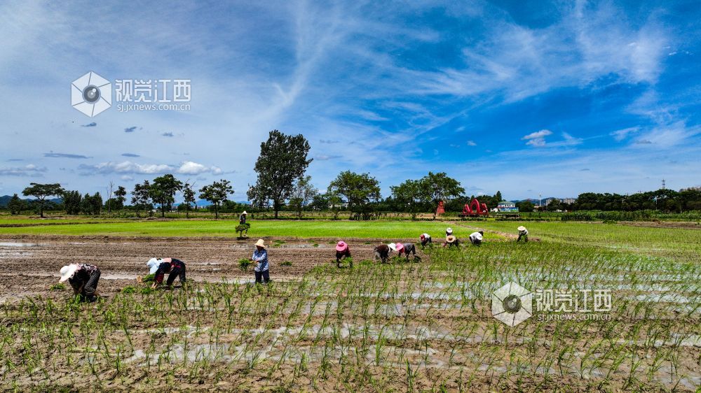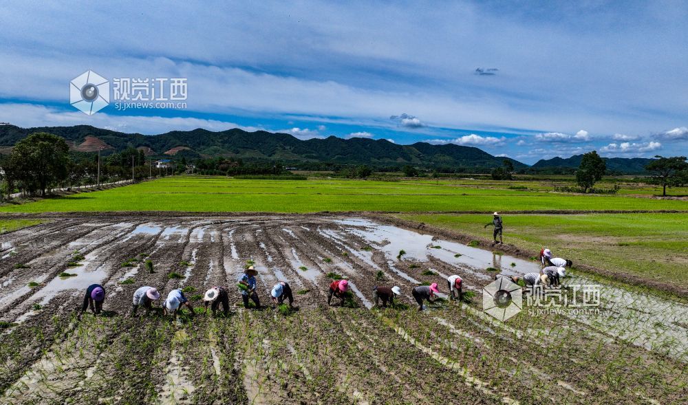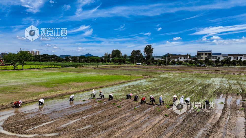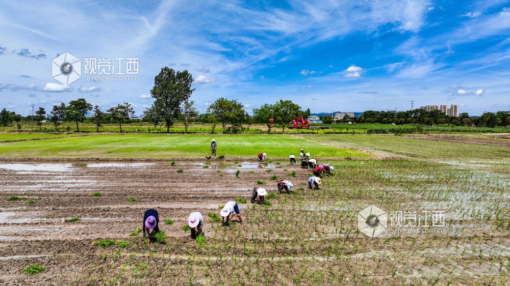 2022年7月2日,江西省瑞昌市赛湖农场农民正在田间插秧。目前,瑞昌市11.3万亩中稻插秧工作基本接近尾声,该市按照“稳政策、稳面积、稳产量”的目标要求,坚持因地制宜、强化技术指导。