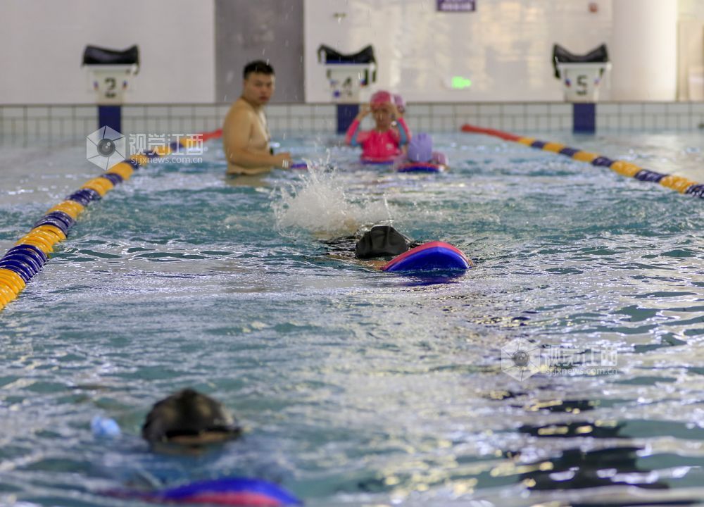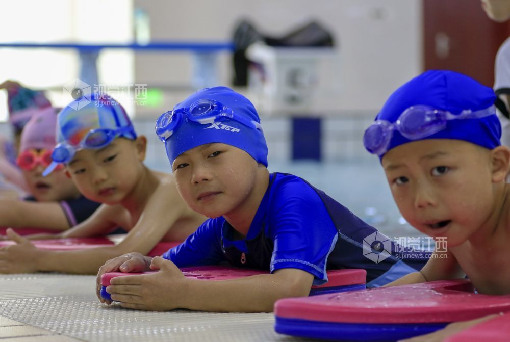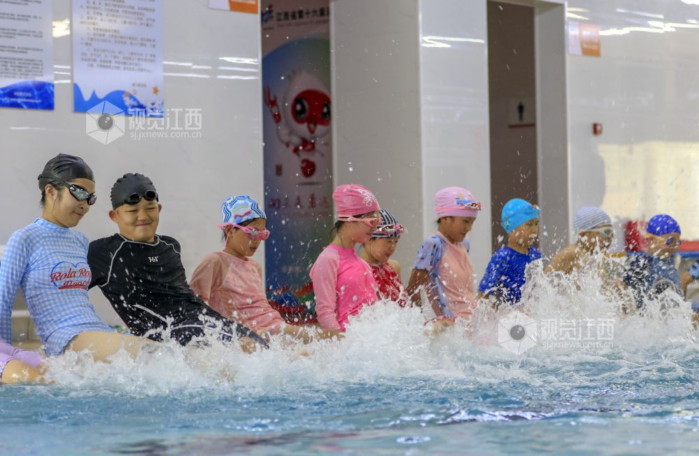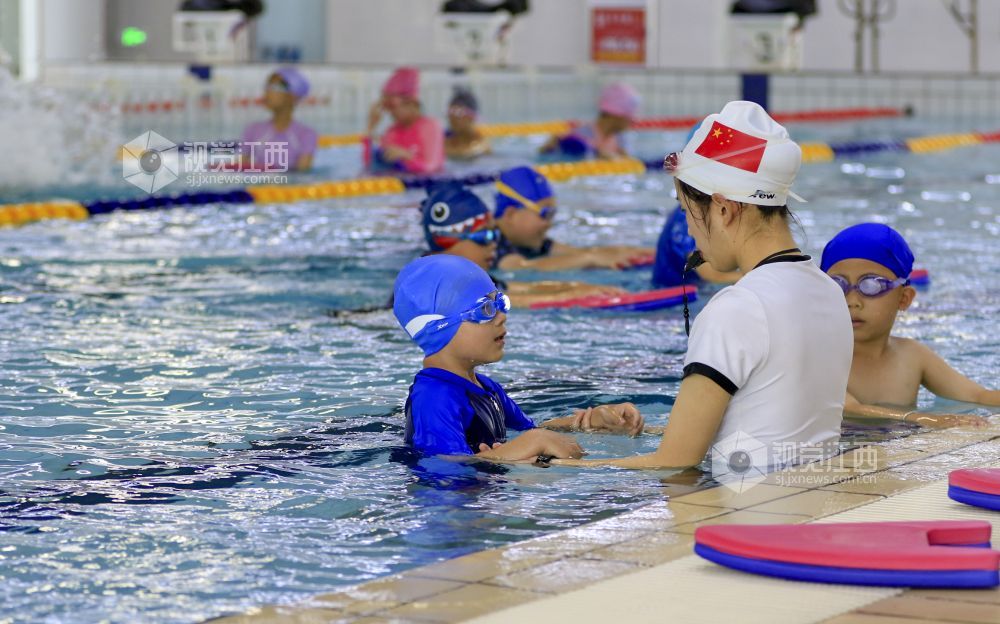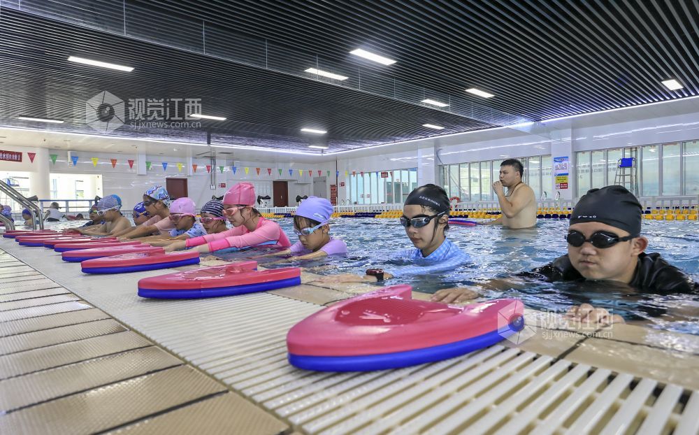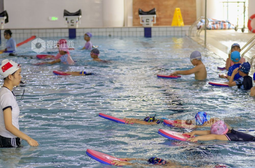 7月2日,在江西省湖口县文体公园游泳馆,孩子们在游泳教练的指导下学习游泳。暑假期间,当地不少家长带着孩子们来到游泳馆,让孩子在学习游泳技能的过程中强身健体,乐享清凉,丰富假期生活。