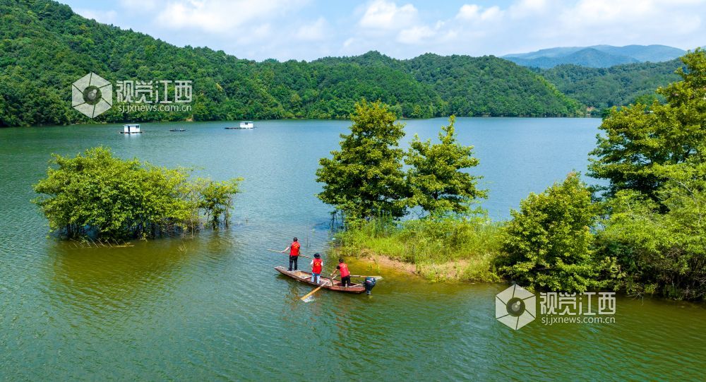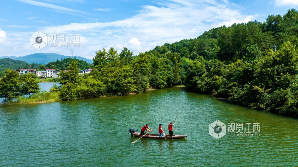 2022年7月7日,江西省瑞昌市南义镇党员志愿者在辖区幸福水库巡湖、清理漂浮物。
