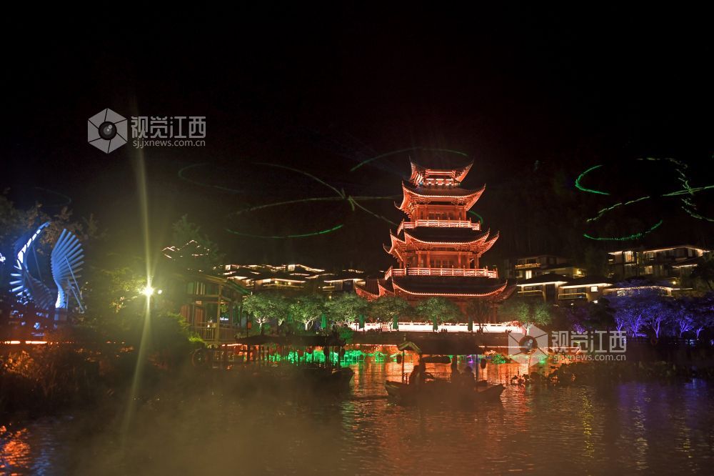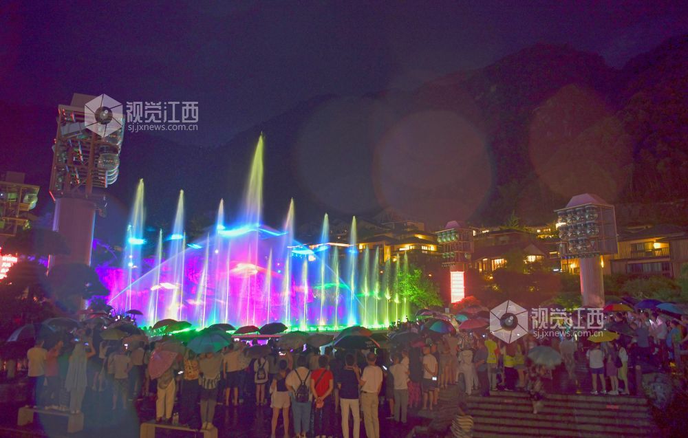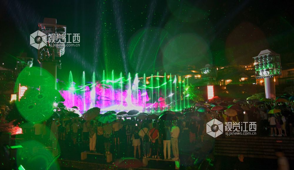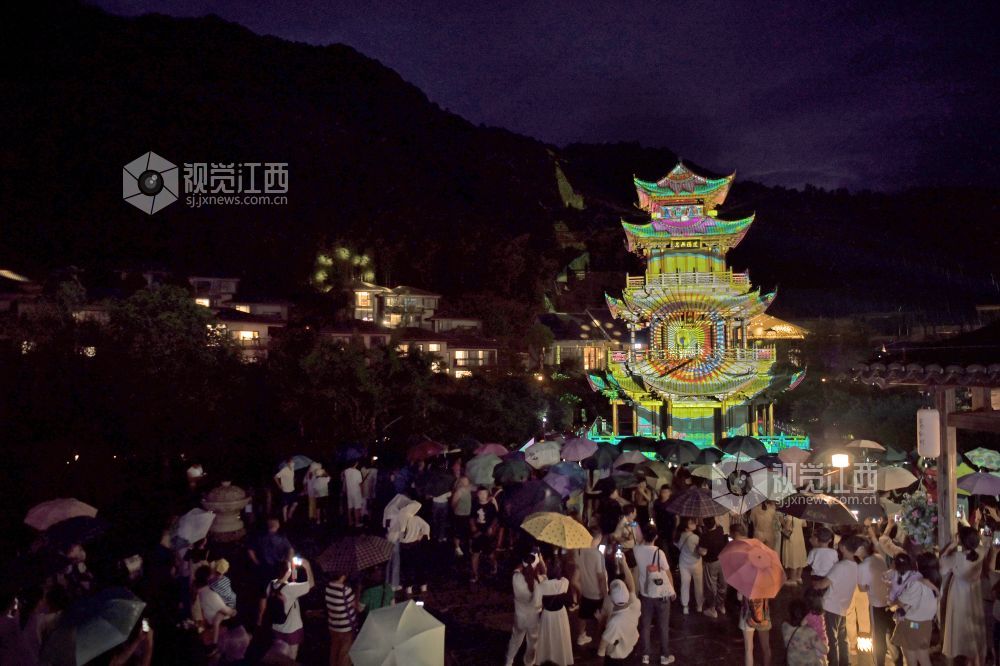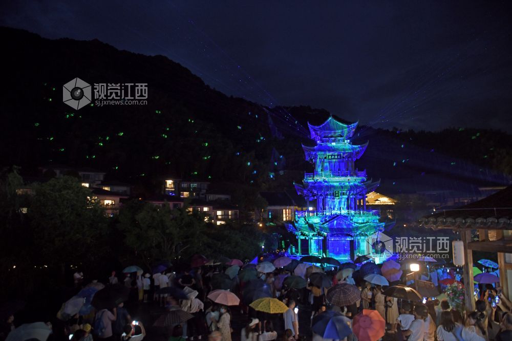 2022年7月6日晚,江西省上饶市铅山县葛仙村度假区,游客在观看灯光秀。为进一步提振文旅企业信心,全力推动文旅市场加快复苏,铅山县开启了“走遍千山 夏约铅山”夏季旅游系列活动。