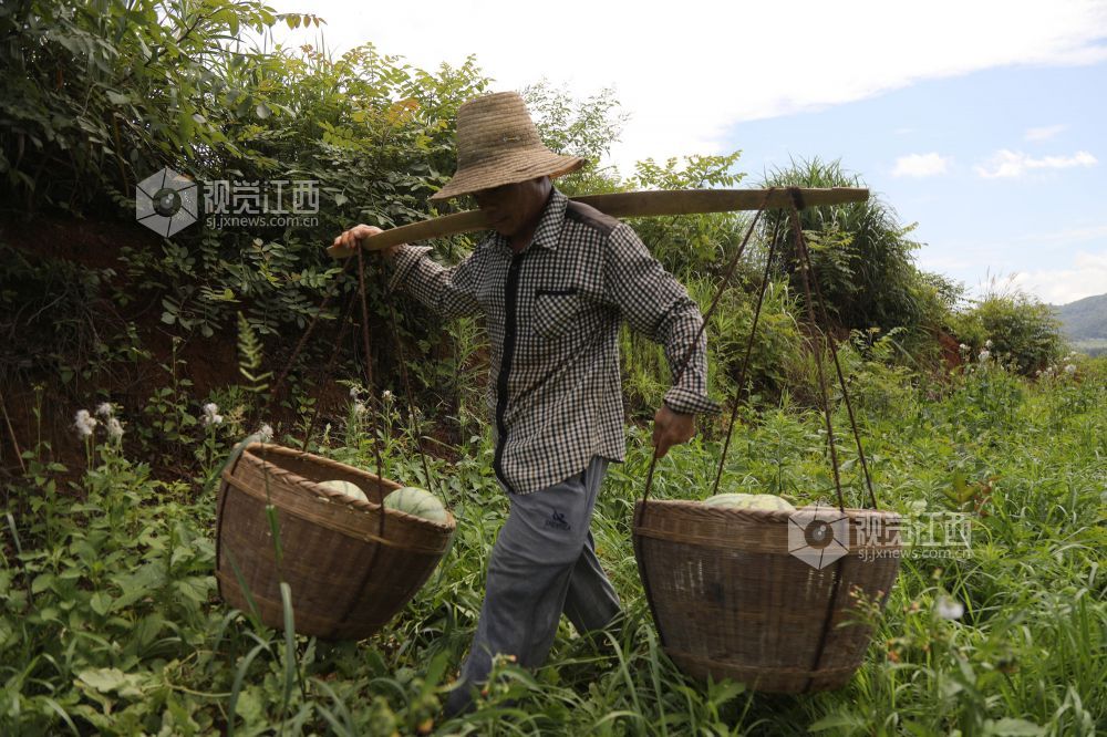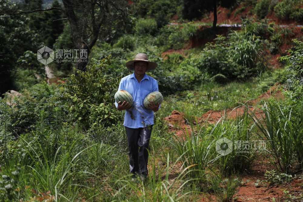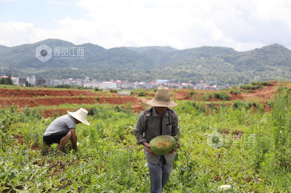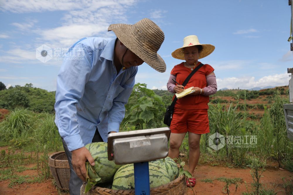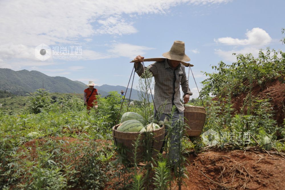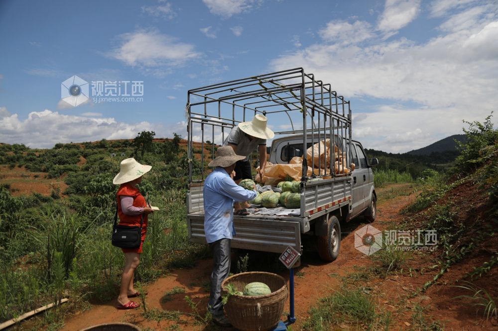 7月8日,在江西省莲花县三板桥乡三板桥村黄土岭西瓜基地,绿油油的蔓藤结满了圆滚滚的西瓜,村民正在采摘西瓜运往吉安永新销售。几年前,这里还是一片荒山,满山都是灌木、茅草。村党支部、村委会积极争得土地整理项目后,根据当地的气候条件,引来种植能手种植西瓜,由于品种优良、管理得当,今年西瓜喜获丰收,每亩可达5000斤,总产量超过100万斤,村民通过务工和流转土地获得收益40多万元。