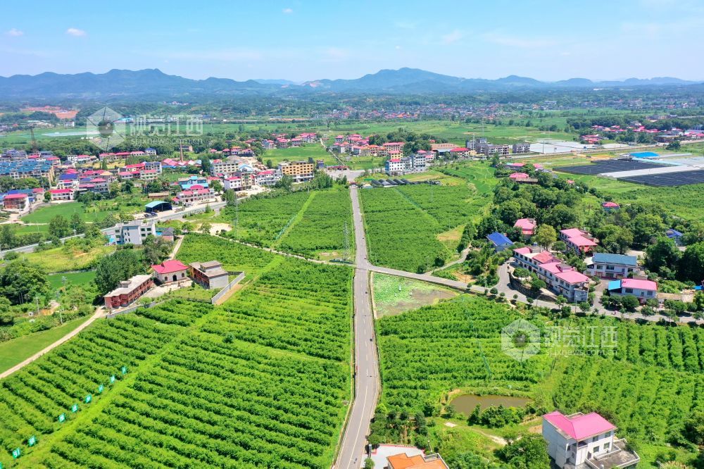 2022年7月12日,俯瞰江西省萍乡市芦溪县芦溪镇东阳村秀美乡村示范点,公路、村庄、远山、田园等交相辉映,构成一幅美丽的乡村画图。