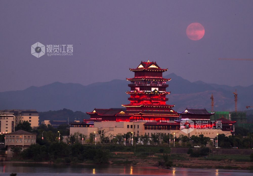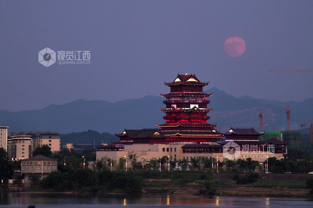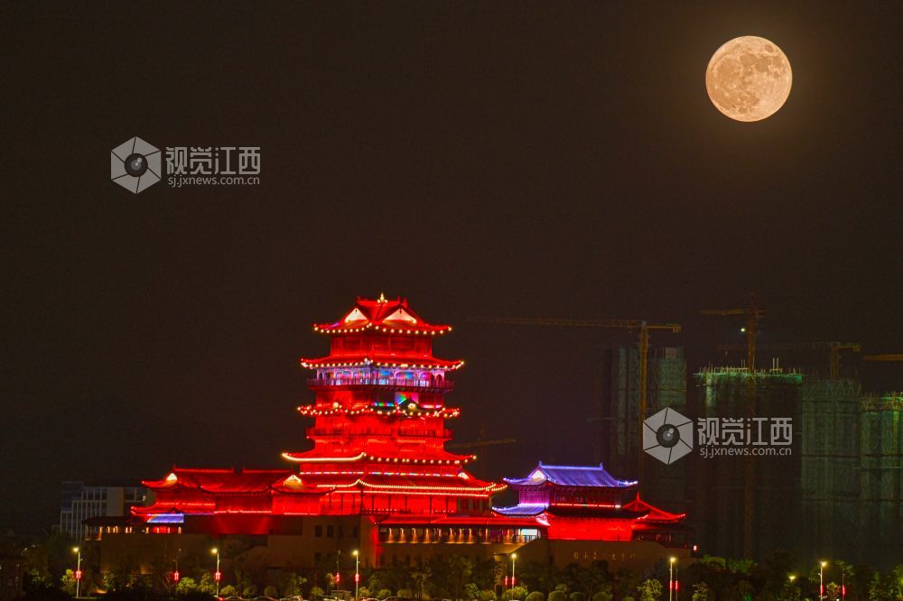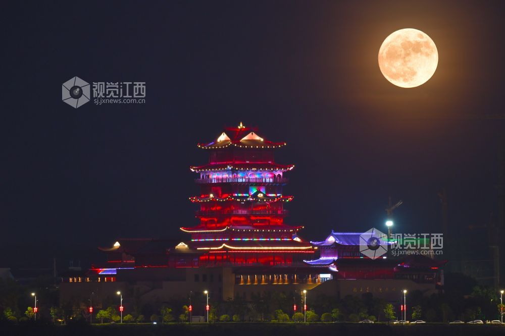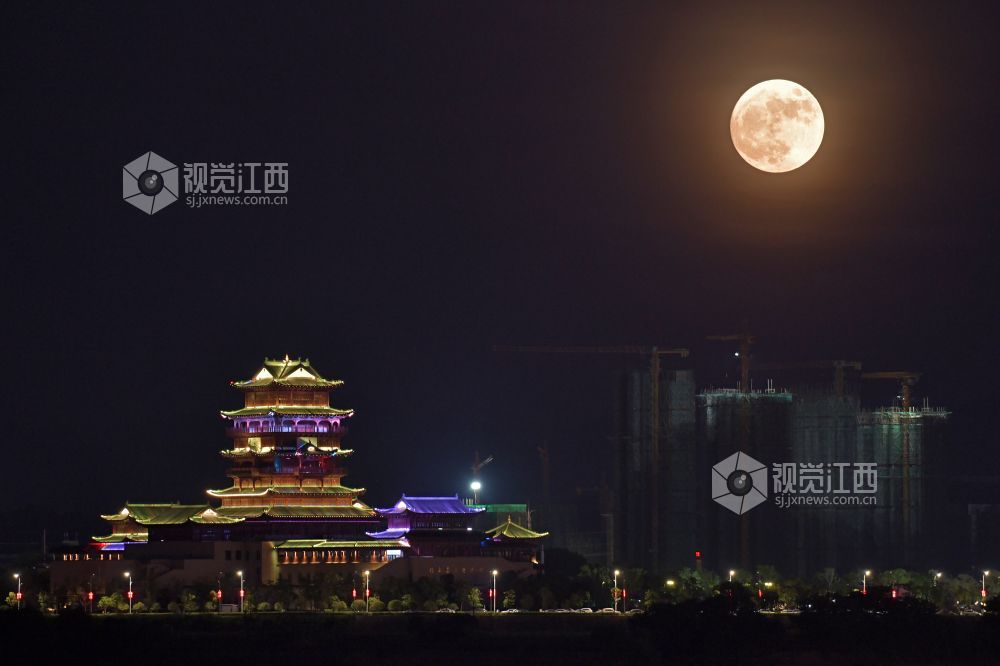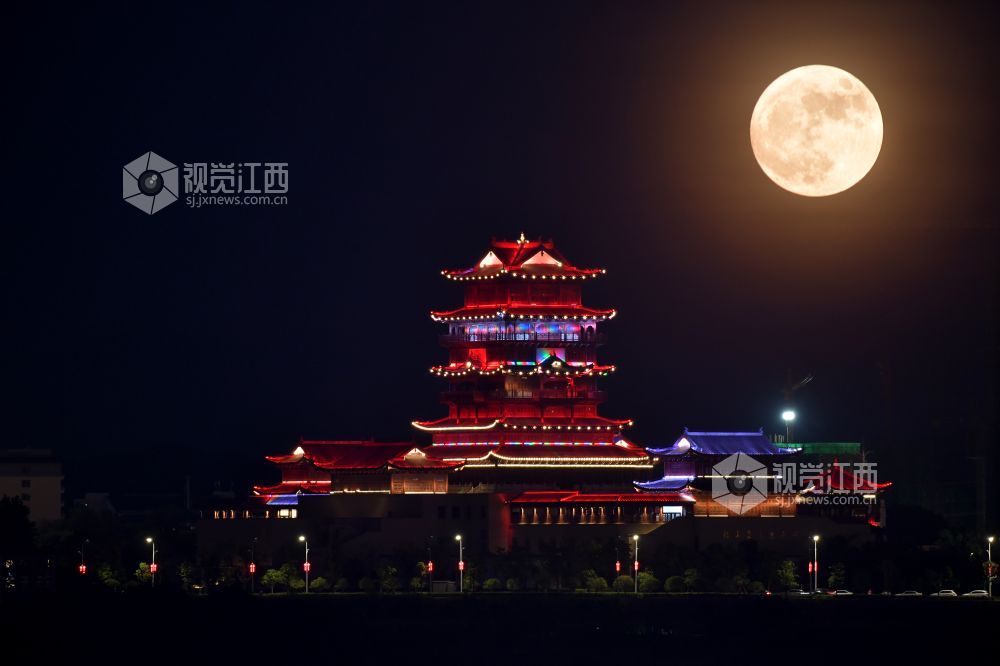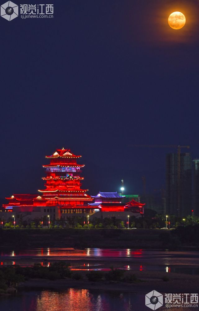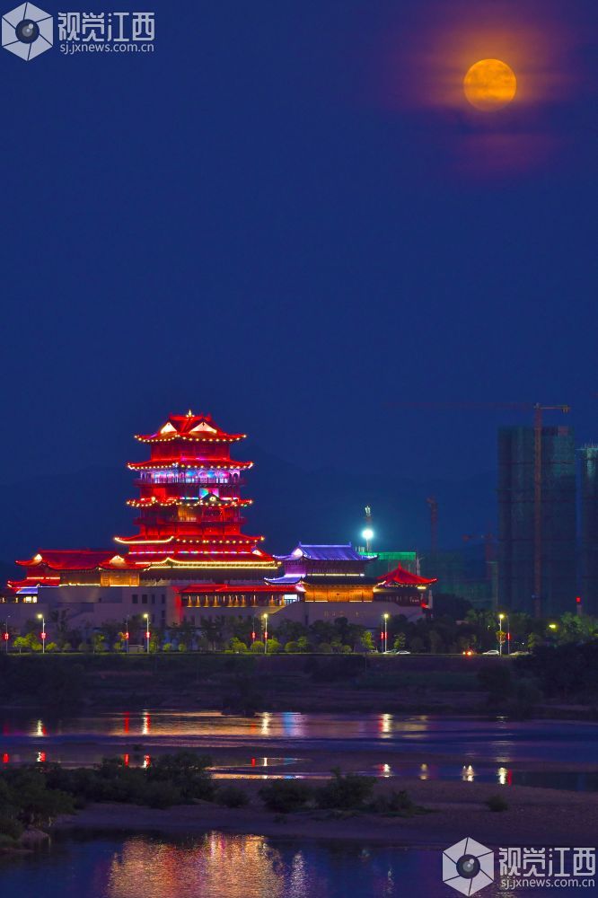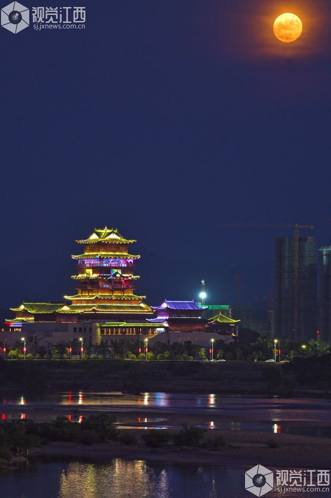2022年7月13日,在江西省上饶市铅山县河口镇武夷阁,“超级月亮”现身天空。