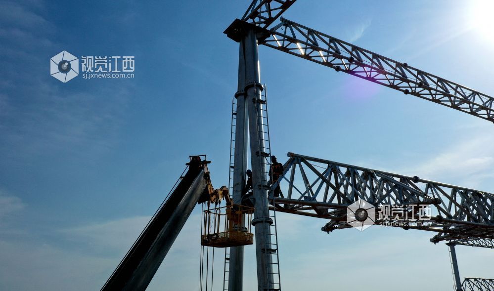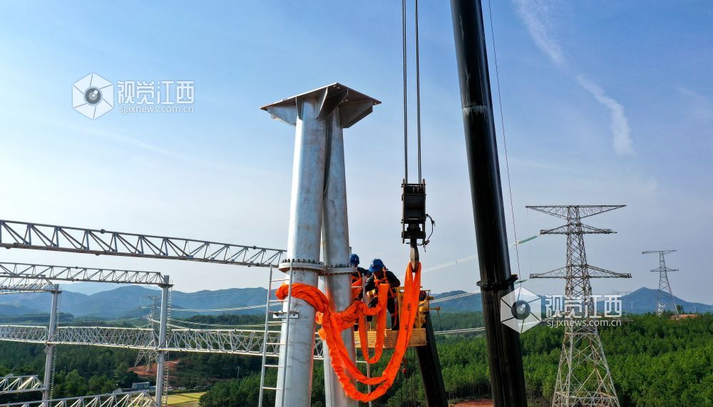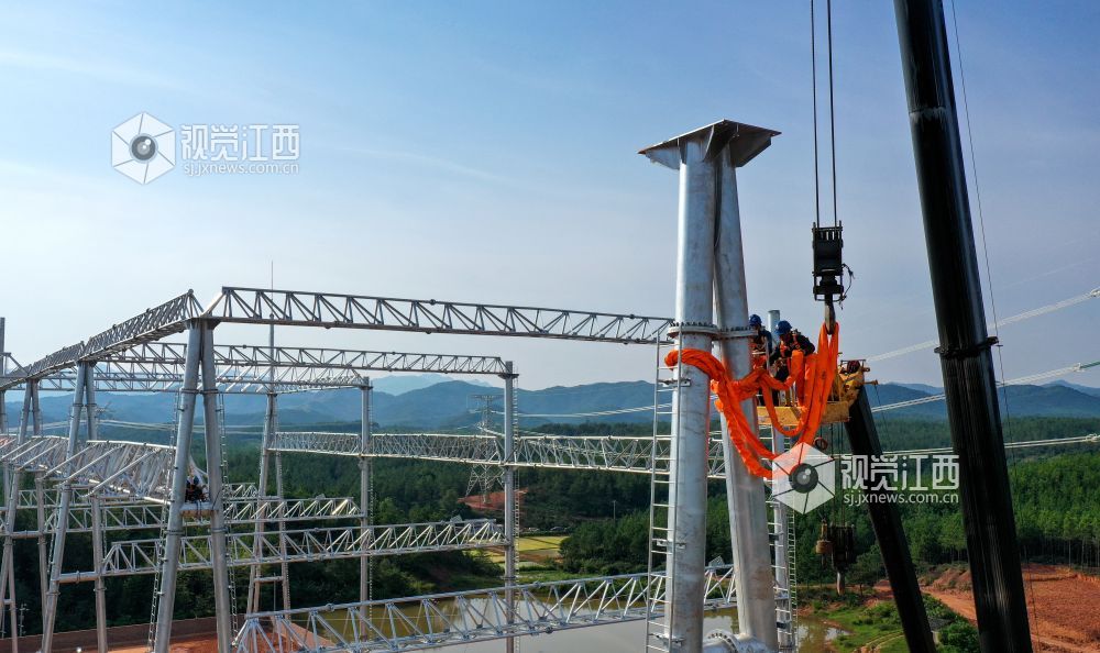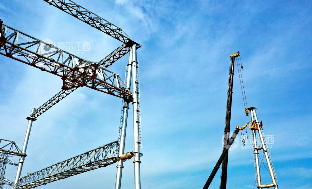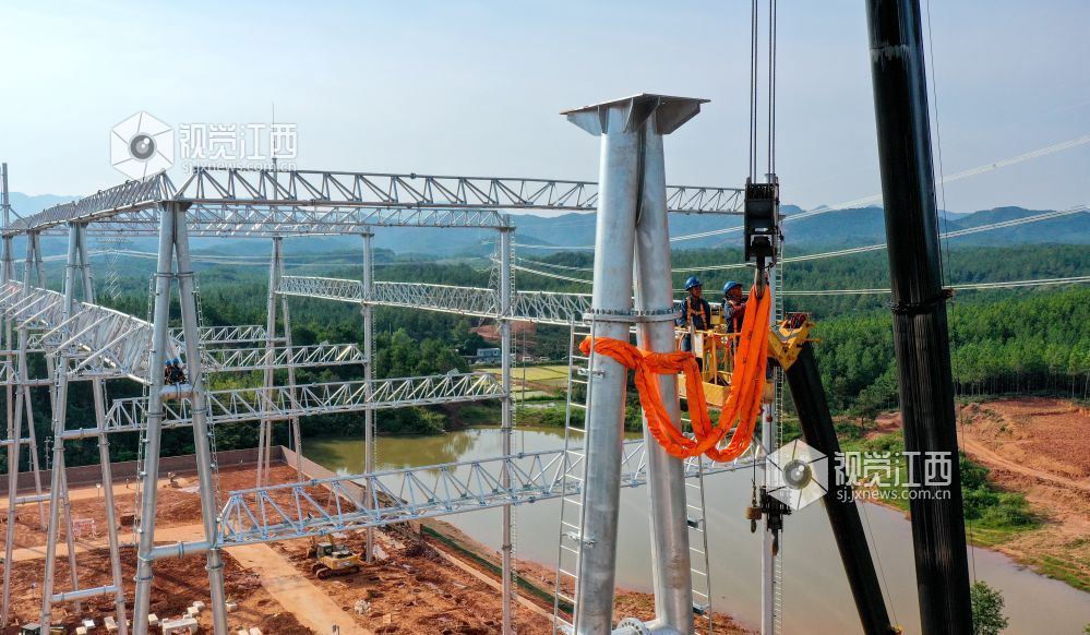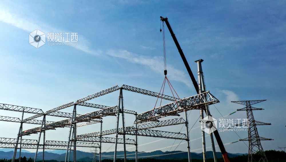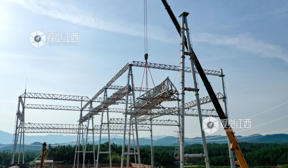2022年7月14日,江西省吉安市吉水县乌江镇吉安东500千伏变电站新建工程项目点,在做好防暑降温工作的同时,工程施工人员正在吊装变电站架梁,确保工程建设项目按时建成投运。