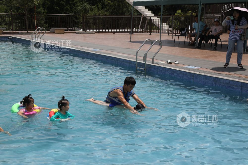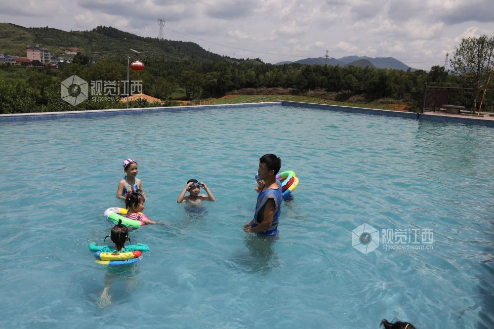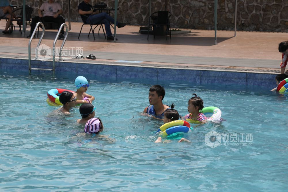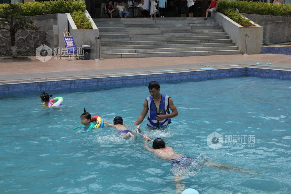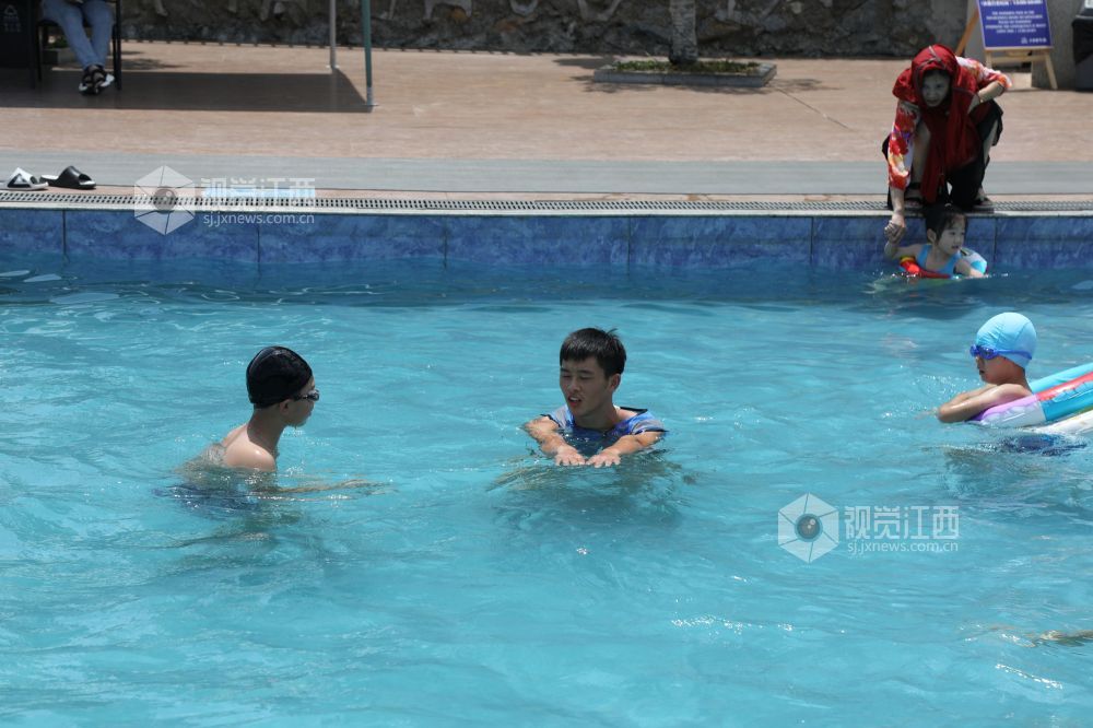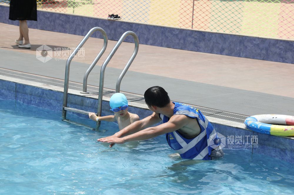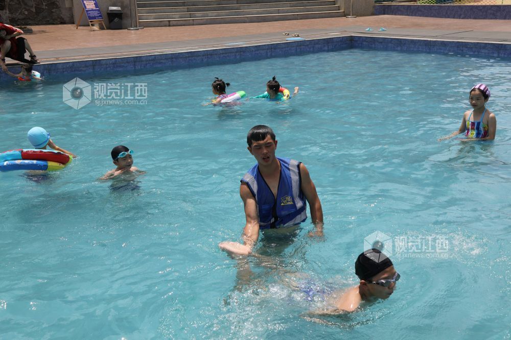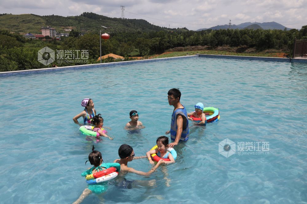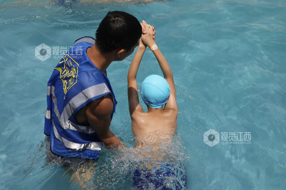 7月16日,江西省莲花县六市乡海潭村一游泳池,教练手把手指导学生学习游泳。暑假到来,莲花县教育体育局、各乡镇发动各学校并联合相关部门成立防溺水志愿者劝导队在水塘、水库、河道巡查,与此同时和各游泳场馆协商开办儿童游泳培训班,聘请教练手把手教中小学生游泳技术要领,提高他们水中自救能力,减少溺水事件的发生。