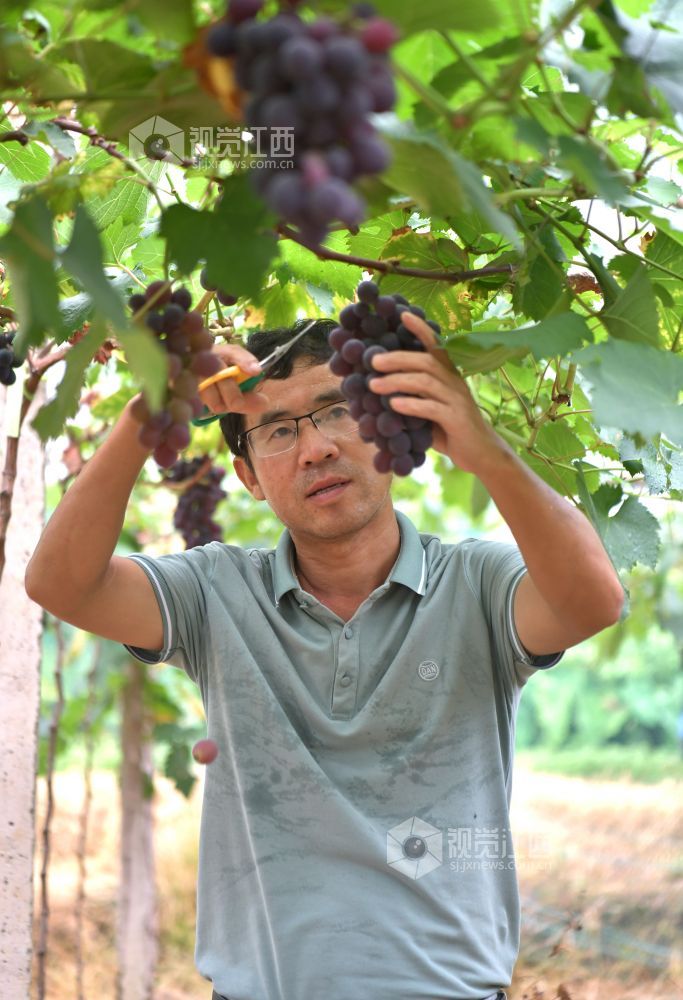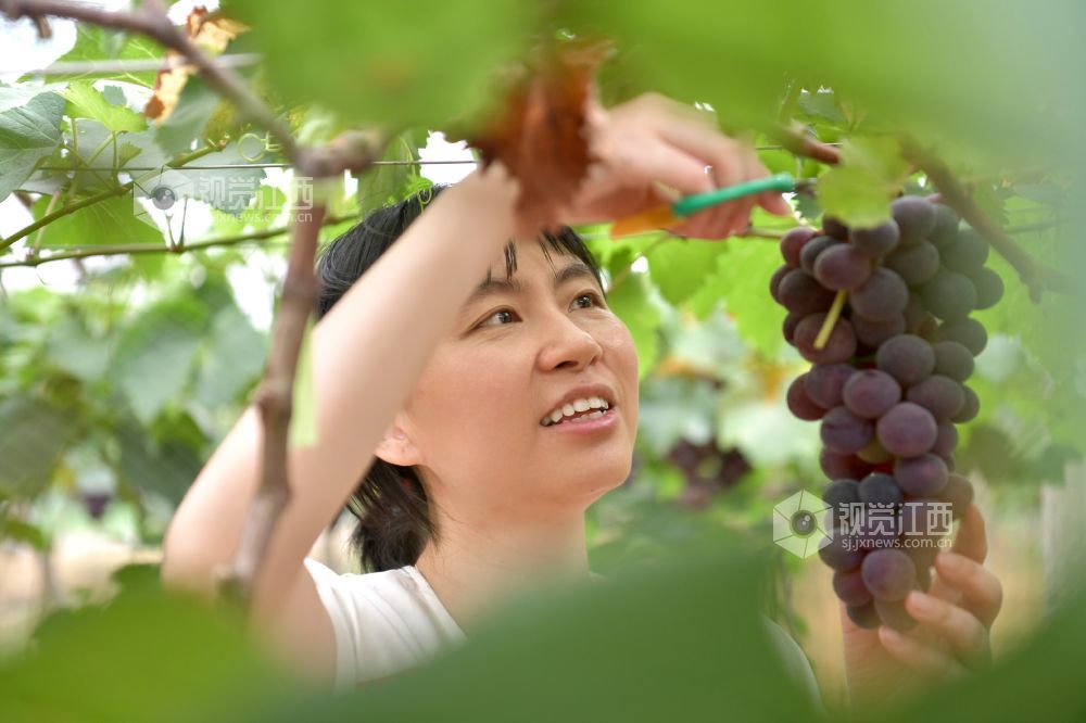 2022年7月19日,在江西省上饶市铅山县汪二镇漕源村葡萄园里,游客正在采摘葡萄。