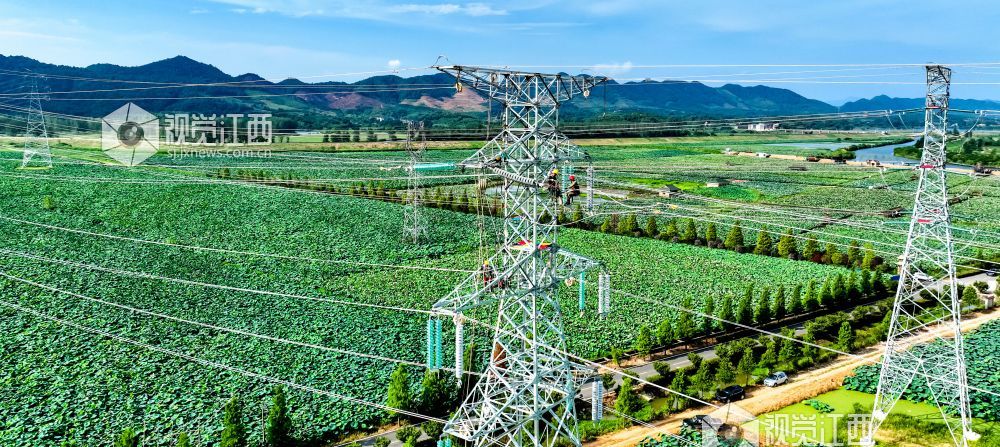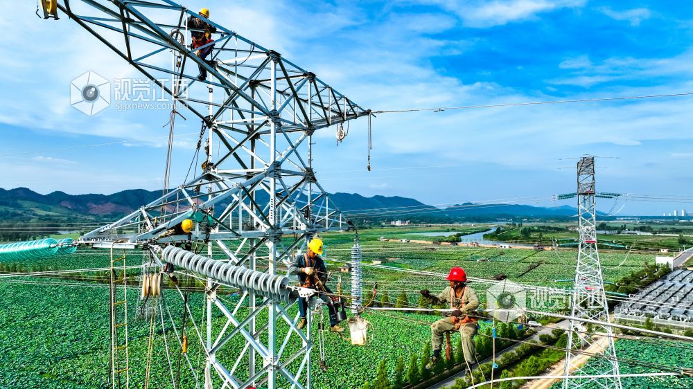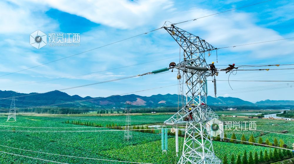 2022年7月20日,在江西省瑞昌市赛湖农场螺丝港,工人们正在新建220千伏沙赛线D66塔安装线路,为应对新一轮高温天气储电蓄能。