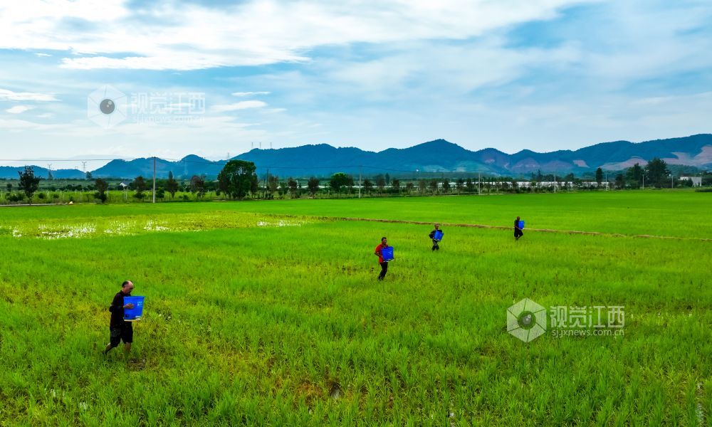 2022年7月20日,江西省瑞昌市赛湖农场,农民正在稻田施肥。