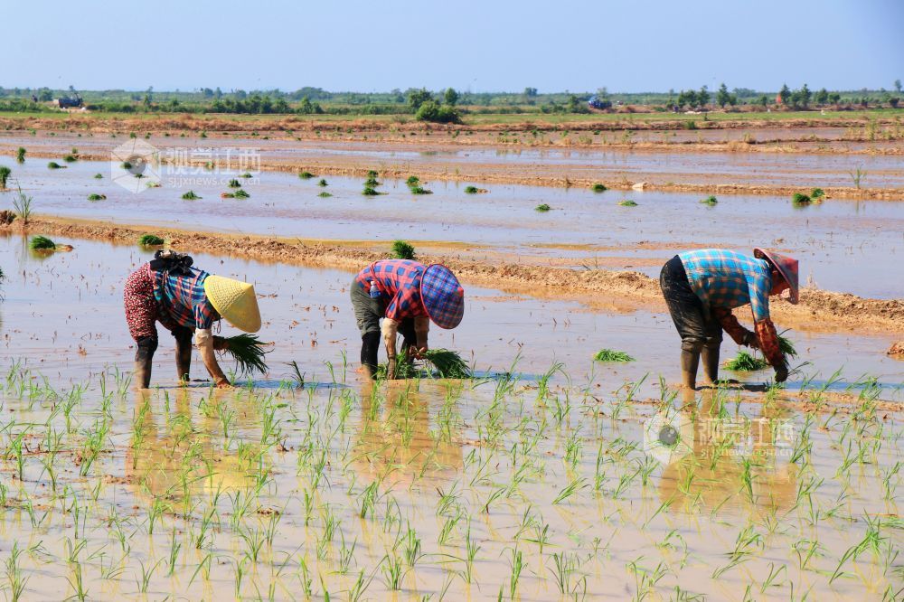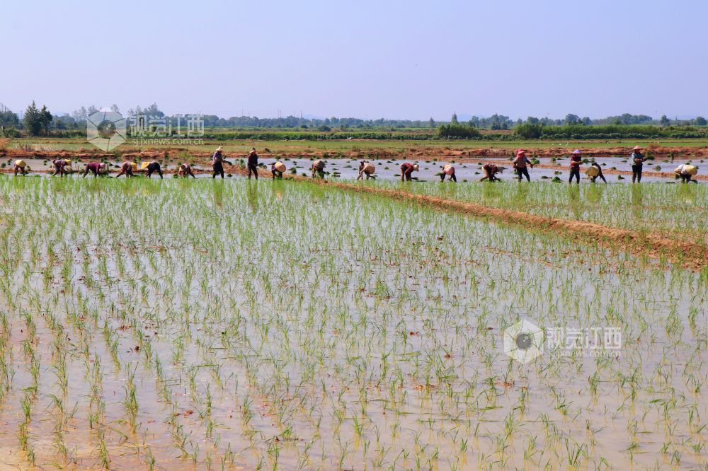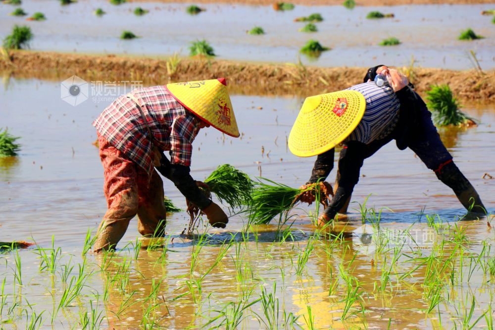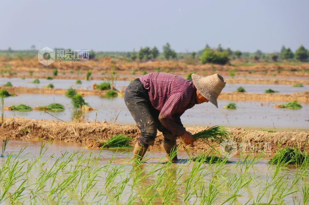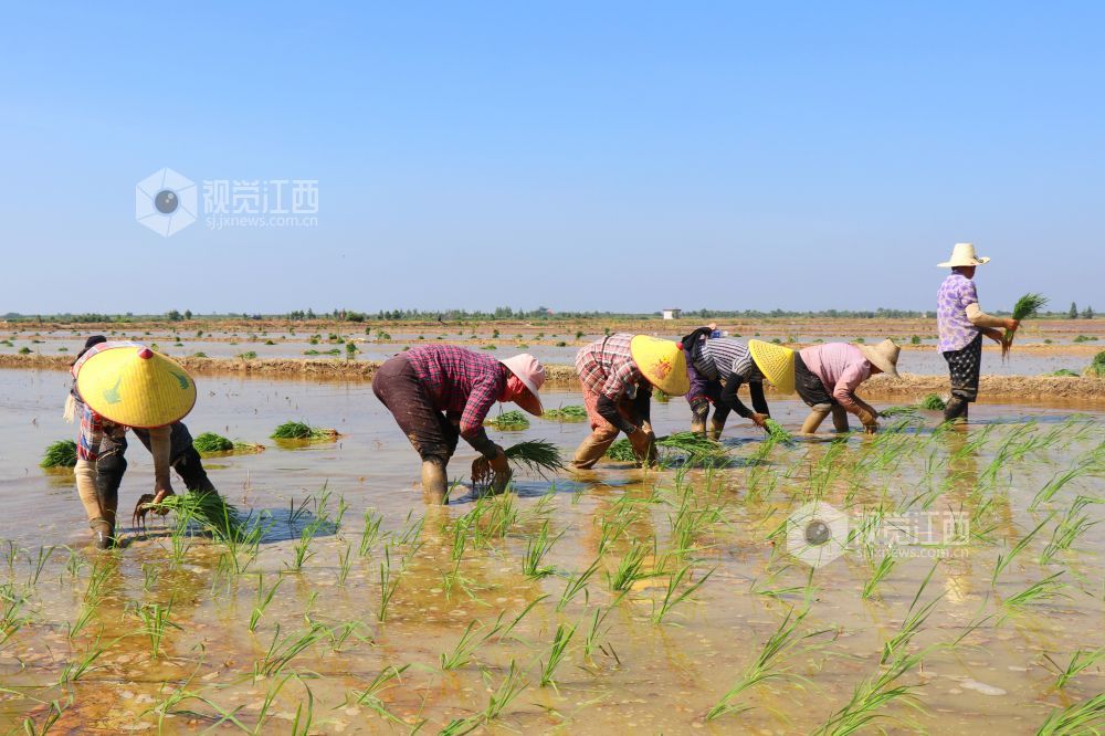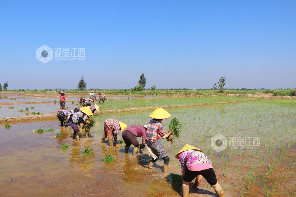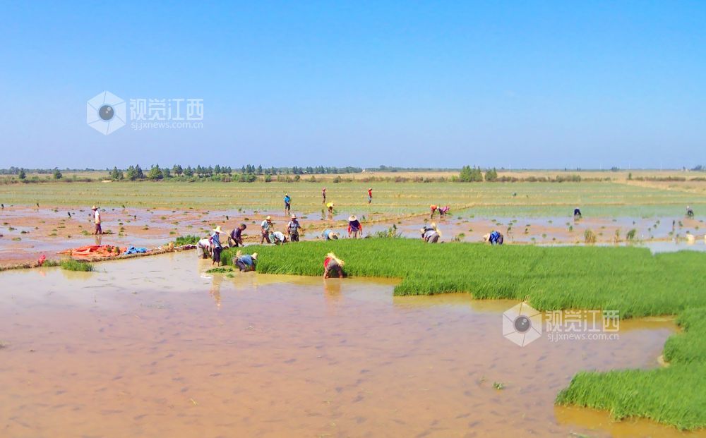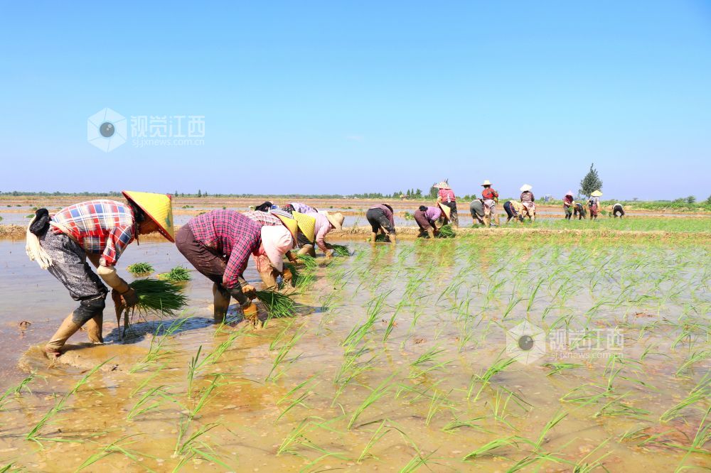 7月22日,江西省余干县康山垦殖场大湖口分场,农户们在田间忙着插秧。“双抢” 时节,当地农户冒高温、顶酷暑积极抢插晚稻秧苗,确保今夏晚稻秧苗按时完成移栽,田间地头呈现一派繁忙劳作景象。