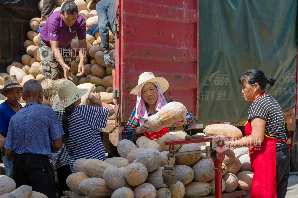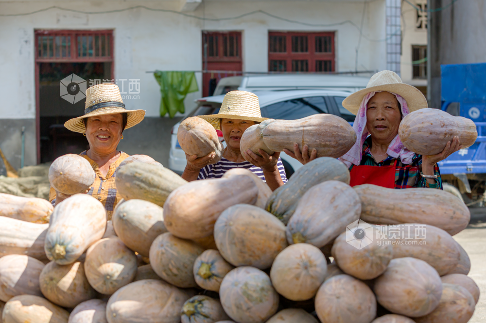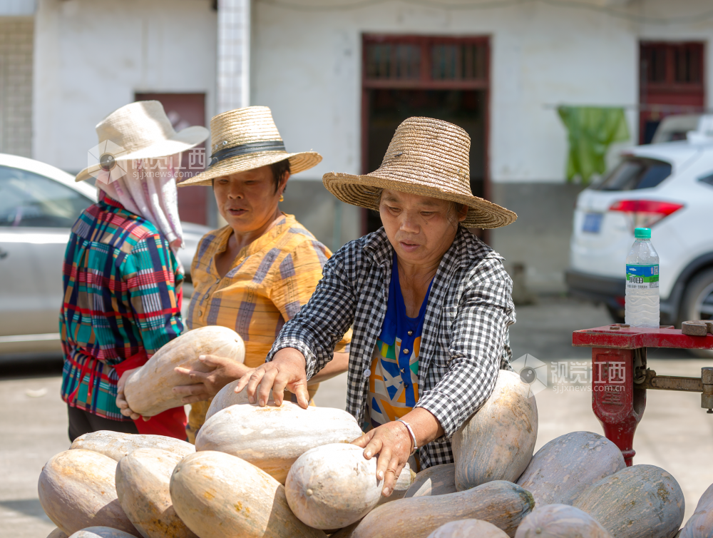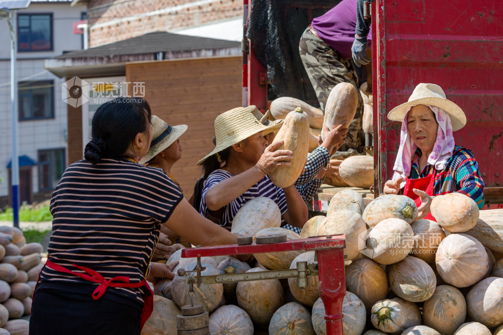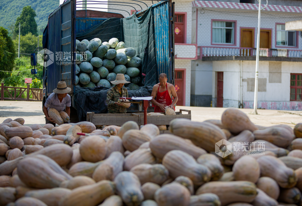 2022年7月22日,江西省分宜县洋江镇纽村村产业基地里人头攒动,村民在采摘、搬运冬瓜南瓜,呈现出一派丰收的热闹景象。