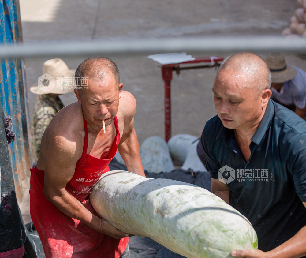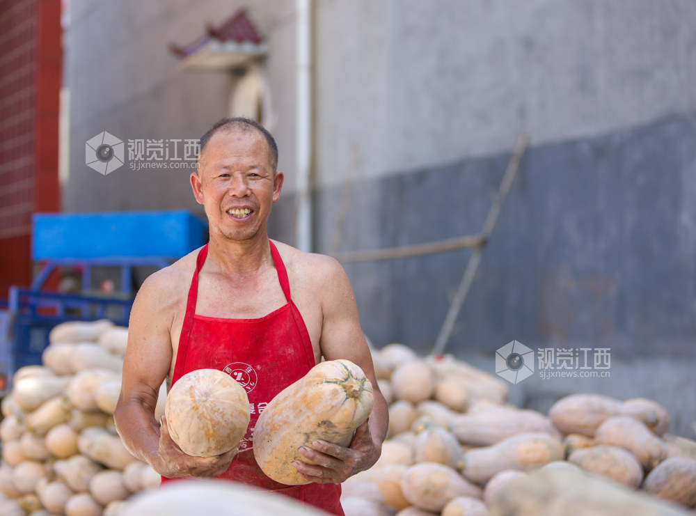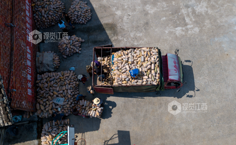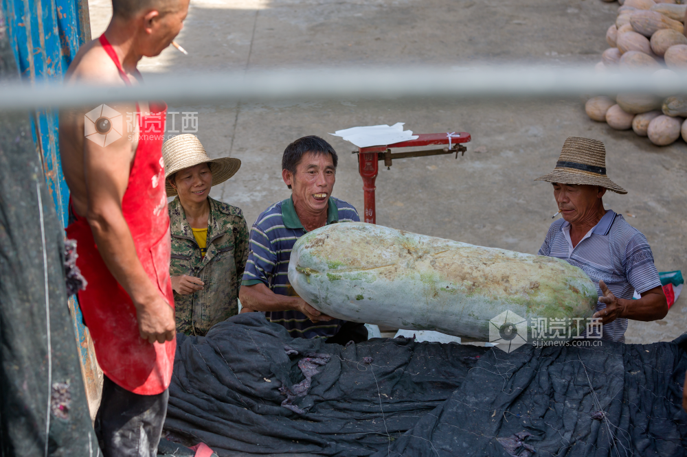 2022年7月22日,江西省分宜县洋江镇纽村村产业基地里人头攒动,村民在采摘、搬运冬瓜南瓜,呈现出一派丰收的热闹景象。